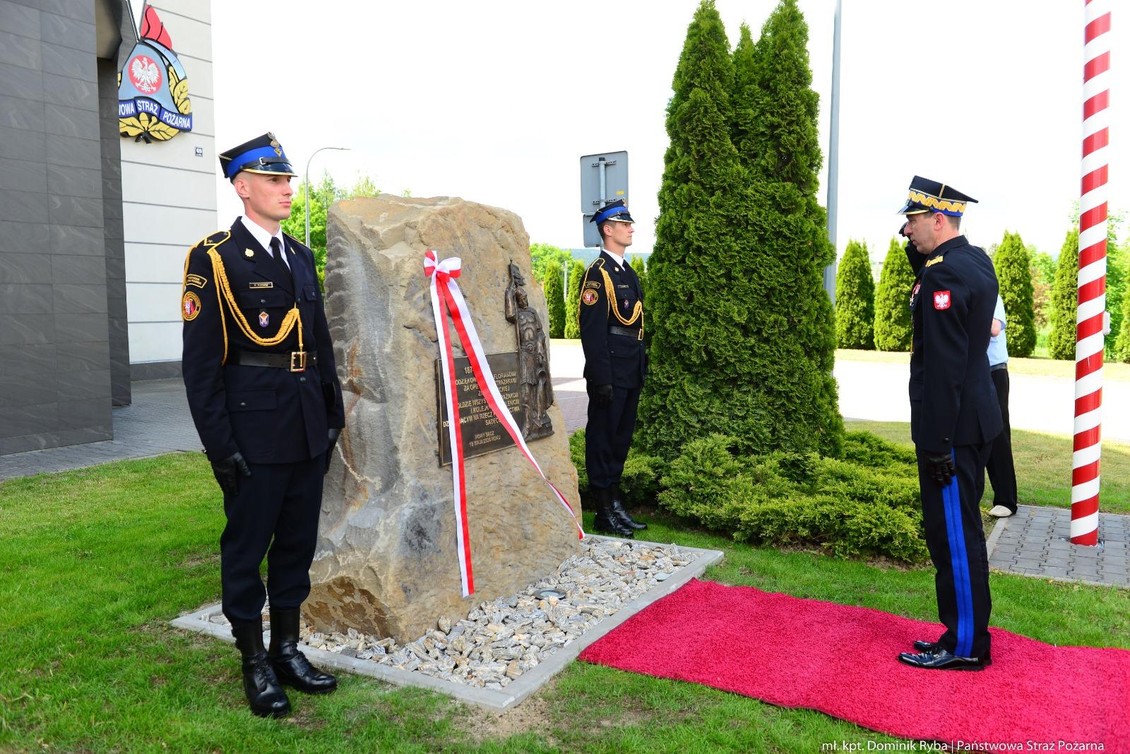 Zwieńczeniem uroczystości było odsłonięcie w Komendzie Miejskiej PSP w Nowym Sączu obelisku z wizerunkiem Świętego Floriana patrona Strażaków oraz tablicy ku czci nowosądeckich strażaków. Zaszczytu tego dostąpili komendant główny PSP nadbryg. dr inż. Mariusz Feltynowski, małopolski komendant wojewódzki PSP bryg. Przemysław Przęczek, komendant miejski PSP w Nowym Sączu st. bryg. Paweł Motyka, prezes Zarządu Oddziału Wojewódzkiego ZOSP RP woj. małopolskiego dh Edward Siarka oraz wiceprezes Zarządu Oddziału Powiatowego ZOSP RP w Nowym Sączu dh Teodor Gargas.