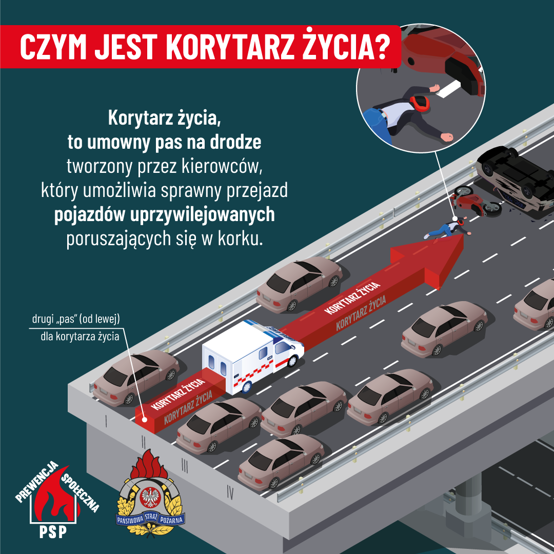 - Pamiętaj o zasadzie prawej ręki – Na drogach dwupasmowych w Polsce zasada tworzenia korytarza życia jest prosta: samochody z lewego pasa zjeżdżają w lewo, a te z prawego pasa - w prawo. Na drogach o większej ilości pasów, na lewo zjeżdżają kierowcy z lewego pasa, pozostali - na prawo, zgodnie z zasadą prawej ręki. Znajomość tych zasad i ich przestrzeganie, to podstawa bezpieczeństwa na drodze.
