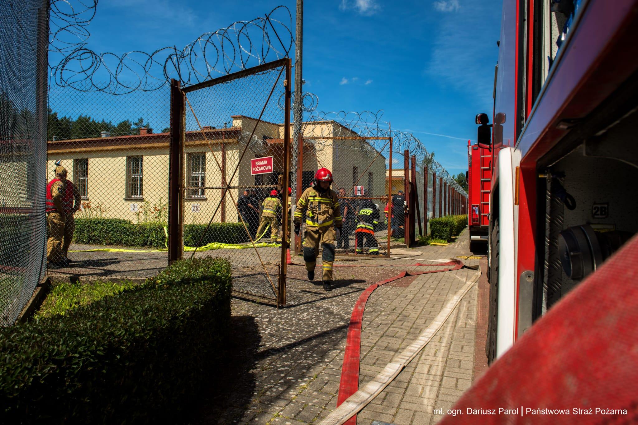 Ogniem zagrożone są obiekty zakładu karnego, sąsiadującego z pożarzyskiem. Ratownicy budują magistralę wodną w obronie budynków, jednocześnie nacierając na palący się oddział leśny.