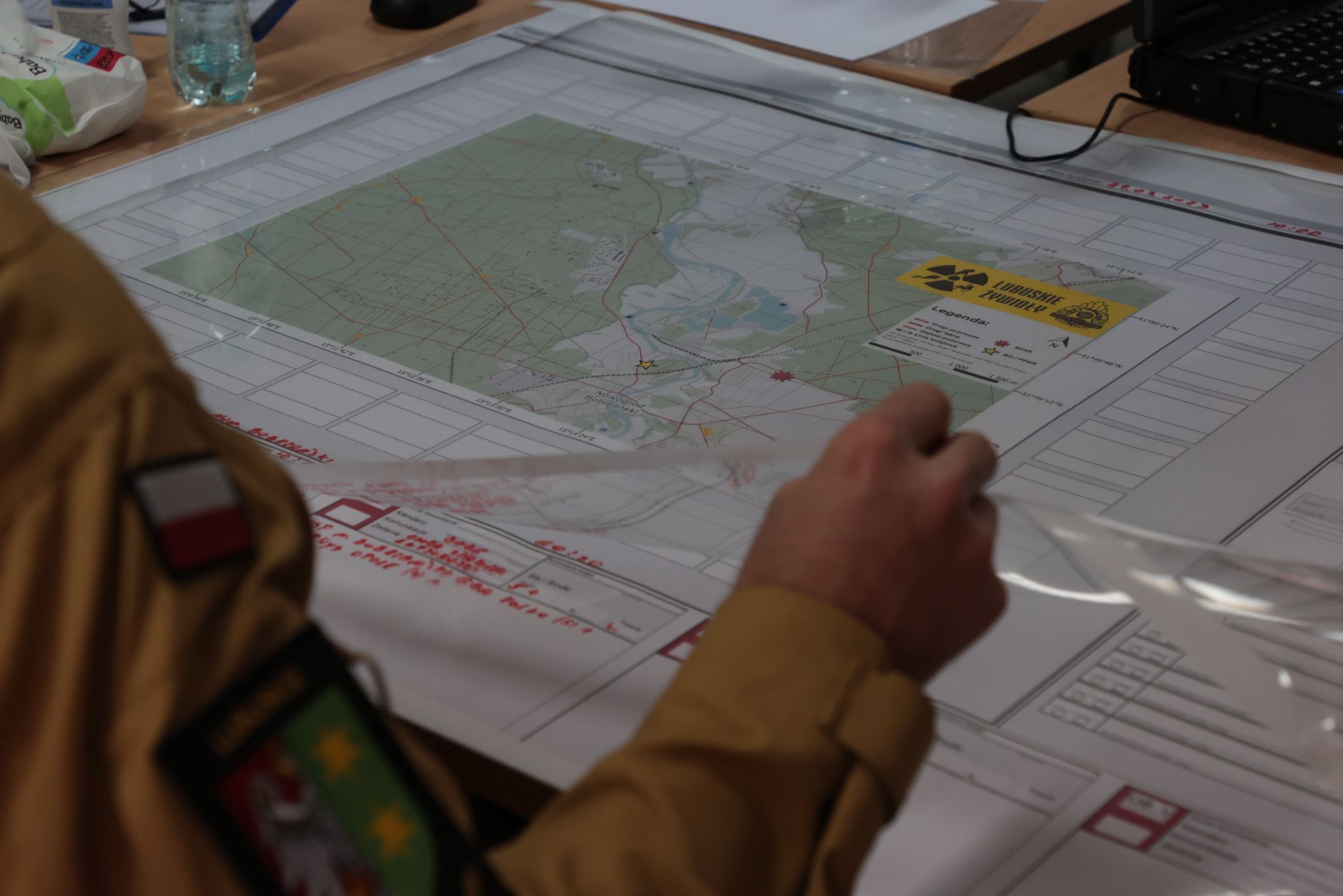 Zgodnie z realizacją scenariusza ćwiczeń, po wydaniu decyzji lubuskiego komendanta wojewódzkiego PSP o godz. 14.30 rozpoczął pracę sztab zarządzający zdarzeniem. Celem pracy sztabu jest neutralizacja znalezionych na terenie poniemieckiej fabryki broni i amunicji w pobliżu Nowogrodu Bobrzańskiego materiałów niebezpiecznych, w postaci niezidentyfikowanych substancji zmagazynowanych w 2 mogilnikach. Podczas spotkania zespołu sztabowego omówiono zaistniałą sytuację, zaprezentowano możliwości poszczególnych służb i instytucji realizujących zadanie oraz podjęto decyzję w sprawie dalszych działań.