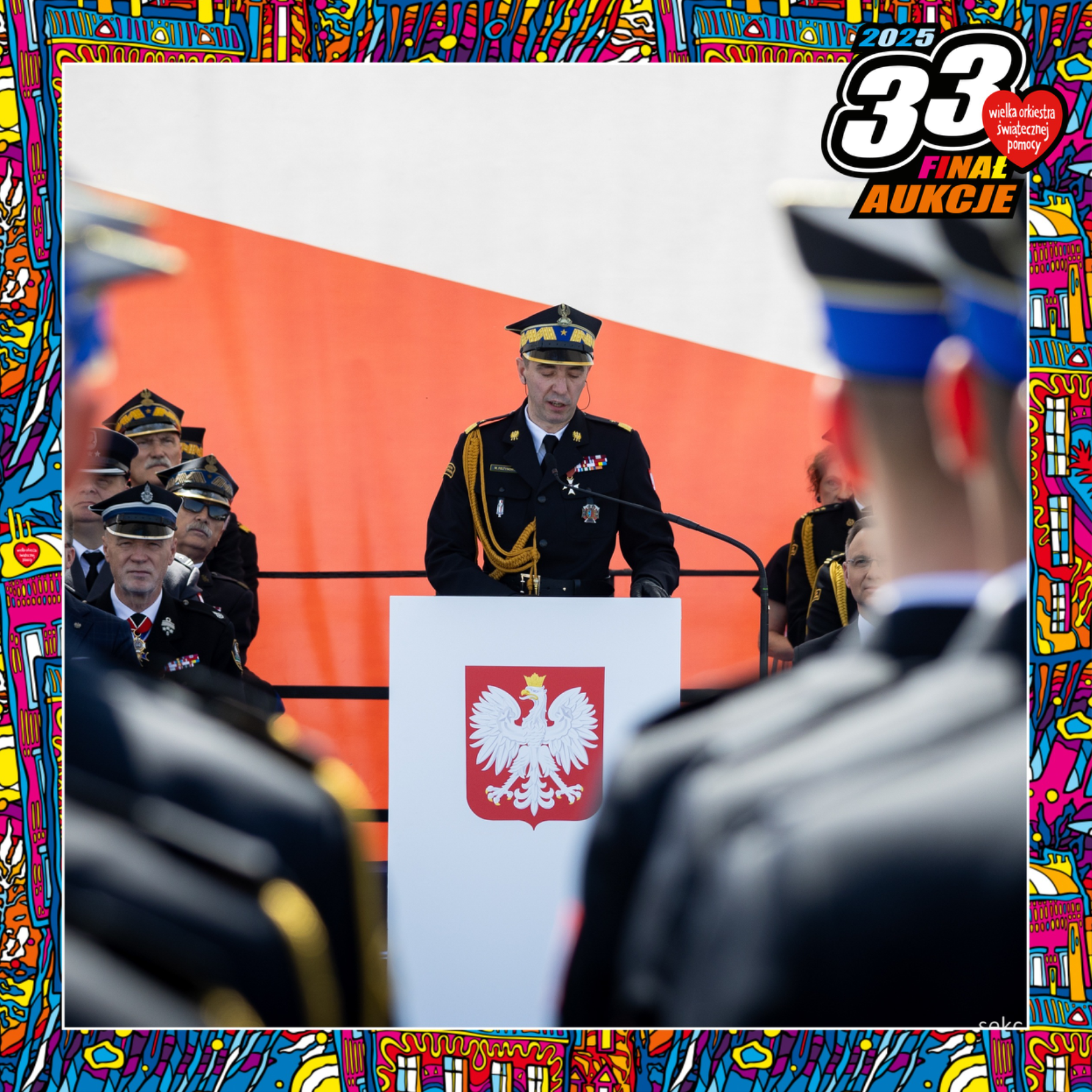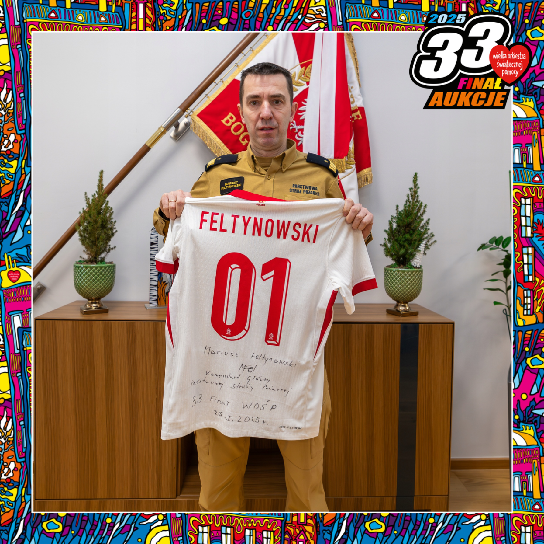 Komendant Główny Państwowej Straży Pożarnej nadbryg. dr inż. Mariusz Feltynowski przekazuje na aukcję pamiątkową imienną koszulkę z autografem oraz imienny kalendarz na rok 2025.