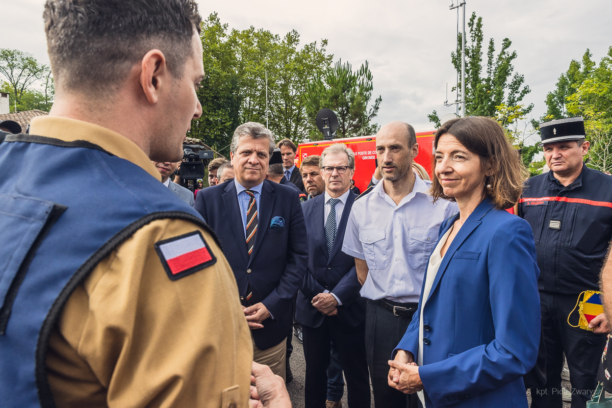 Dziś pracujących w okolicach Hostens strażaków odwiedziła Pani Laurence Boone sekretarz stanu ds. Europy z Republiki Francji. Podczas spotania przekazała naszym ratownikom słowa podziękowań za zaangażowanie w walkę z pożarem. Obozowisko grupy GFFFV Poland oraz bazę operacji polskiego modułu, odwiedził dziś również ambasador nadzwyczajny i pełnomocny RP w Republice Francuskiej oraz Księstwie Monako, Pan Jan Emeryk Rościszewski. Na miejscu miał możliwość bezpośredniego zapoznania się z warunkami stacjonowania i działania polskich strażaków.