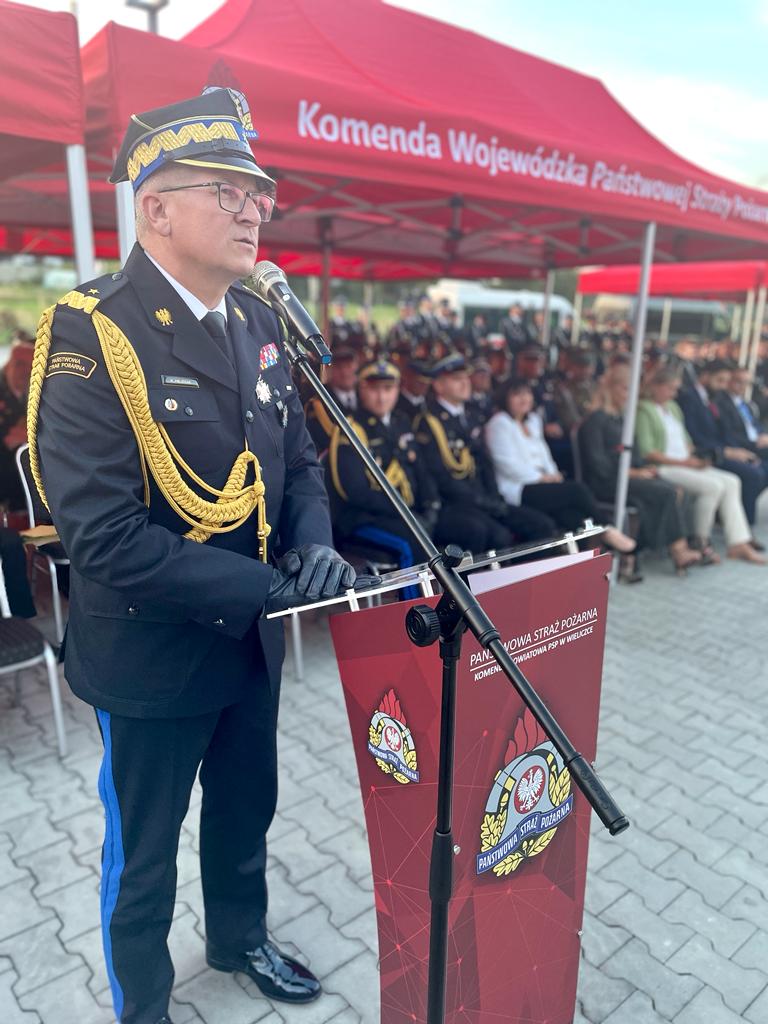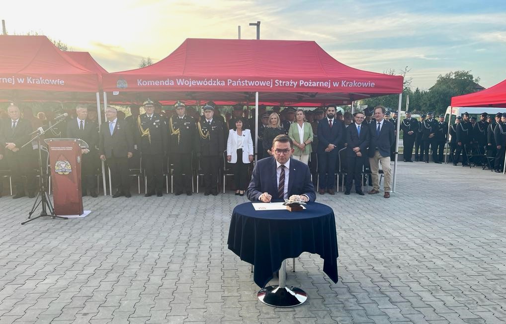 Komendant powiatowy PSP w Wieliczce mł. bryg. Leszek Kasiński odebrał uroczyście „Akt przekazania” z rąk Pana Łukasza Kmity wojewody małopolskiego oraz nadbryg. Krzysztofa Hejduka zastępcy komendanta głównego PSP i nadbryg. Piotra Filipka małopolskiego komendanta wojewódzkiego PSP.