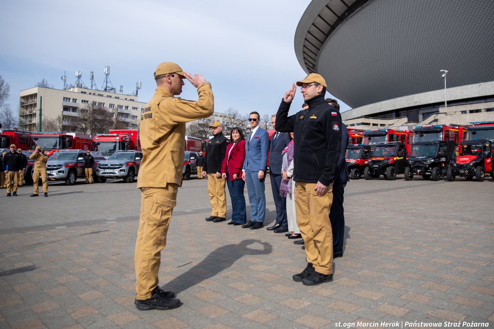 10 marca 2026 r. w Katowicach odbyło się przekazanie samochodów ratowniczo-gaśniczych oraz sprzętu pożarniczego zakupionego w 2025 r. w ramach Programu Ochrony Ludności i Obrony Cywilnej dla jednostek Państwowej Straży Pożarnej województwa śląskiego.
