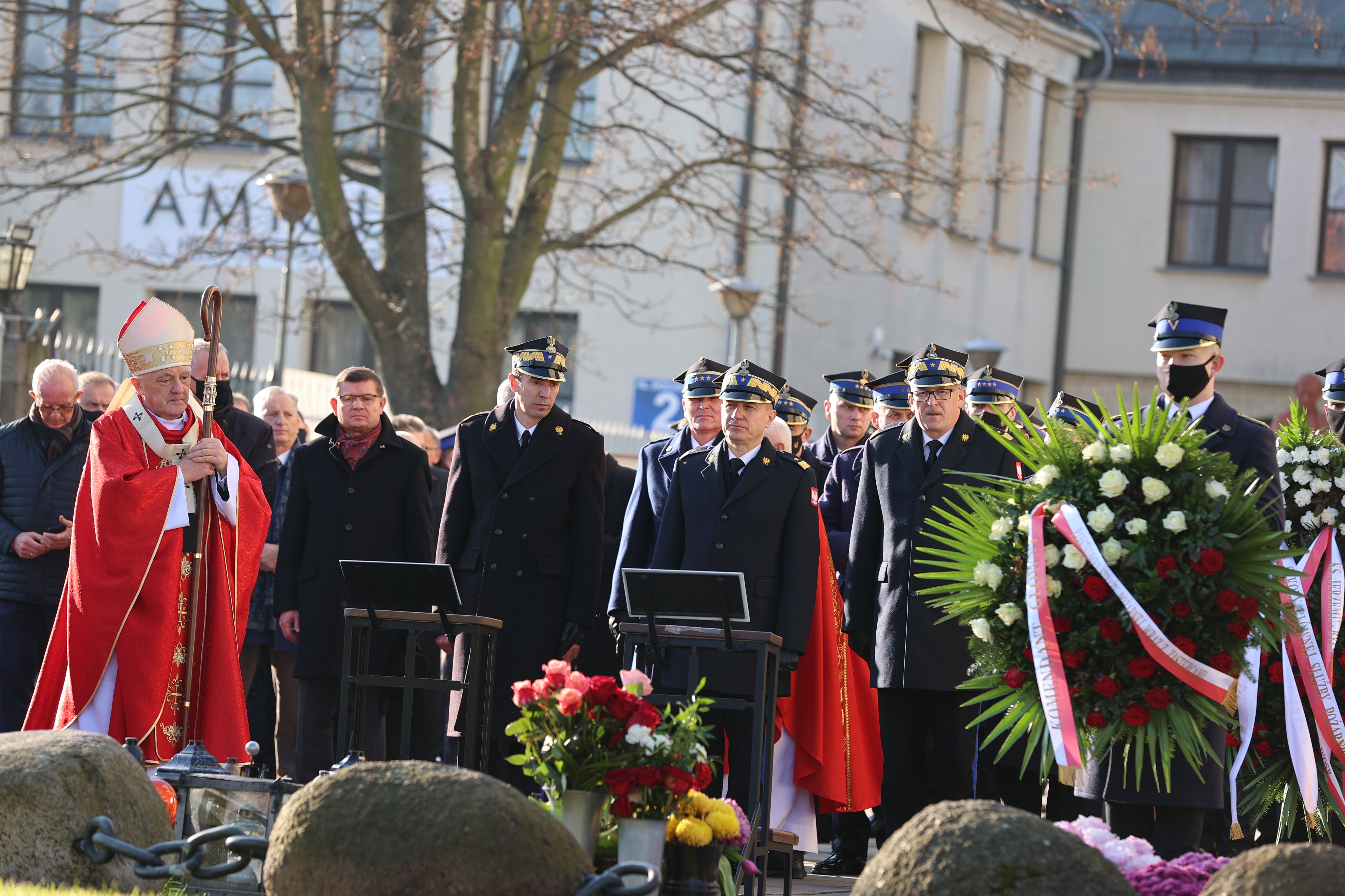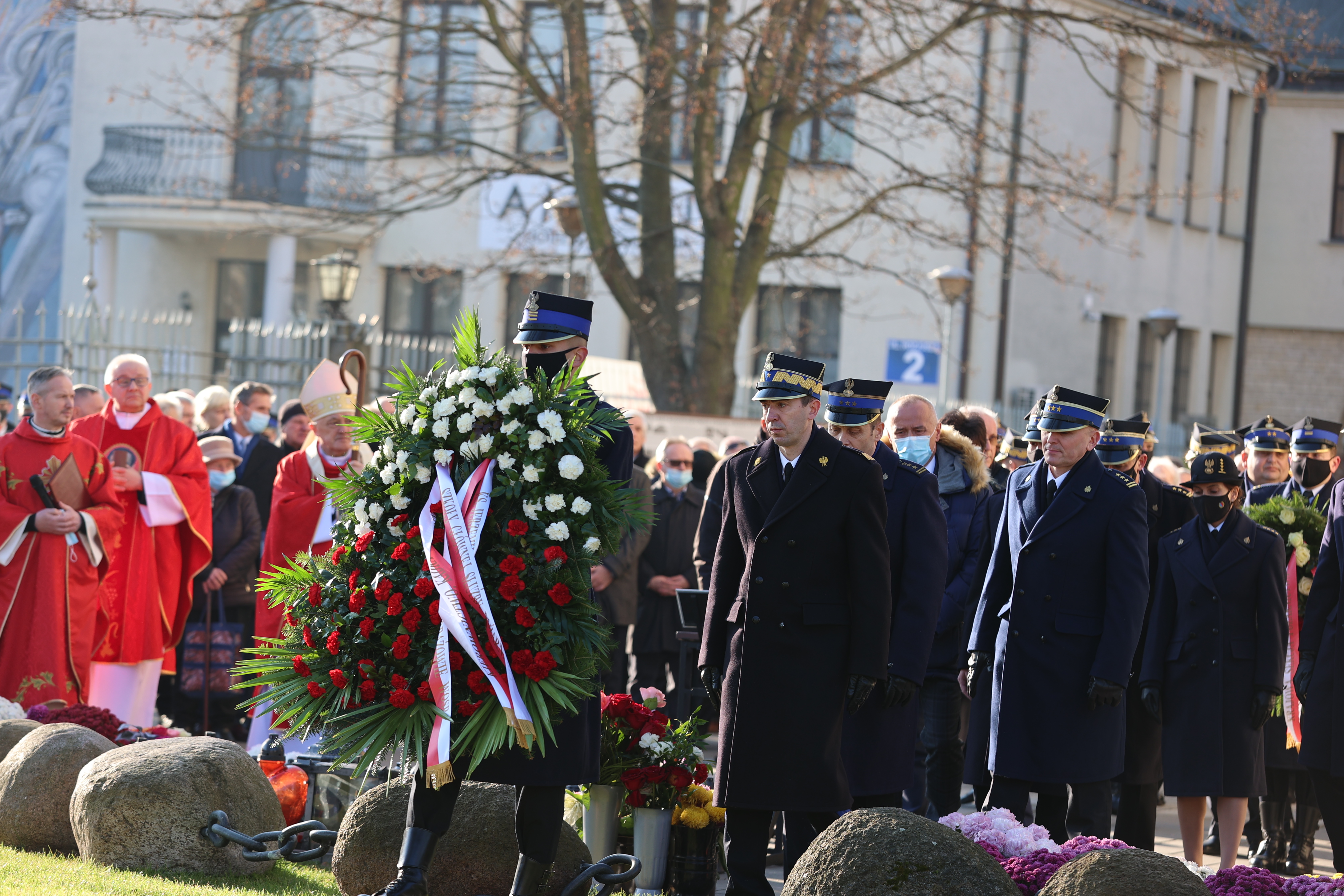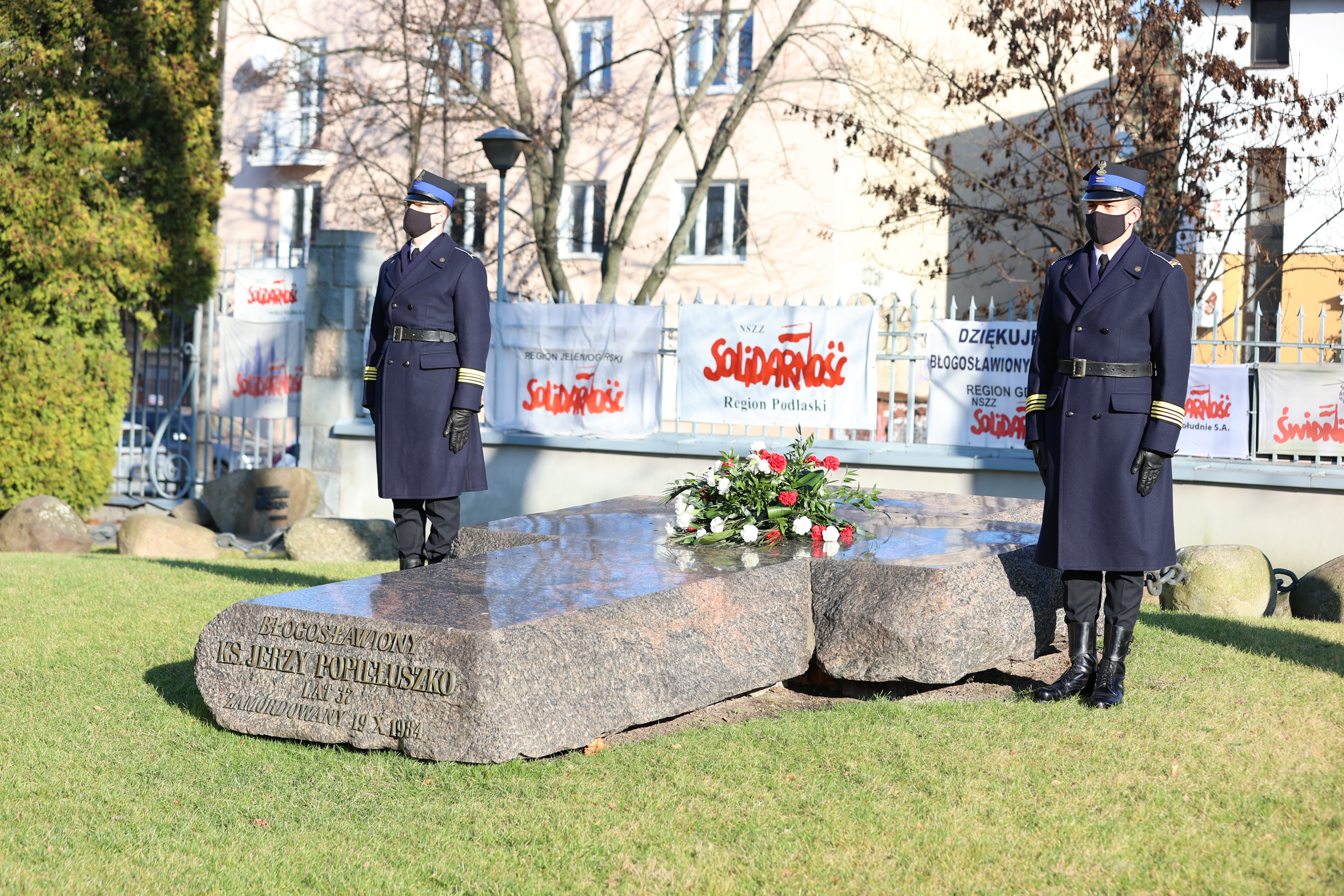 Wyrażając szacunek do tamtych wydarzeń, delegacje złożyły również wieniec pod tablicami upamiętniającymi strajk oraz postać bł. ks. Jerzego Popiełuszki, które znajdują się przy wejściu do uczelni od ul. Juliusza Słowackiego. W trakcie składania kwiatów w hołdzie bohaterom wydarzeń włączono sygnały świetlne i dźwiękowe w samochodach szkolnej jednostki ratowniczo – gaśniczej.