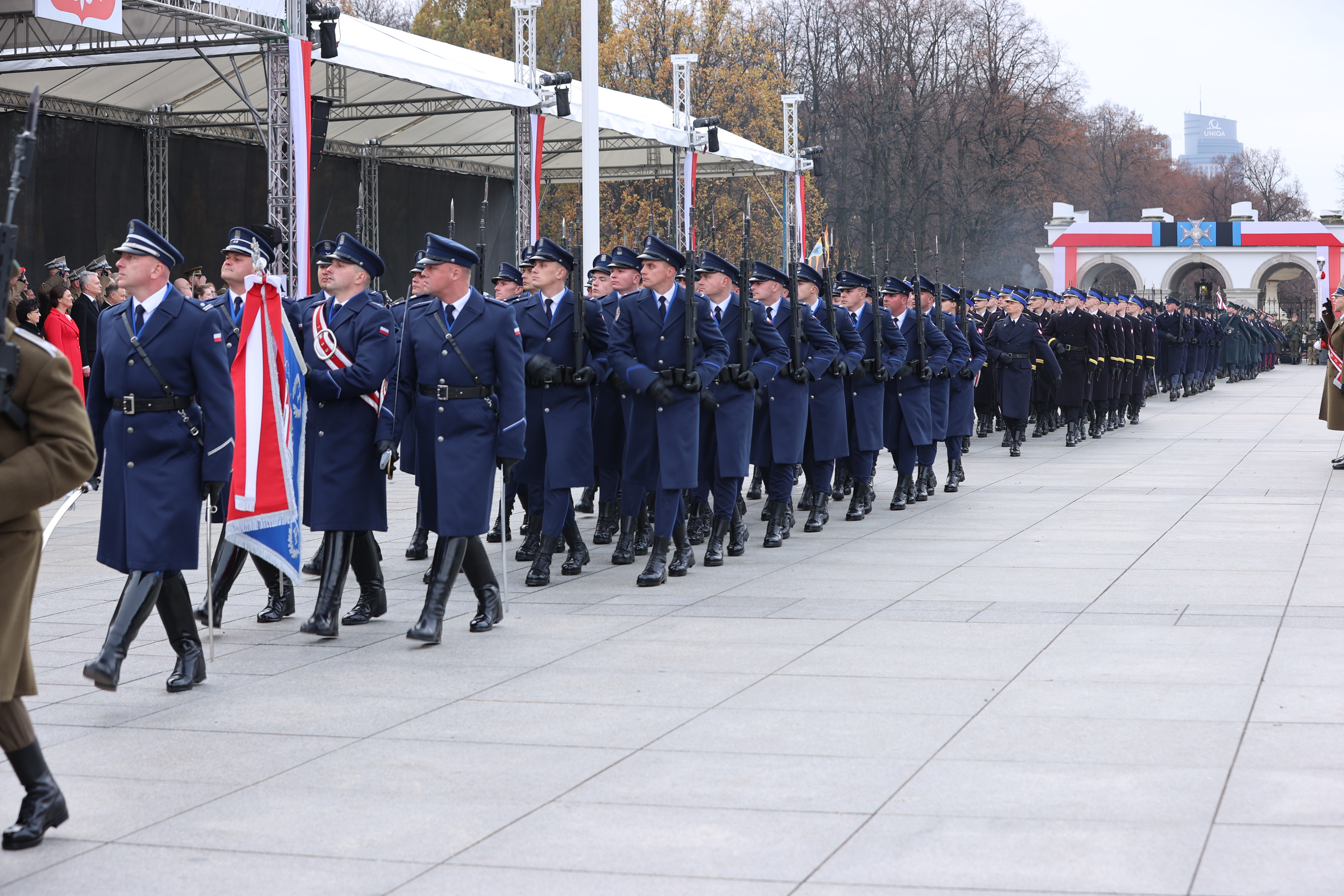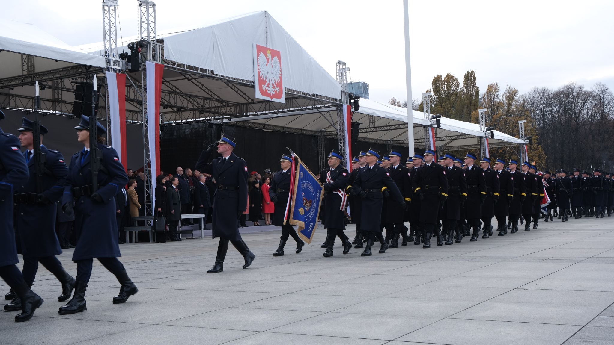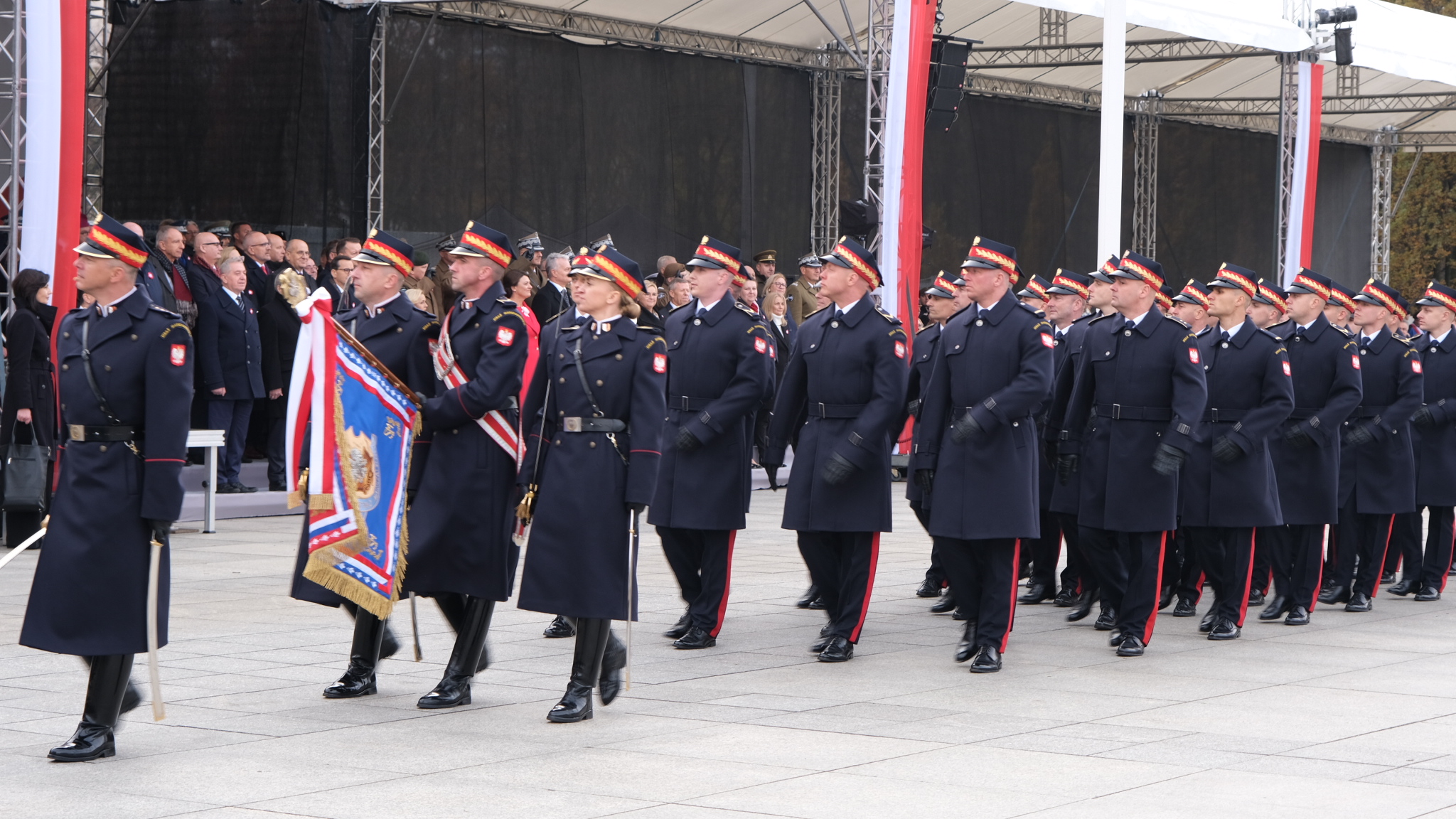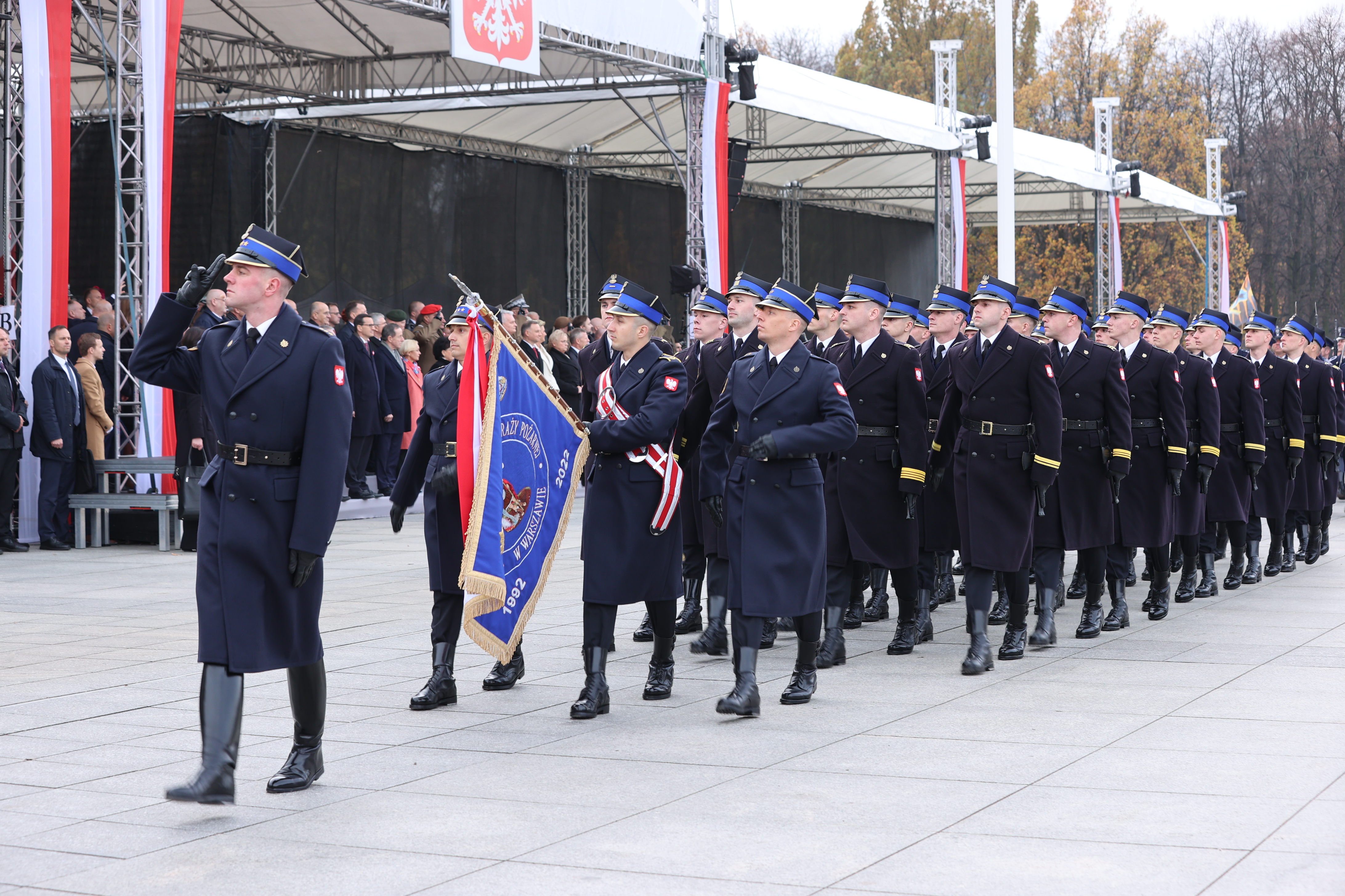 a także odśpiewano hymn RP. Następnie został odczytany Apel Pamięci oraz oddany salut narodowy z 21 salw armatnich. Później odbyła się uroczysta odprawa wart. Swoje pododdziały wystawiły służby podległe MSWiA w tym Państwowa Straż Pożarna.
