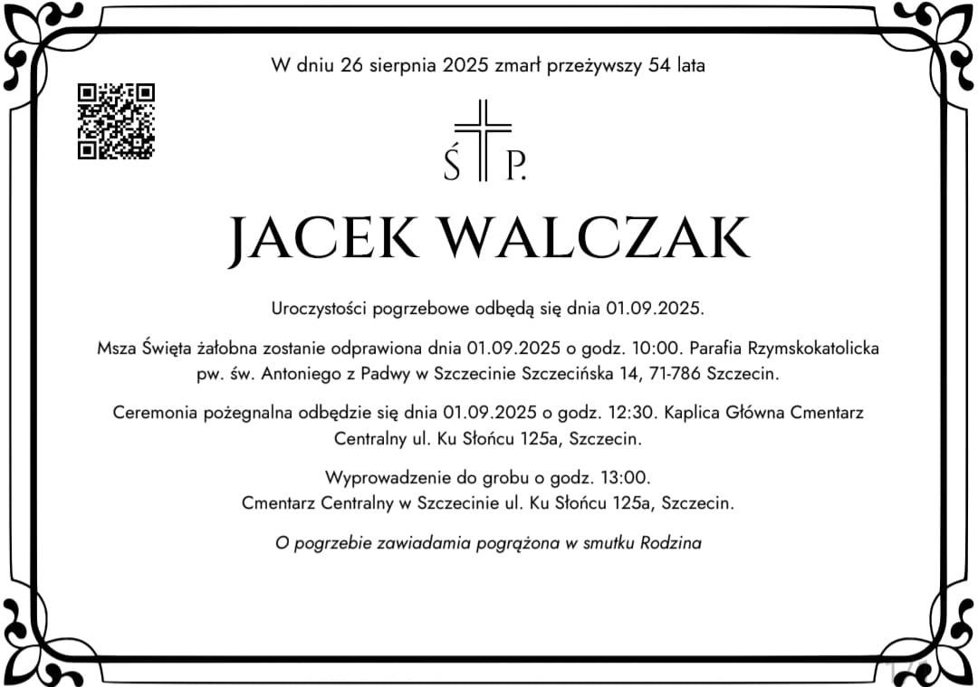 Msza Święta żałobna zostanie odprawiona 1 września 2025 r. o godz. 10:00 w kościele Rzymskokatolickim pw. św. Antoniego z Padwy w Szczecinie przy ul. Szczecińskiej 14.