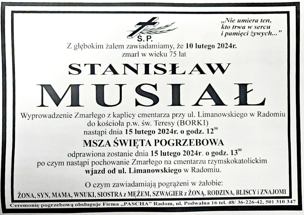 Msza święta pogrzebowa zostanie odprawiona w dniu 15 lutego 2024 r. o godzinie 13:00 w kościele pw. św. Teresy (BORKI), po czym nastąpi pochowanie Zmarłego na cmentarzu rzymskokatolickim przy ul. Limanowskiego w Radomiu.