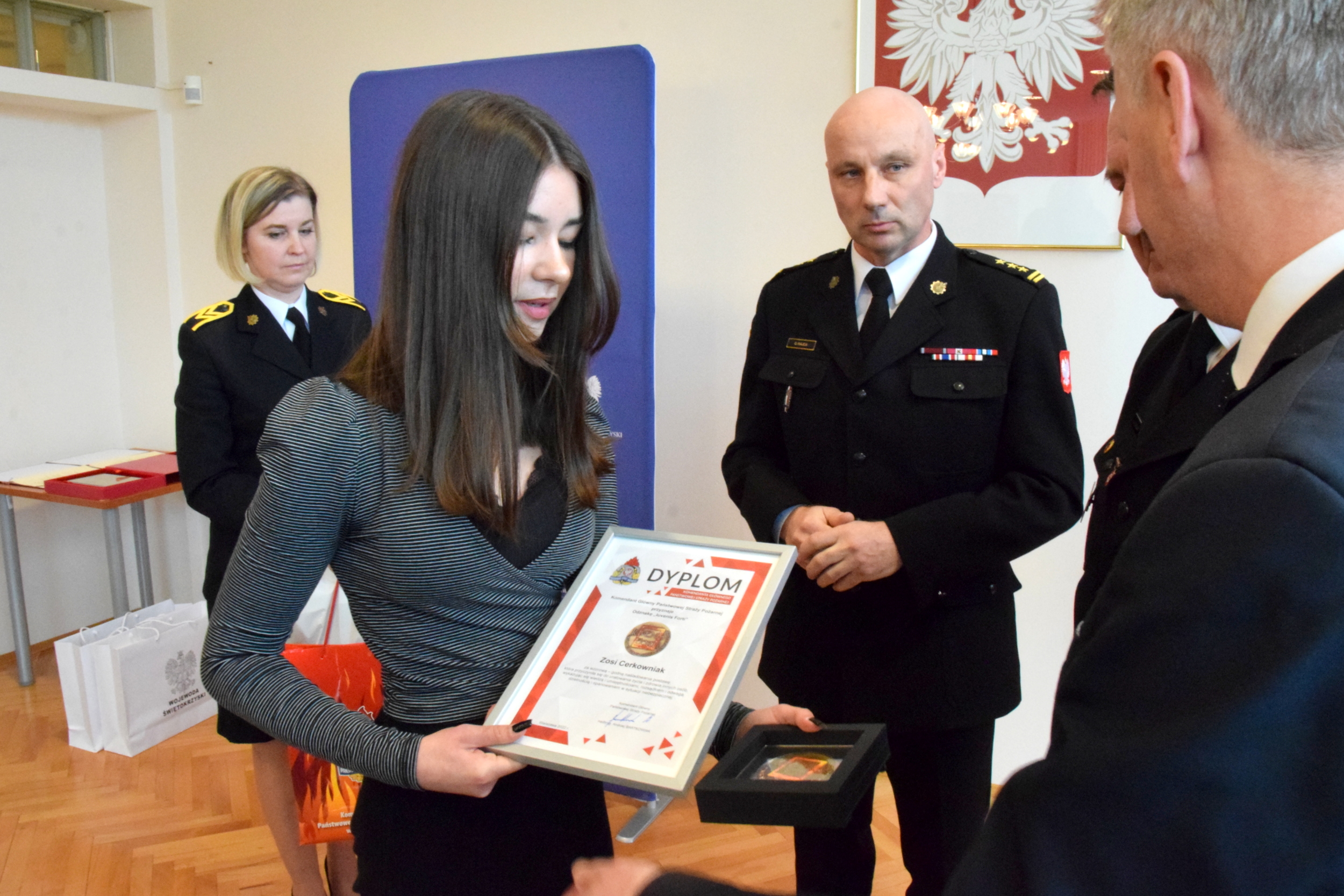 Wojewoda świętokrzyski Zbigniew Koniusz wraz z zastępcą świętokrzyskiego komendanta wojewódzkiego Państwowej Straży Pożarnej st. bryg. Grzegorzem Rajcą i komendantem miejskim PSP w Kielcach st. bryg. Sławomirem Karwatem odznaczyli bohaterską nastolatkę, która 4 lutego 2022 roku, dzięki spostrzegawczości i błyskawicznej reakcji uratowała życie obcemu mężczyźnie. W czasie spaceru Zosia zauważyła samochód osobowy, który nagle i bez przyczyny zatrzymał w miejscu do tego nieprzeznaczonym. Mężczyzna za kierownicą nie poruszał się, a silnik auta cały czas pracował. Zaniepokojona dziewczynka błyskawicznie zorganizowała pomoc osoby dorosłej, zawiadomiła o zdarzeniu służby ratownicze dzwoniąc pod numer 112 oraz informowała telefonicznie służby o przebiegu akcji ratowniczej przez cały czas aż do przyjazdu pierwszych jednostek.
