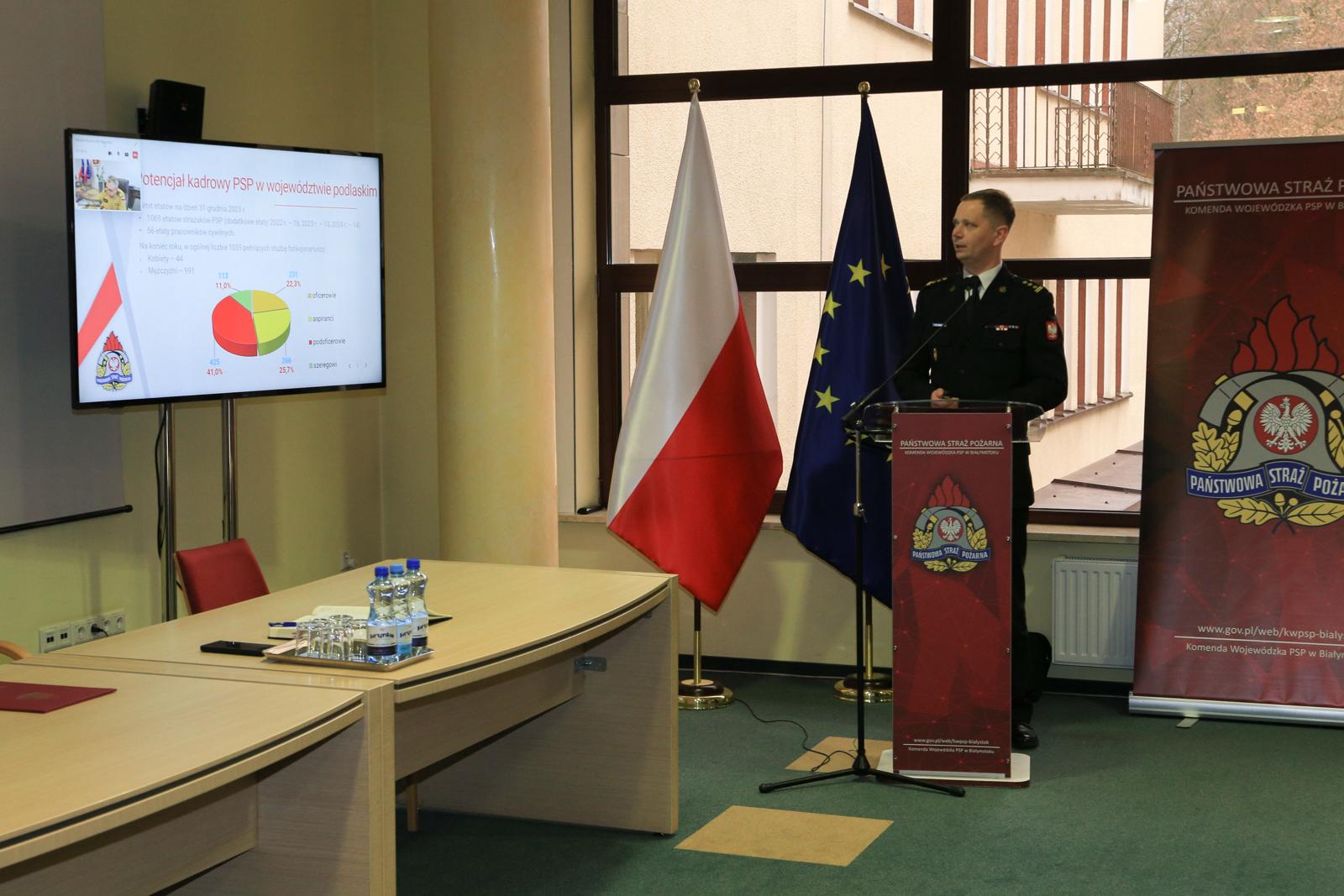 Zastępca komendanta głównego PSP podziękował podlaskim strażakom za zaangażowanie i poświęcenie w realizacji zadań służbowych oraz rozwój ochrony przeciwpożarowej na terenie ich województwa.