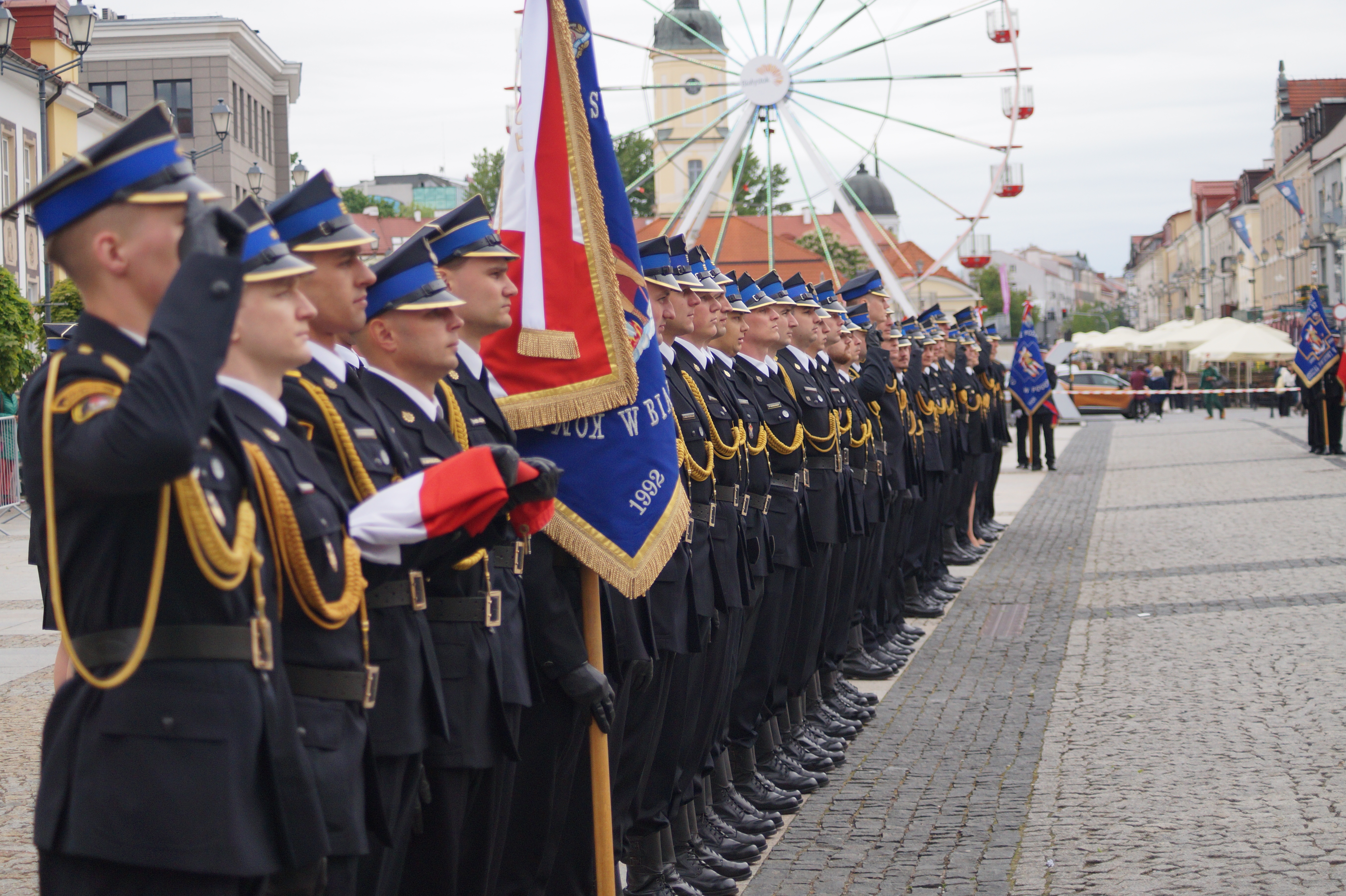 Pododdziały odznaczonych i awansowanych, kompania reprezentacyjna Komendy Wojewódzkiej PSP w Białymstoku oraz poczty sztandarowe ustawiono na placu przed pomnikiem Marszałka Józefa Piłsudskiego na Rynku Kościuszki w Białymstoku. Uroczystość rozpoczęła się złożeniem meldunku nadbryg. Arkadiuszowi Przybyle zastępcy komendanta głównego PSP, następnie miał miejsce przegląd pododdziałów, przywitanie ze strażakami oraz uroczyste podniesienie flagę i odśpiewanie hymnu państwowego.