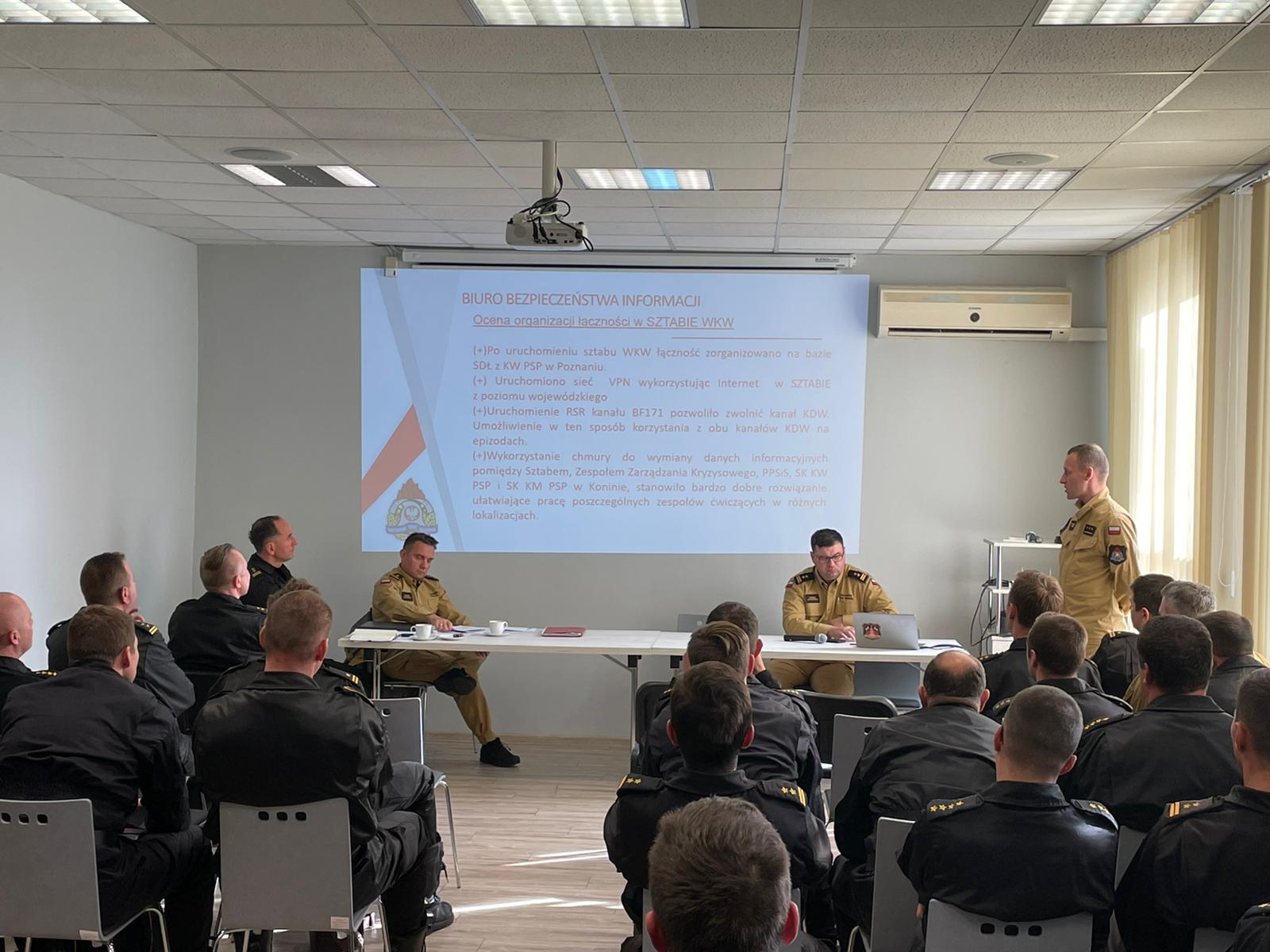Podsumowanie ćwiczeń rozpoczęli: Zastępca Wielkopolskiego Komendanta Wojewódzkiego PSP, bryg. Robert Natunewicz oraz reprezentujący Komendanta Głównego PSP, Zastępca Dyrektora Biura Planowania Operacyjnego, st. bryg. Marcin Kucharski. W podsumowaniu udział wzięli także przedstawiciele zespołu rozjemców oraz dowódcy pododdziałów centralnego odwodu operacyjnego z województw uczestniczących w ćwiczeniu, a także przedstawiciele Szkoły Aspirantów PSP w Poznaniu. St. bryg. Daniel Wiącek przedstawił ogólne uwagi do ćwiczeń oraz główne problemy związane z organizacją i przebiegiem ćwiczenia wynikające z „Ankiety oceny organizacji ćwiczeń”.