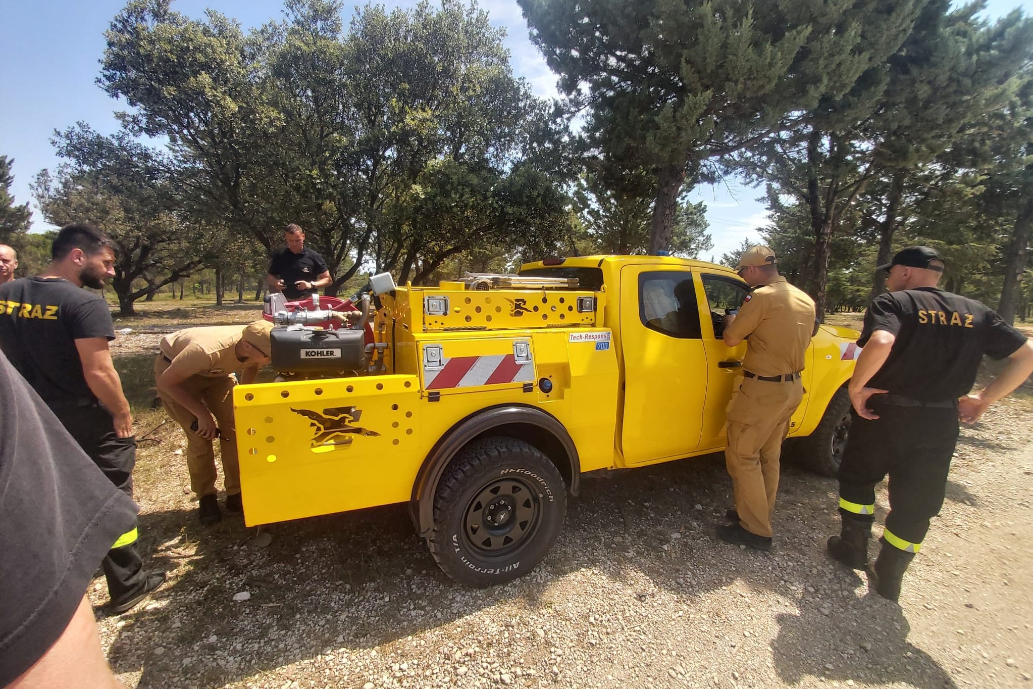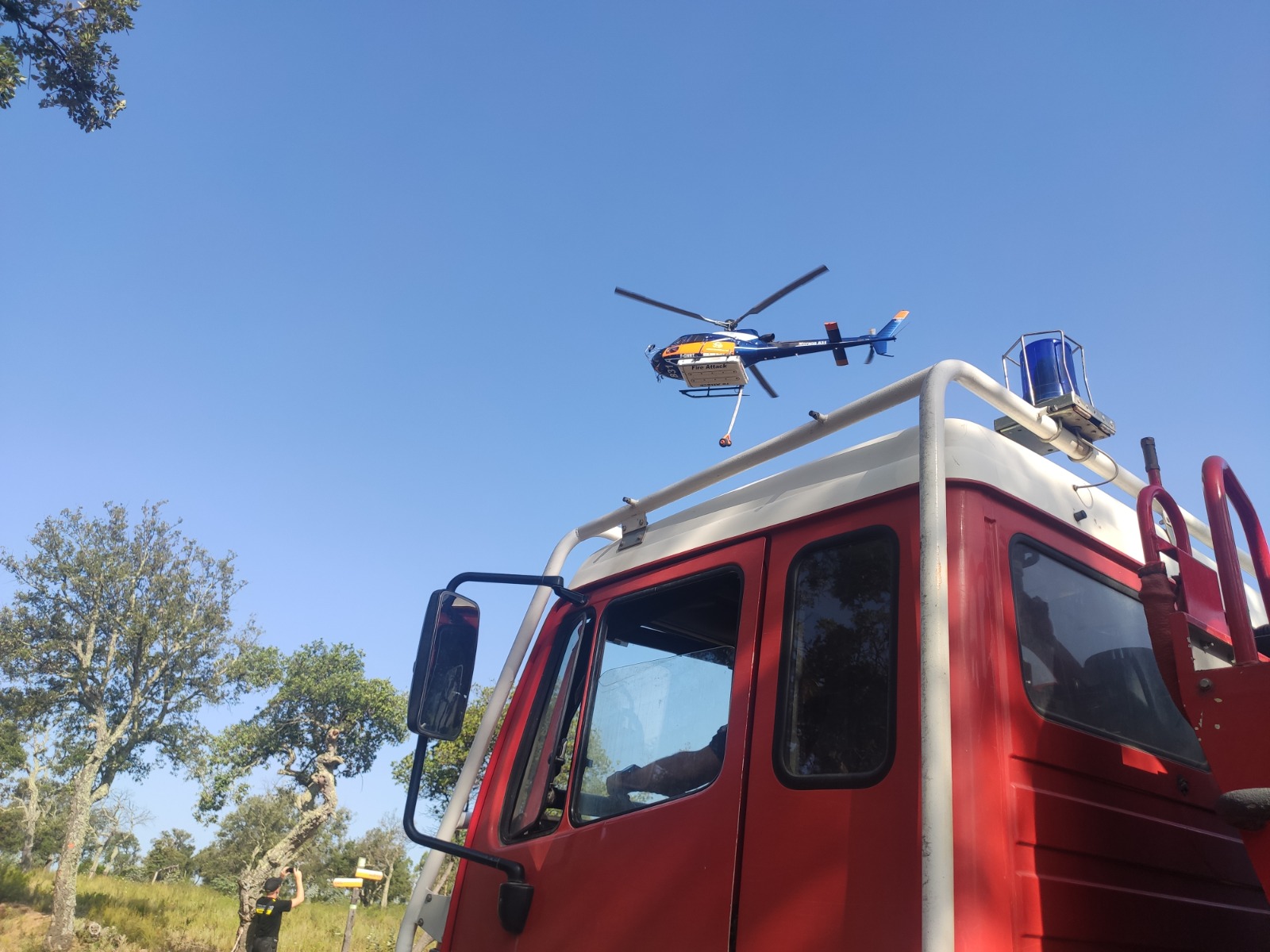 We wtorek (4 lipca) zespół strażaków został zaangażowany do ćwiczeń z wykorzystaniem statku powietrznego. Założenie polegało na sprawieniu linii wężowej przy użyciu helikoptera. Po omówieniu zasad bezpieczeństwa oraz współpracy z załogą helikoptera, ustalono kolejność dostarczania ludzi oraz sprzętu przez statek powietrzny do miejsca docelowego. Po przetransportowaniu na szczyt ludzi, zbiornika oraz sprzętu (węży i pomp) helikopter został użyty do rozwinięcia linii gaśniczej z powietrza. Zadaniem polskich strażaków była kontrola poprawności rozwinięcia linii oraz korekta jej przebiegu. Teren był bardzo wymagający a działania prowadzone były na stromym, gęsto porośniętym zboczu. Dodatkowym utrudnieniem są warunki pogodowe, gdyż temperatura powietrza oscyluje w granicach 30 stopni Celsjusza.
