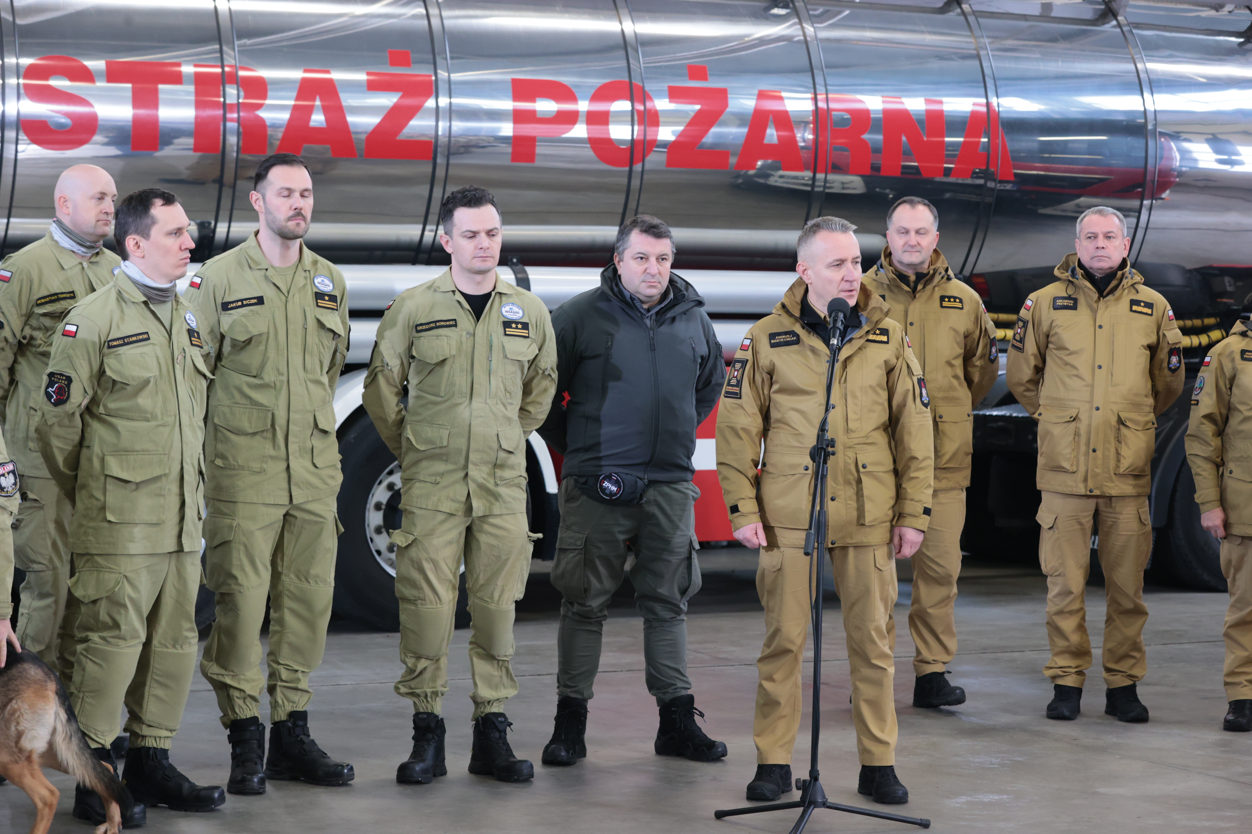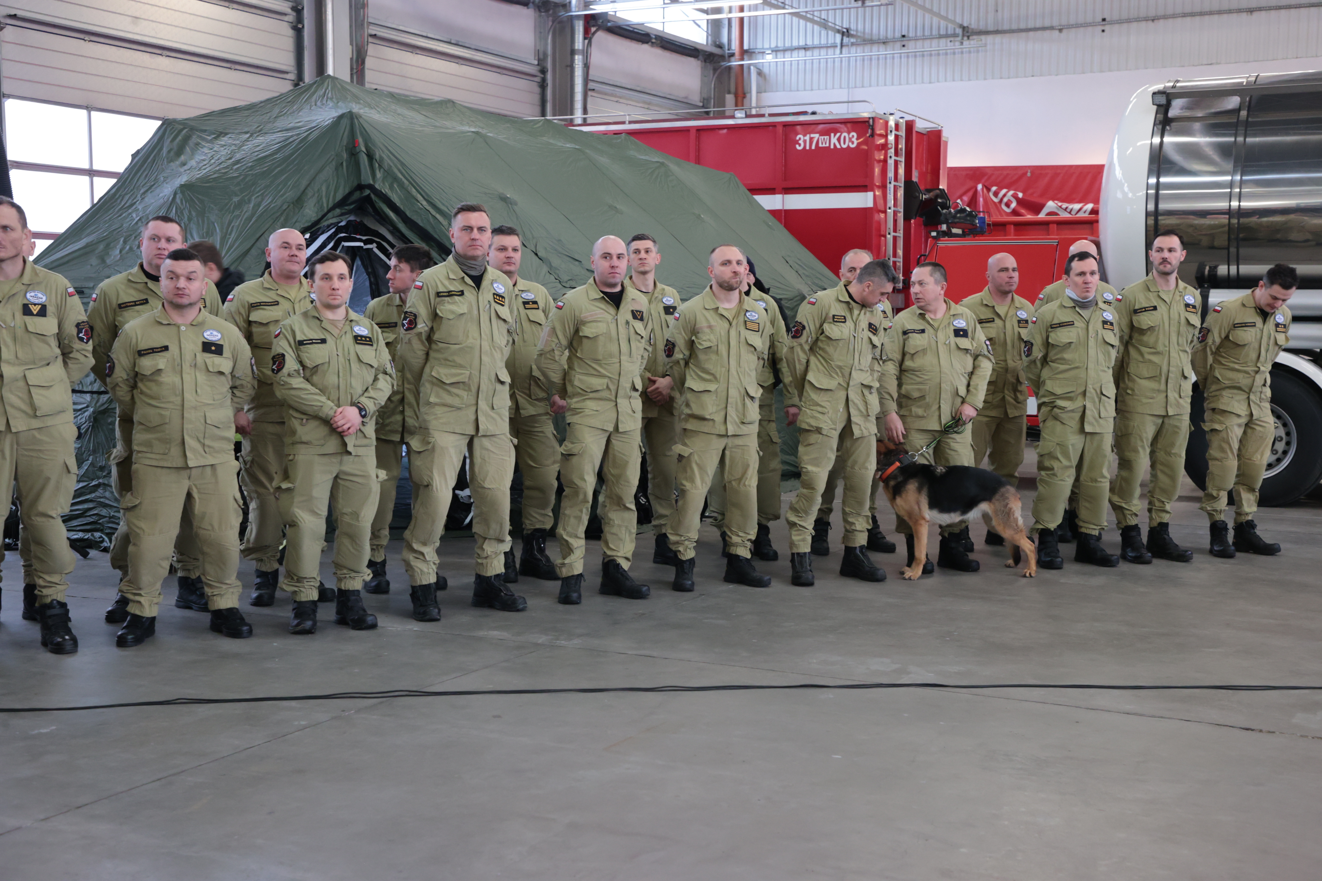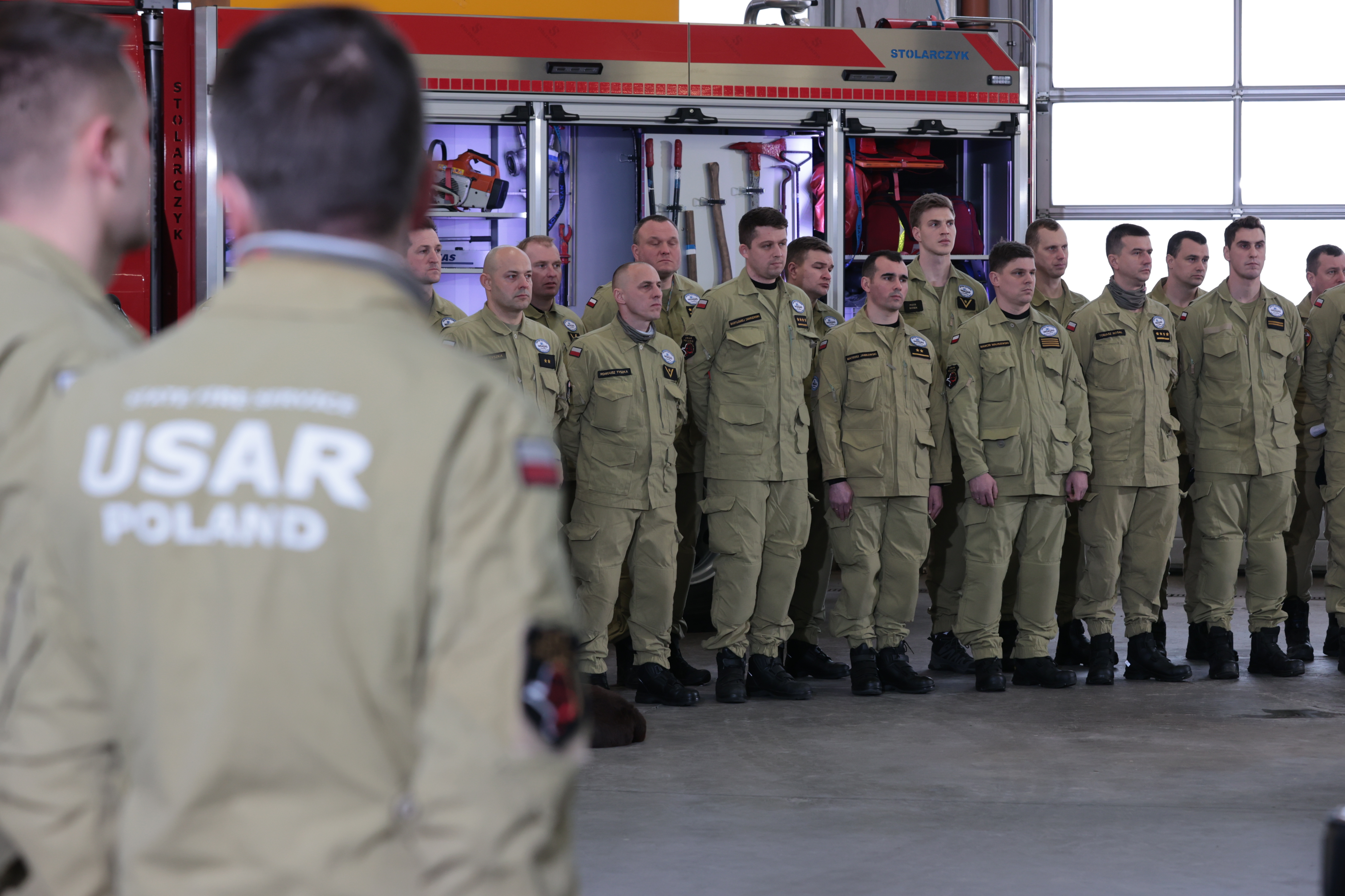 "Przed państwem grupa 76 strażaków i kilku medyków z zespołu humanitarno-medycznego, którzy z wraz z ośmioma psami polecą do Turcji, by tam ratować życie ludzi, którzy są uwięzieni pod gruzami".