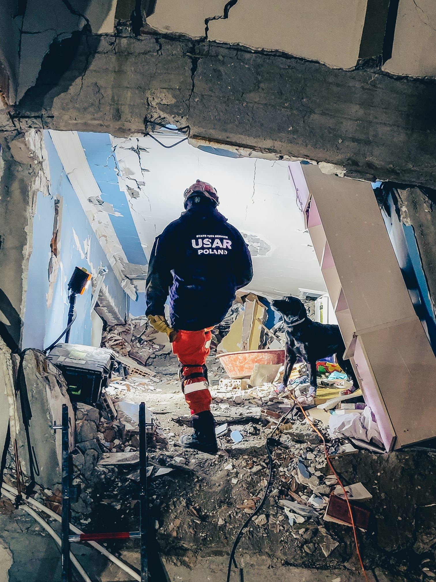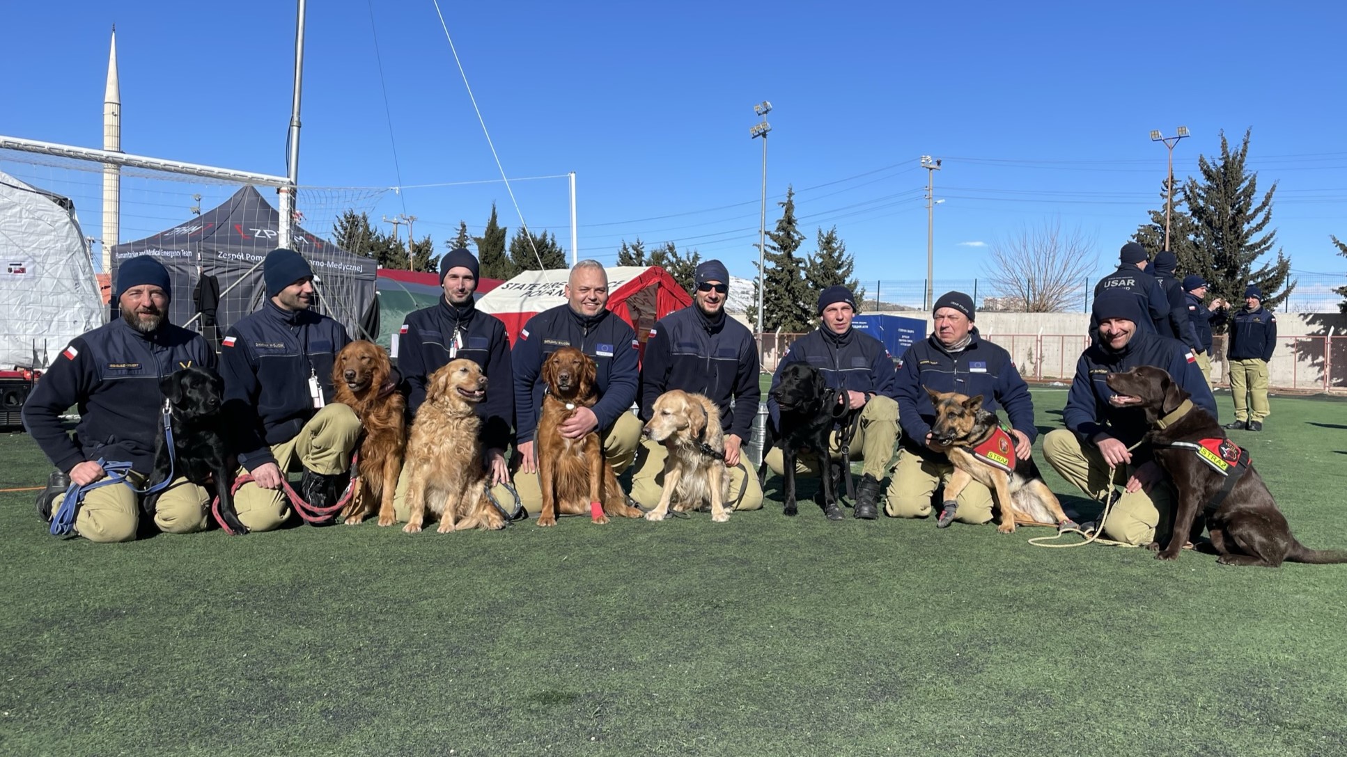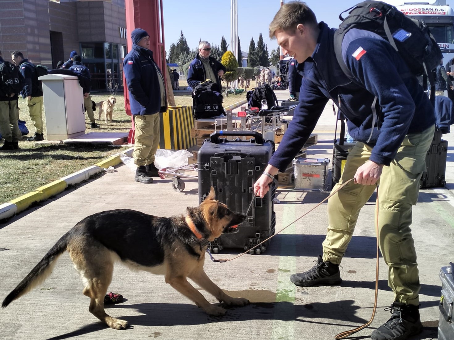 "Przed państwem grupa 76 strażaków i kilku medyków z zespołu humanitarno-medycznego, którzy z wraz z ośmioma psami polecą do Turcji, by tam ratować życie ludzi, którzy są uwięzieni pod gruzami".