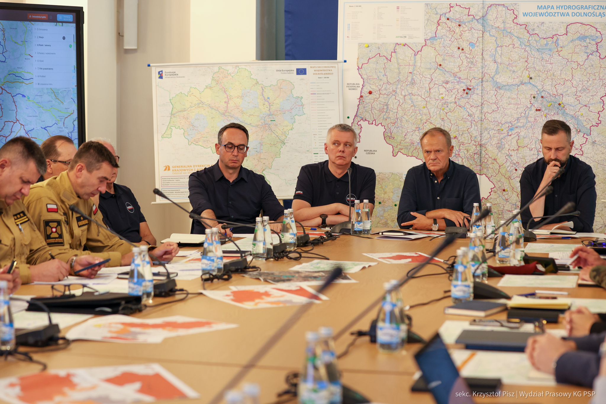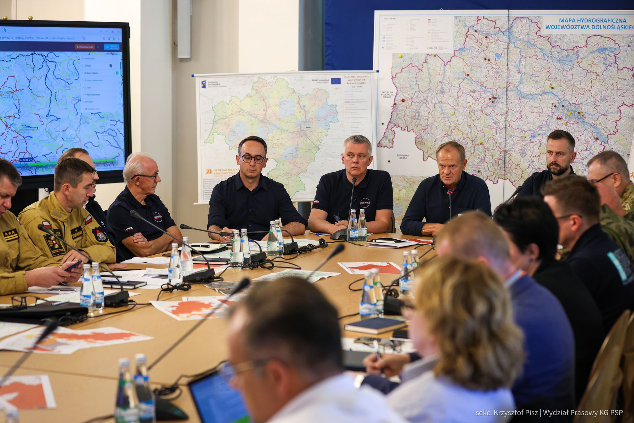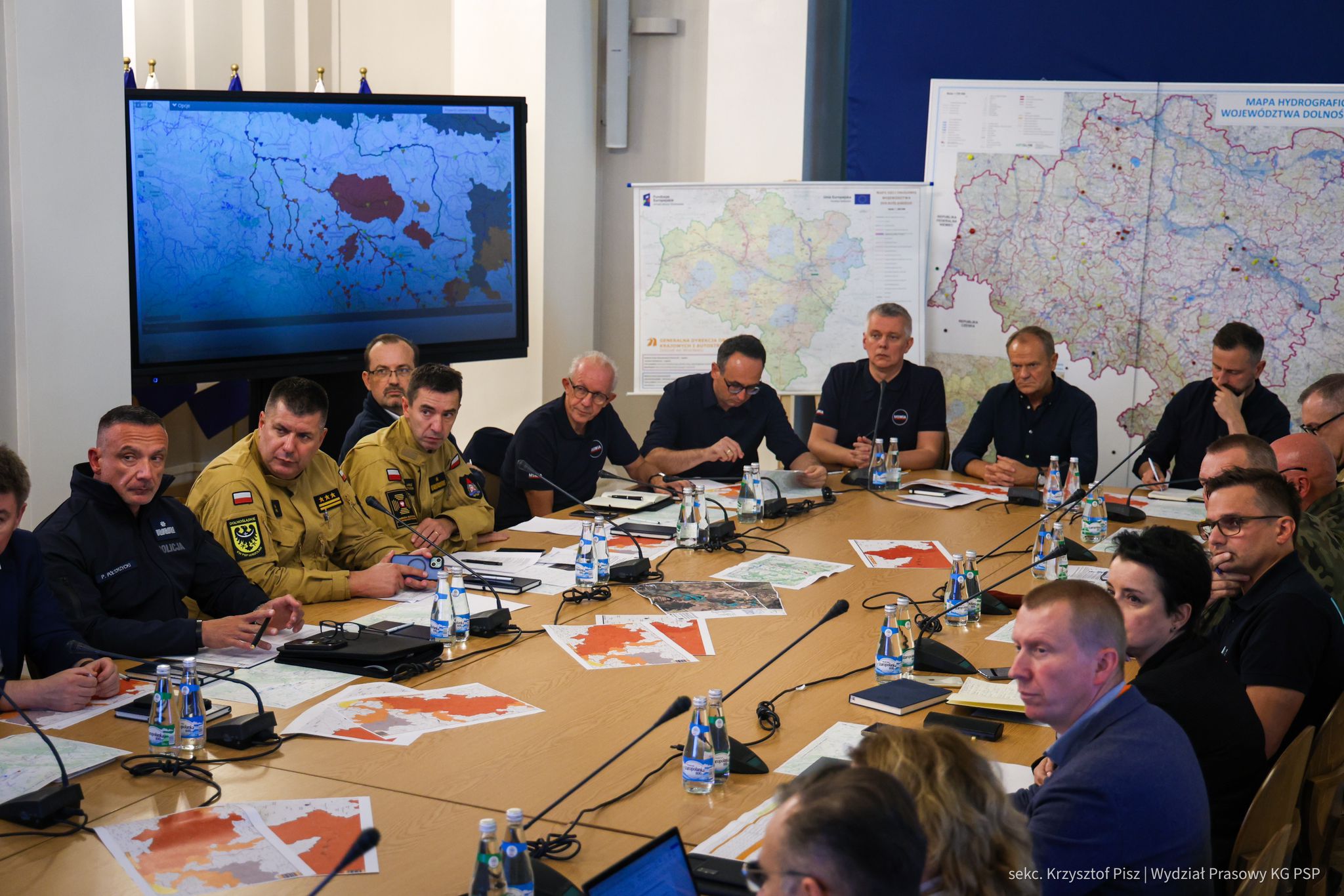 W poniedziałek 16 września 2024 r. we Wrocławiu odbył się sztab kryzysowy z udziałem premiera Donalda Tuska, wicepremiera i ministra obrony narodowej Władysława Kosiniaka-Kamysza, ministra spraw wewnętrznych i administracji Tomasza Siemoniaka, ministra infrastruktury Dariusza Klimczaka, wiceministra MSWiA Wiesława Leśniakiewicza, wojewody dolnośląskiego Macieja Awiżenia, komendanta głównego PSP nadbryg. dr. inż. Mariusza Feltynowskiego, dolnośląskiego komendanta wojewódzkiego PSP st. bryg. Marka Hajduka oraz przedstawicieli służb i wojska. W trybie wideokonferencji udział w odprawie wzięli przedstawiciele województw, a także przedstawiciele Komendy Głównej PSP pod przewodnictwem zastępcy komendanta głównego PSP st. bryg. Pawła Frysztaka.