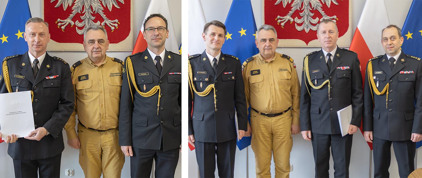 Kolarz dwóch zdjęć. Po prawej na zdjęciu w środku zastępca komendanta głównego oraz powołany zastępca śląskiego komendanta wojewódzkiego PSP i śląski komendant wojewódzki PSP. Na fotografii po prawo stoją w kolejności zastępca zachodniopomorskiego komendanta wojewódzkiego PSP, zastępca komendanta głównego PSP, drugi zastępca zachodniopomorskiego komendanta wojewódzkiego PSP oraz zachodniopomorski komendant wojewódzki PSP. Za osobami na fotografii widoczne godło Polski oraz flagi Polski i Unii Europejskiej.