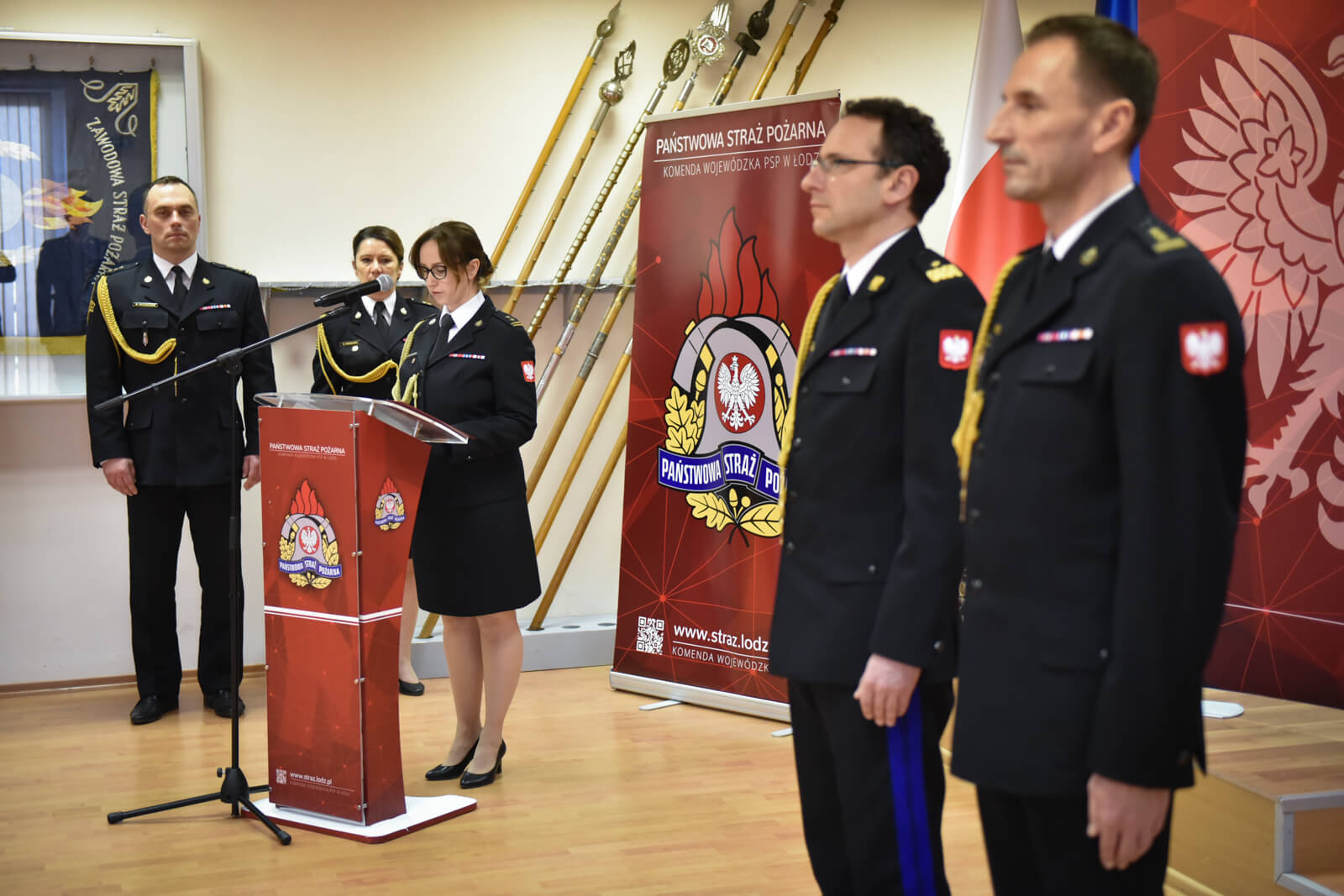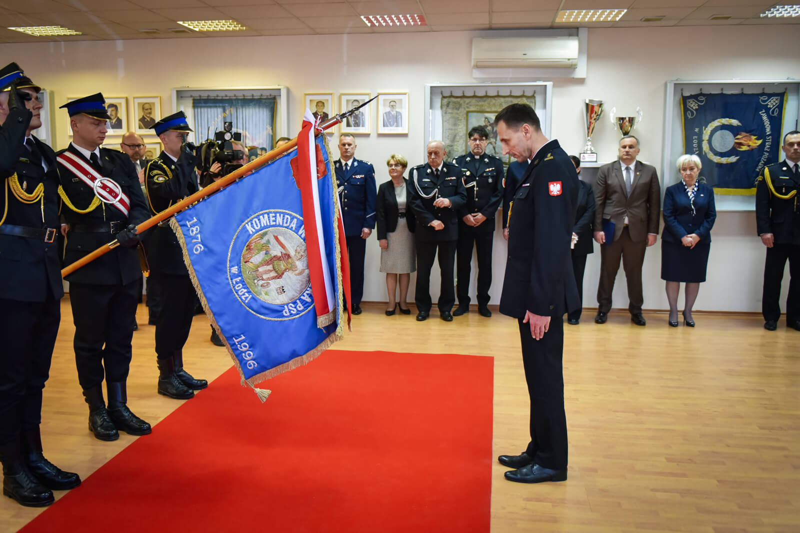 Odczytano decyzję o powołaniu, a kulminacyjnym momentem było oddanie honorów sztandarowi oraz złożenie meldunku przez obejmującego obowiązki Łódzkiego Komendanta Wojewódzkiego PSP – st. bryg. Marcina Dulasa.