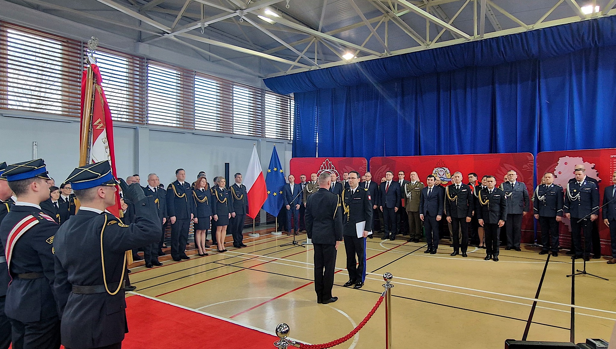 Kulminacyjnym momentem uroczystości było przekazanie sztandaru oraz złożenie meldunku przez obejmującego obowiązki Śląskiego Komendanta – st. bryg. Damiana Legierskiego.