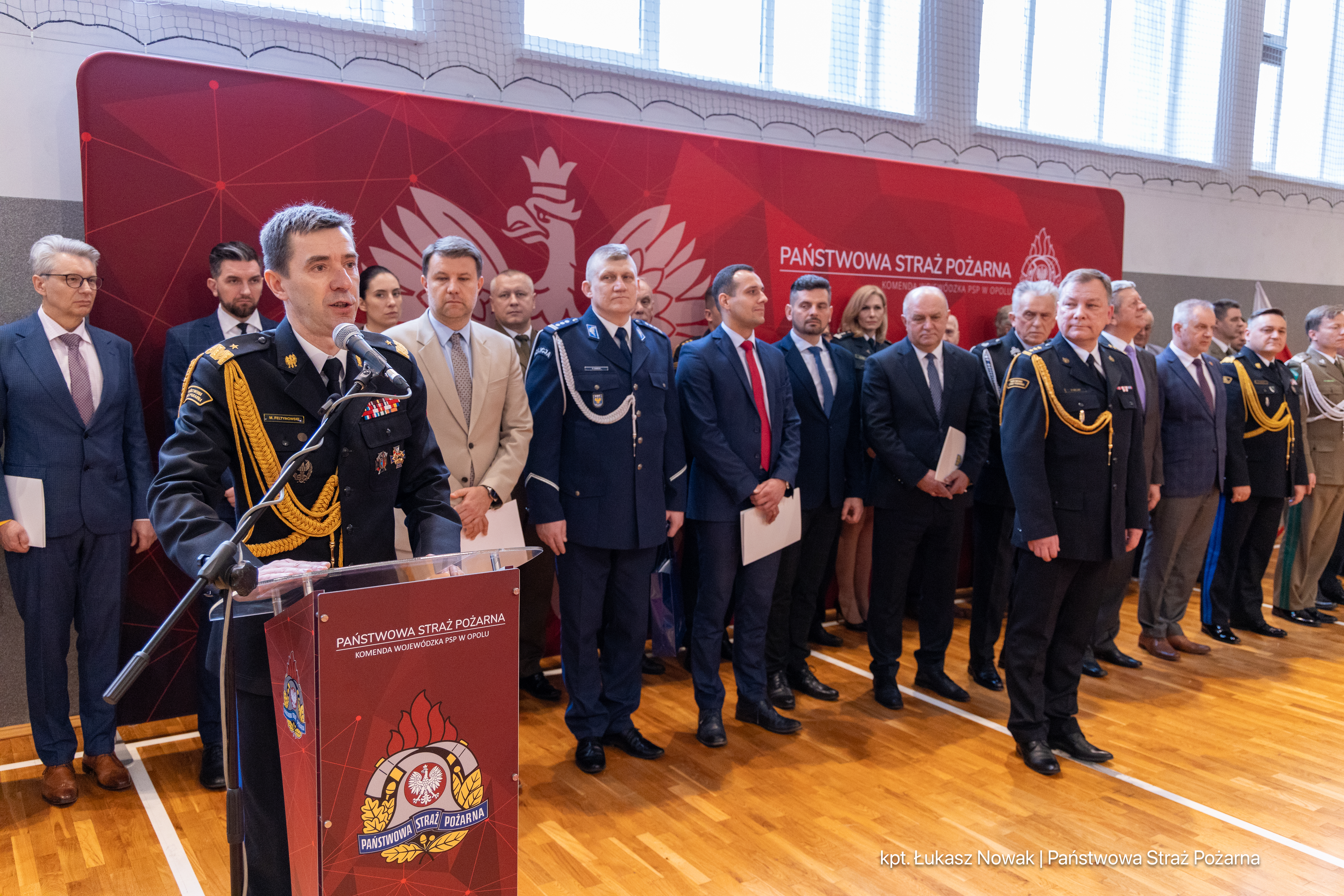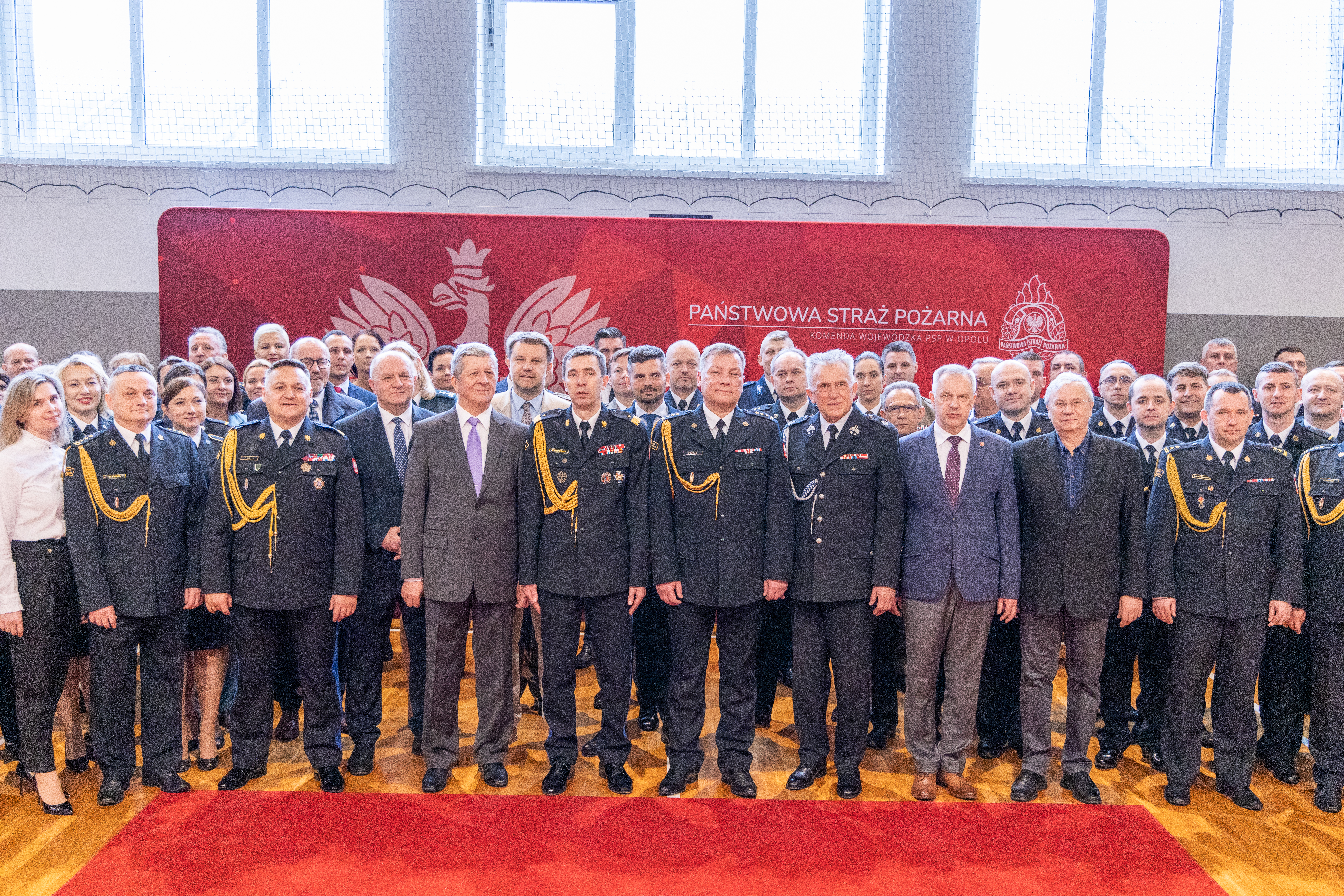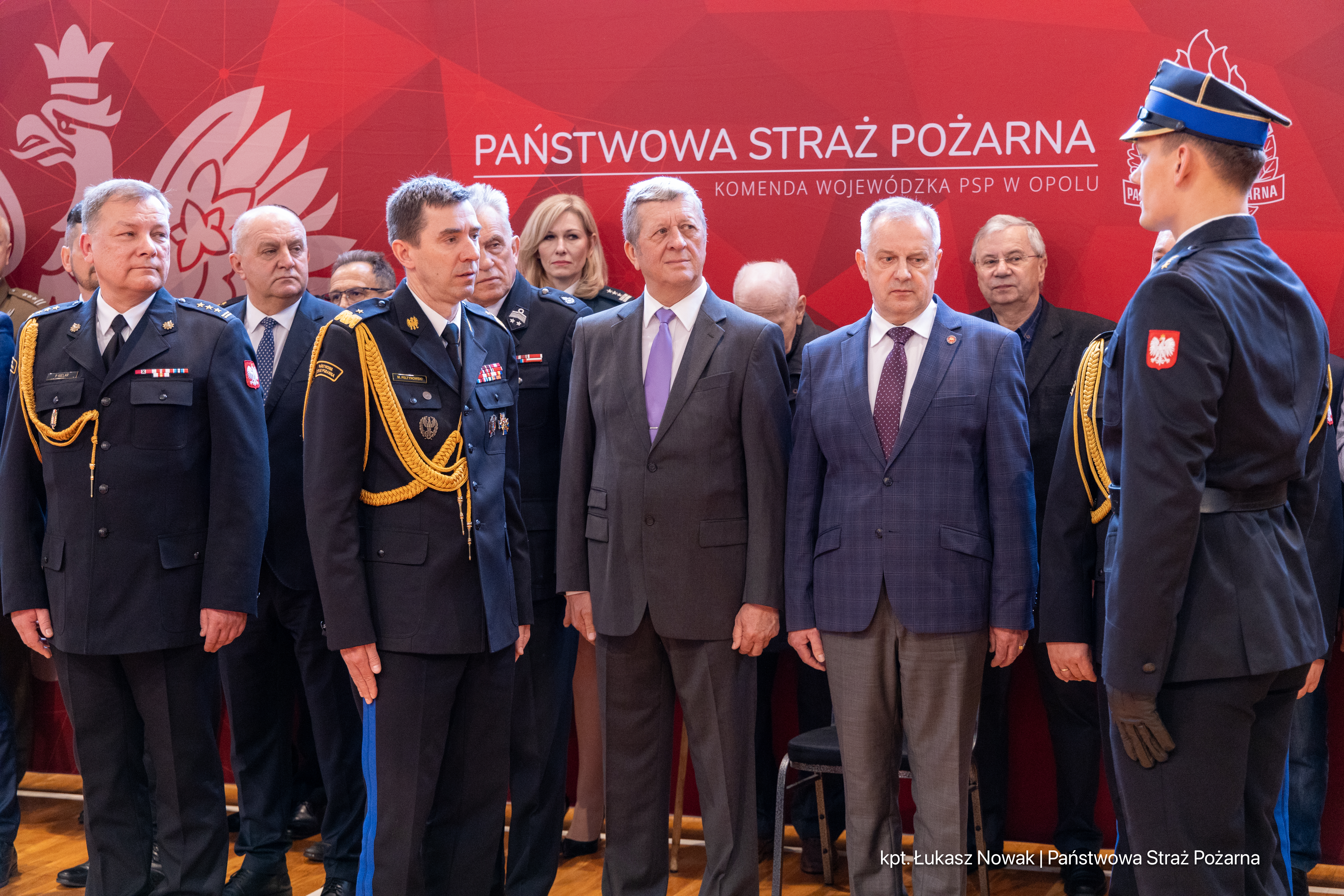 W uroczystości wzięli udział pracownicy cywilni i funkcjonariusze Komendy Wojewódzkiej PSP w Opolu oraz przedstawiciele władz wojewódzkich i samorządowych, służb współpracujących z Państwową Strażą Pożarną oraz byli funkcjonariusze Państwowej Straży Pożarnej.