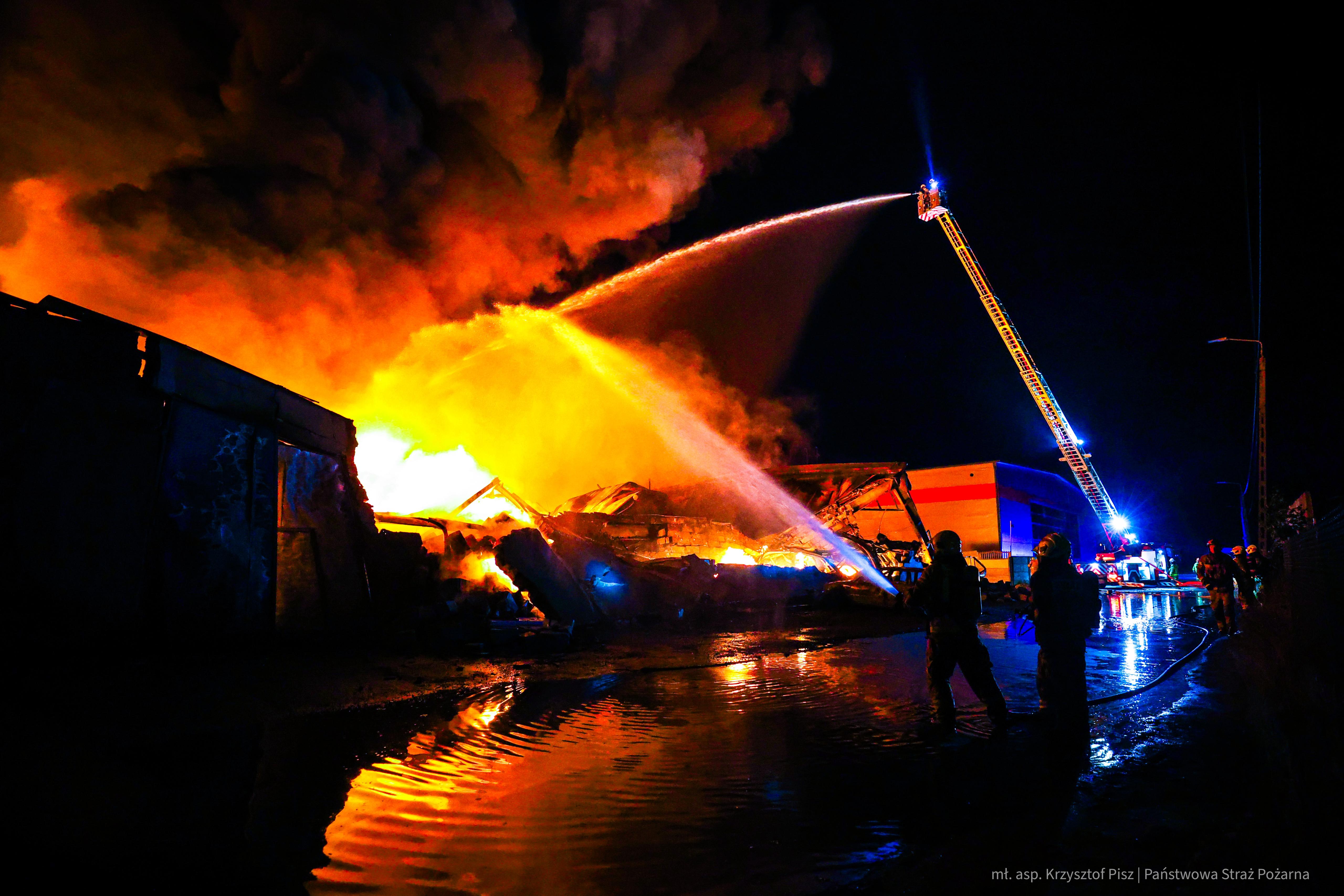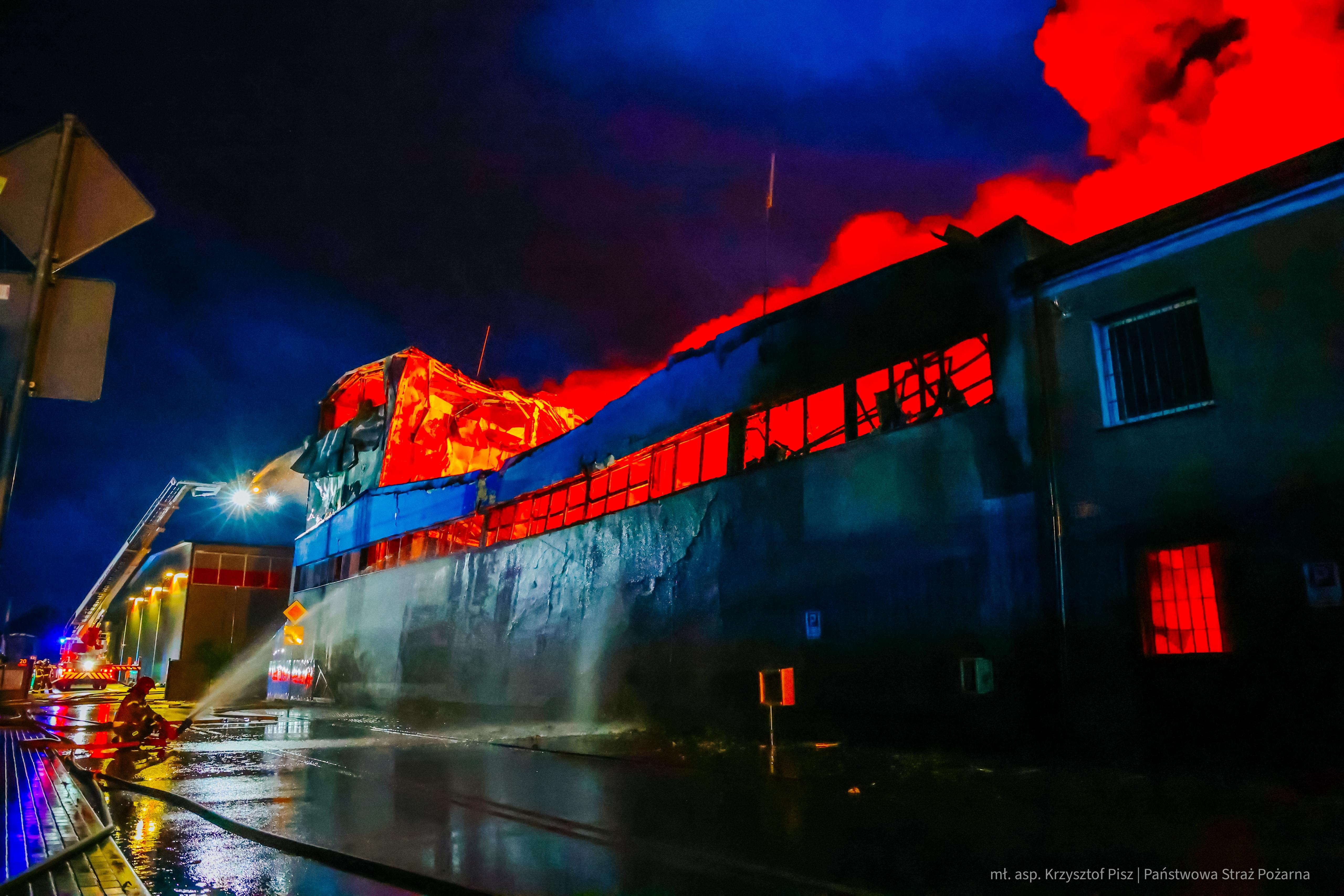 Obiekt, w którym prowadzono produkcję opakowań foliowych o wymiarach 80x50 był całkowicie objęty ogniem. Dach hali się zawalił, a konstrukcja uległa poważnym odkształceniom. Wewnątrz magazynu paliły się m.in. półprodukty do produkcji folii oraz meble. W kulminacyjnym momencie, w zdarzeniu uczestniczyło ponad 50 zastępów PSP i OSP oraz ponad 200 strażaków.