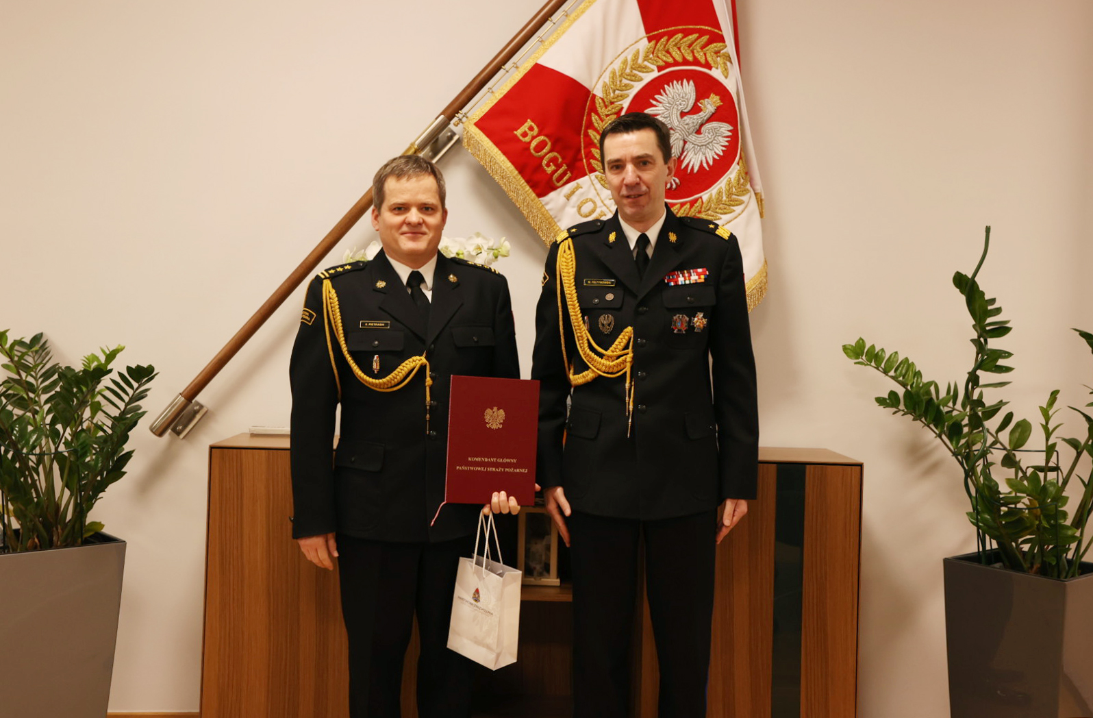 Komendant Główny Państwowej Straży Pożarnej nadbryg. dr inż. Mariusz Feltynowski serdecznie podziękował oficerom za lata służby na rzecz ochrony przeciwpożarowej oraz za zaangażowanie i poświęcenie na stanowiskach kierowniczych w Komendzie Głównej PSP.