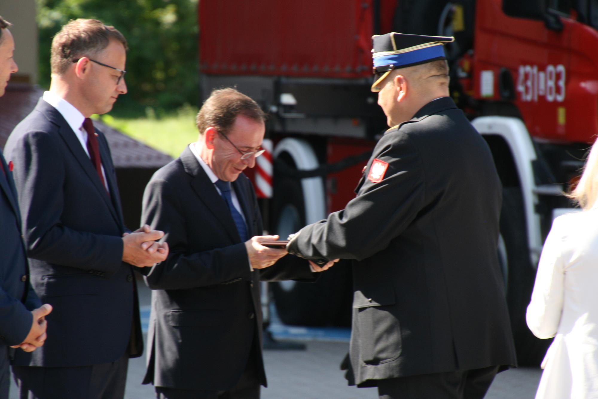 Przekazanie samochodów i sprzętu ratowniczego dla strażaków z woj. lubelskiego z udziałem Szefa MSWiA Mariusza Kamińskiego oraz Zastępcy Komendanta Głównego PSP nadbryg. Krzysztofa Hejduka