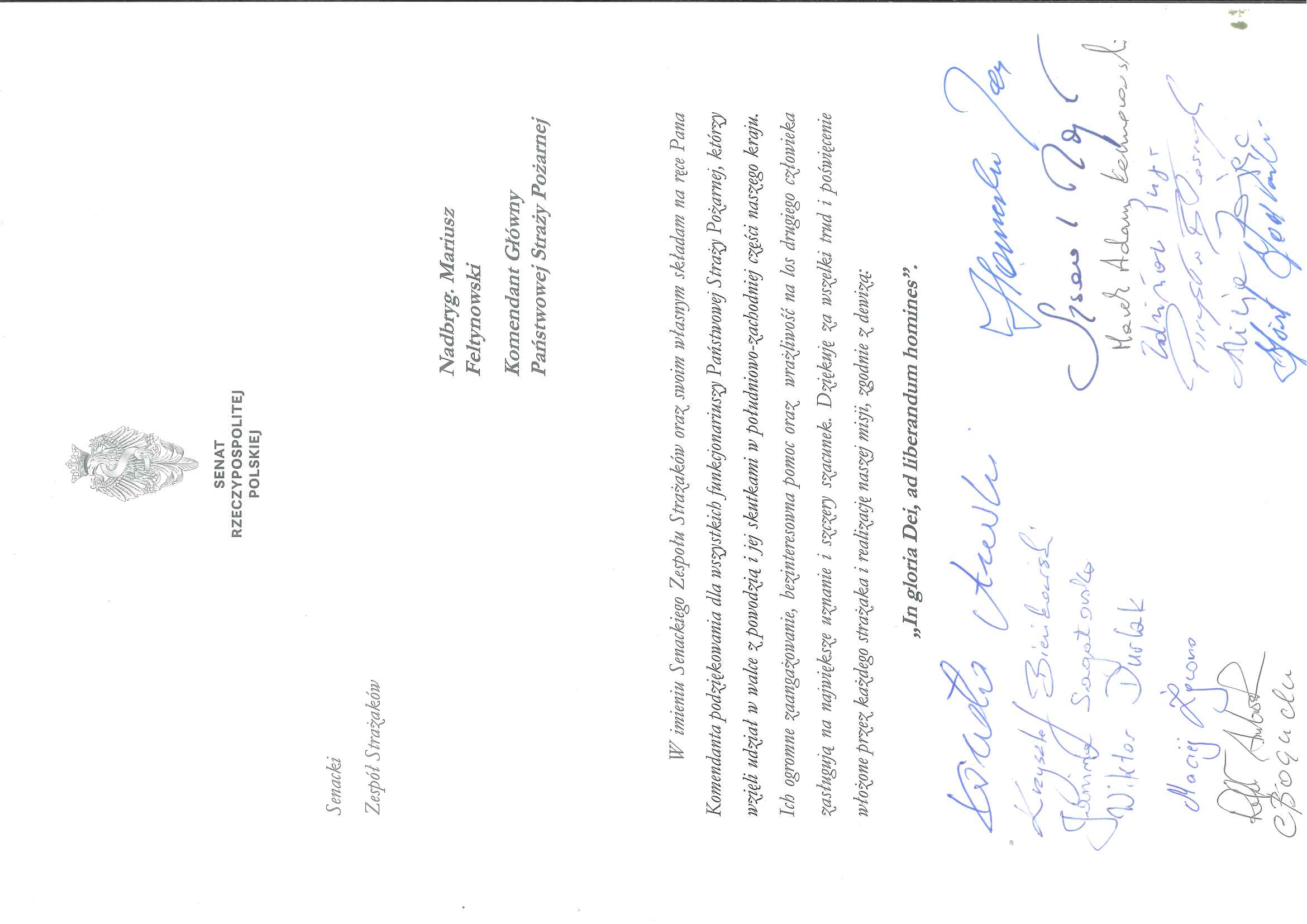 Pod listem swoje podpisy złożyli członkowie Senackiego Zespołu Strażaków, wyrażając uznanie dla misji Państwowej Straży Pożarnej oraz podkreślając istotną rolę tej formacji w zapewnianiu bezpieczeństwa obywatelom. W imieniu wszystkich funkcjonariuszy PSP nadbrygadier Mariusz Feltynowski oraz nadbrygadier Józef Galica podziękowali senatorom za słowa wsparcia i wyrazy uznania.