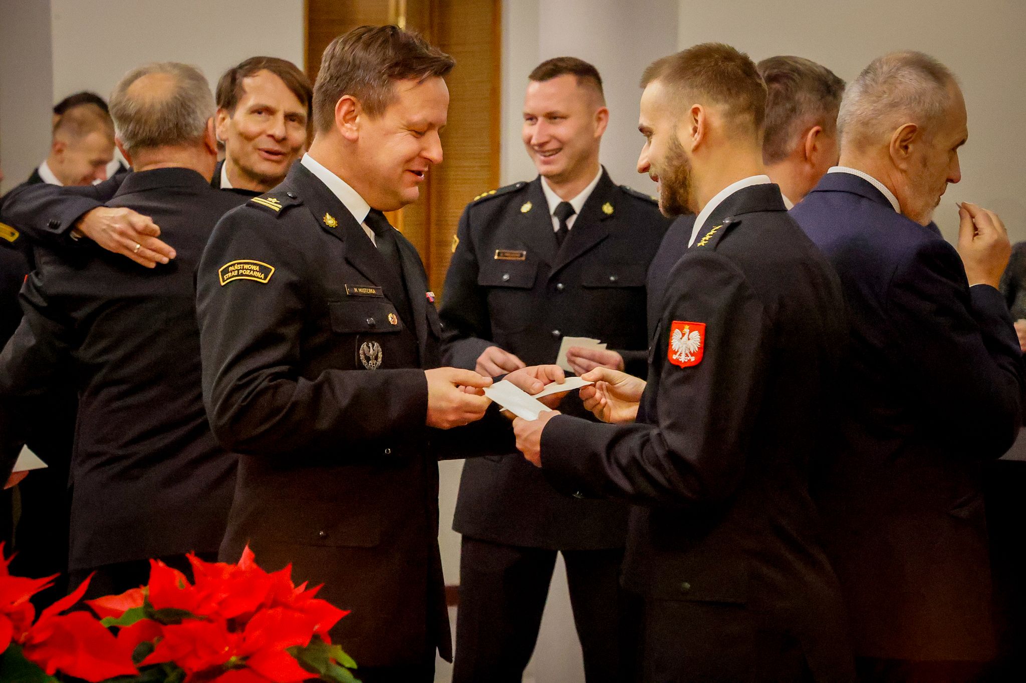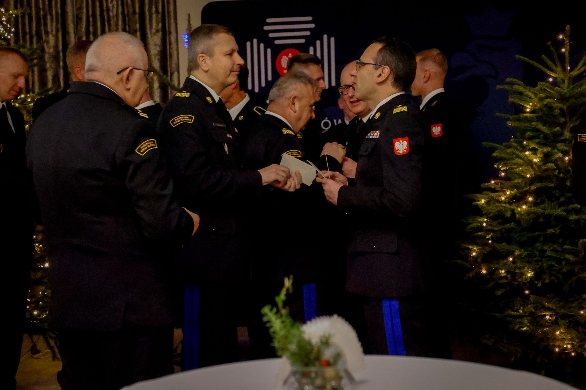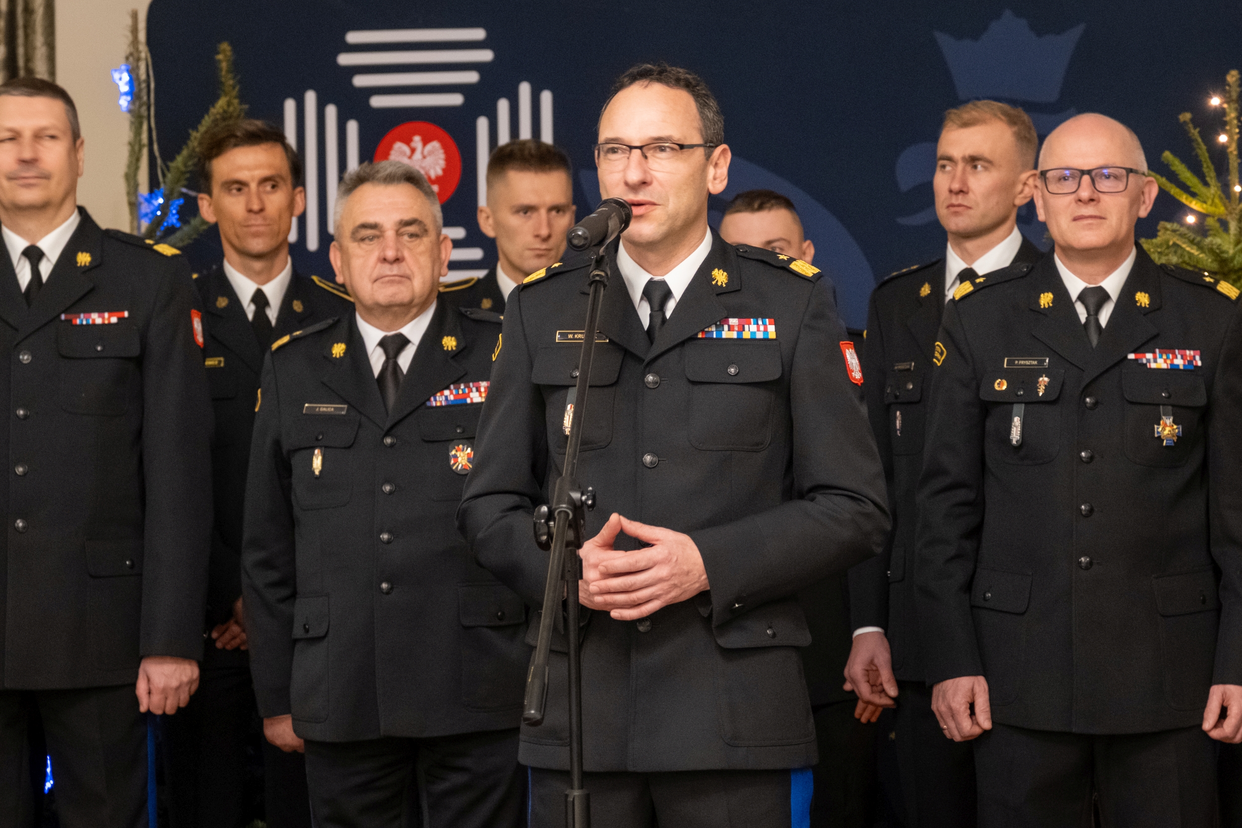 Komendant główny Państwowej Straży Pożarnej nadbryg. Wojciech Kruczek, w imieniu własnym oraz Zastępców, przekazał wszystkim funkcjonariuszom i pracownikom cywilnym, a także ich rodzinom, serdeczne życzenia bożonarodzeniowe i noworoczne. W swoim wystąpieniu podziękował za zaangażowanie, profesjonalizm i odpowiedzialność. Podkreślił, że to właśnie codzienna gotowość do działania, wzajemne wsparcie i poczucie wspólnoty sprawiają, że Państwowa Straż Pożarna może skutecznie realizować swoją misję – służbę drugiemu człowiekowi.