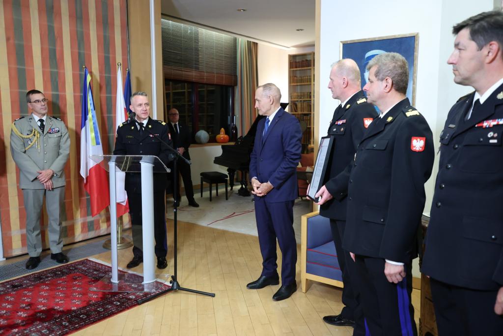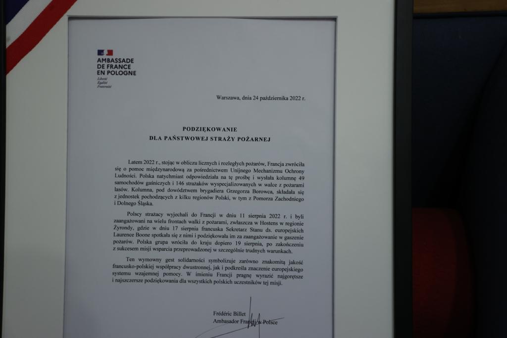 Podczas przemówienia ambasador Frederic Billet przekazał słowa uznania dla polskich strażaków: "Chciałbym dziś serdecznie wam podziękować za wasz ogromny wkład w ratowanie francuskiej ziemi od pożarów. Jak wiadomo Francja w sierpniu toczyła ciężką walkę z pożarami. Walkę nierówną ponieważ bardzo utrudniała fala upałów. Polska była pierwszym krajem, który odpowiedział na naszą prośbę o pomoc. Warto tutaj również podkreślić, że Polska zadysponowała do Francji, największą liczbę strażaków i sprzętu. Aż 146 strażaków, 49 pojazdów. Kolumna polskich strażaków została zauważona w całej Europie. Szczególnie ciepło witali ją nasi obywatele we Francji. Były to niezwykle przyjemne momenty powitania i mam nadzieję, że wywołali oni również na Państwu budujące wrażenie. Jak wiadomo w Polsce i we Francji zawód strażaka jest ogromnie szanowany. (…)Wasza misja została wykonana znakomicie. We Francji jesteśmy pod ogromnym wrażeniem działania Polskich strażaków. (…) To był ogromny sukces polskich strażaków. Wasze zaangażowanie pokazuje, że solidarność europejska działa(…)Wiemy że możemy liczyć na Polskę, tak jak Polska może liczyć na nas. ”