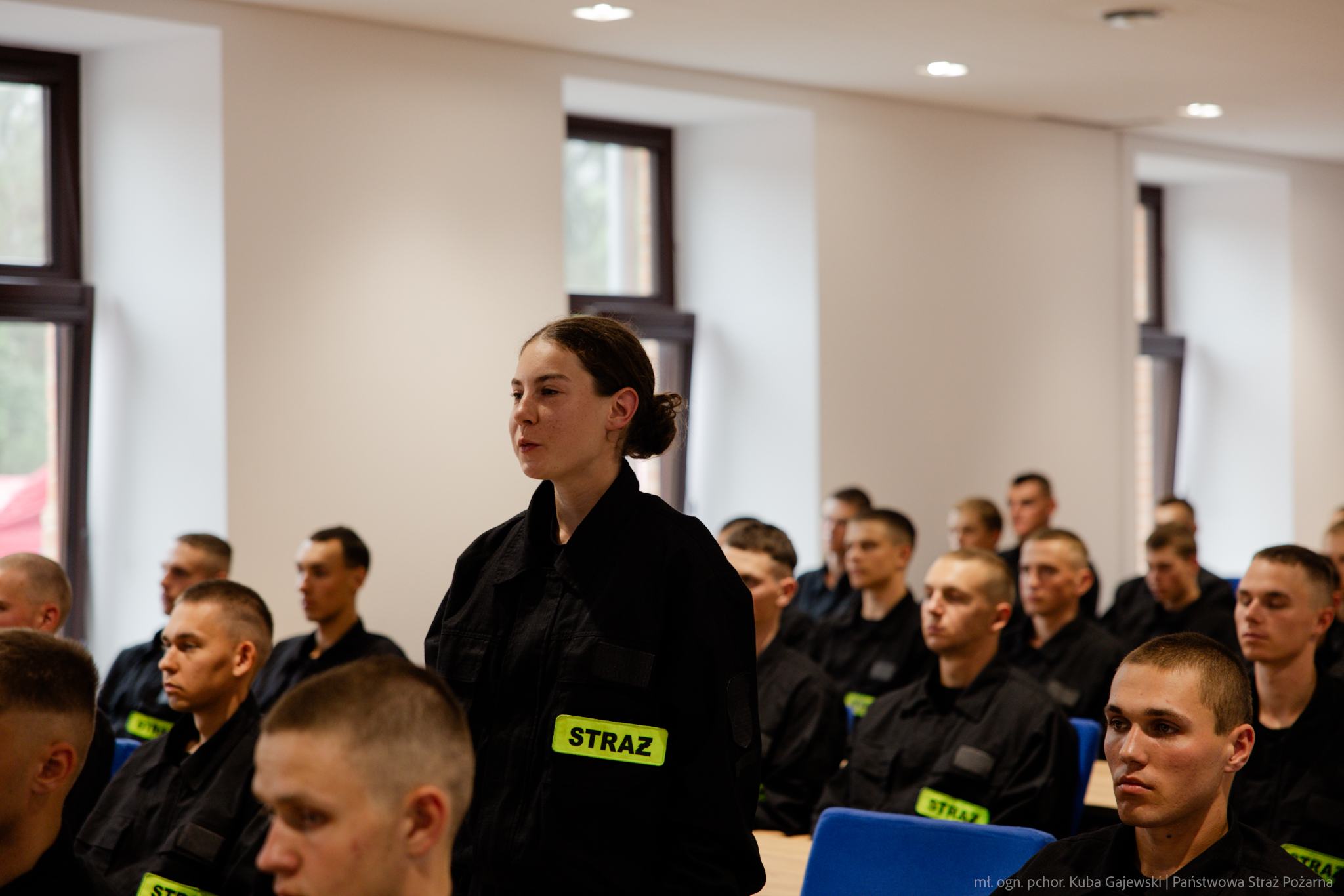 Przygotowujący się do zawodowego pożarnictwa strażacy w służbie kandydackiej skorzystali ze sposobności i zadali również pytania Komendantowi Głównemu PSP, dotyczące m.in. roli Państwowej Straży Pożarnej w zakresie działań w obszarze ochrony ludności i obrony cywilnej, rozwoju PSP czy też jak wygląda dzień pracy Komendanta Głównego PSP.