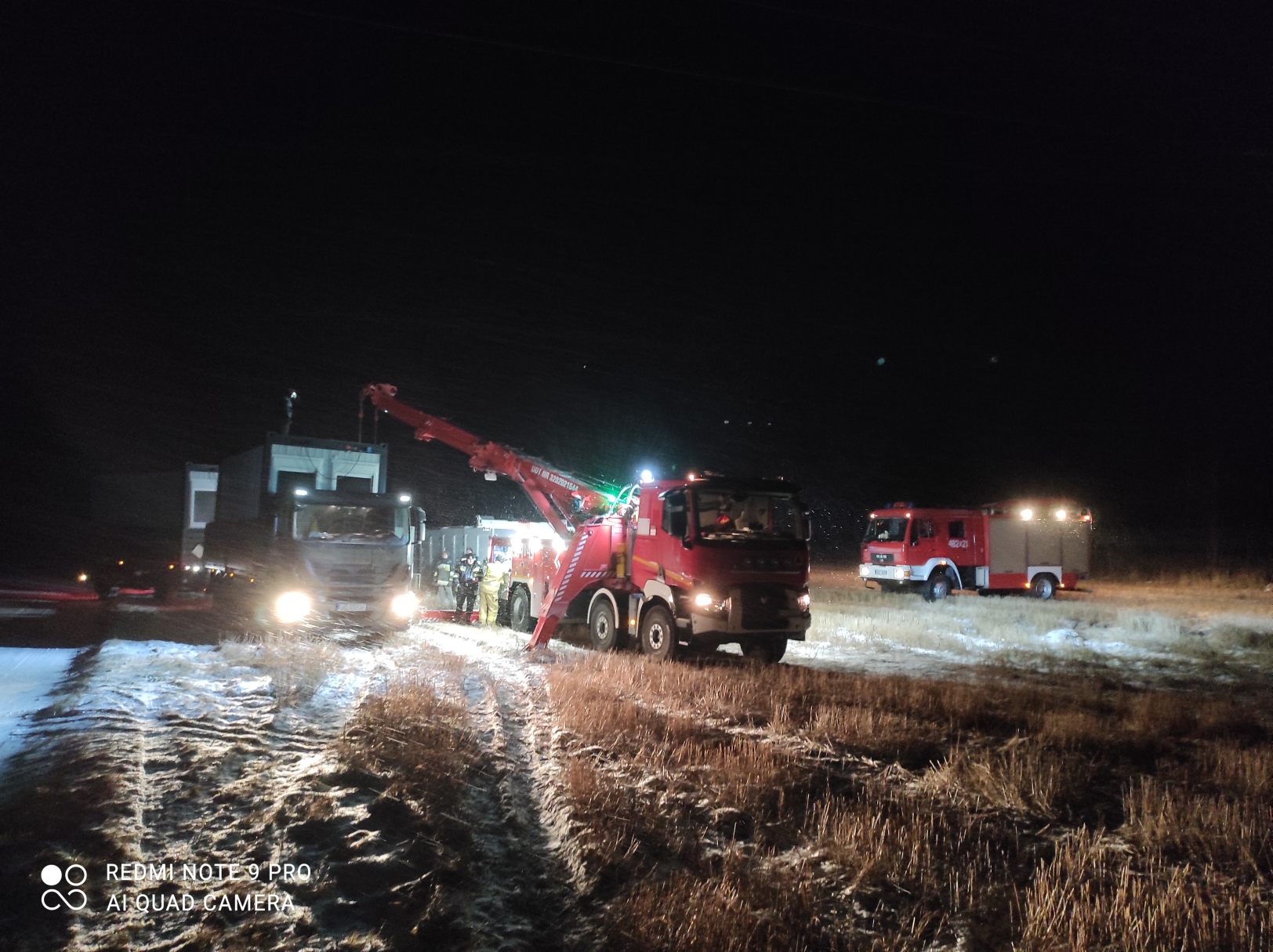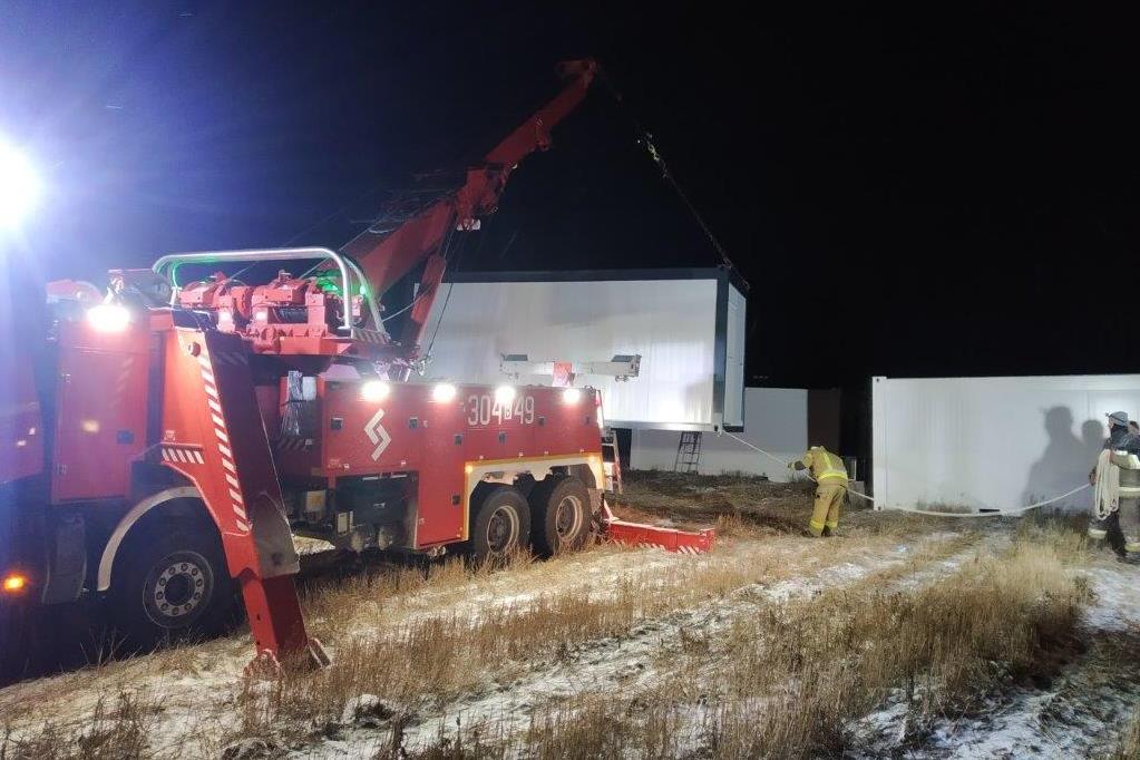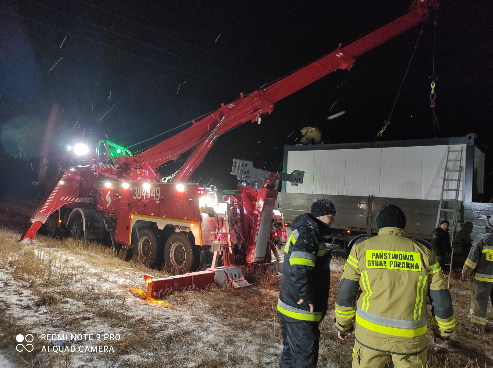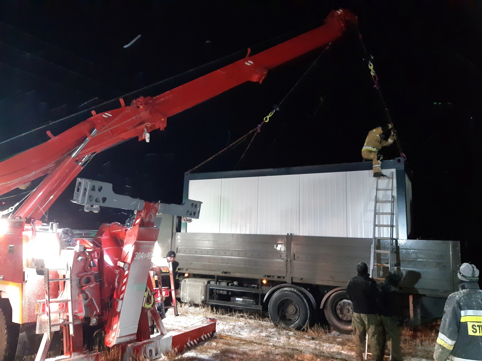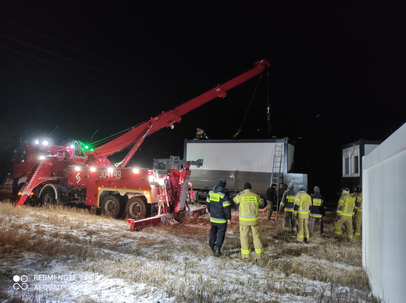 We wtorek 21 grudnia 2021 r. strażacy powiatu sokólskiego wspierali działania innych służb mundurowych w zakresie rozładunku kontenerów mieszkalnych z samochodów ciężarowych. Zadanie zrealizowali przy pomocy samochodu specjalnego ratownictwa technicznego z jednostki ratowniczo - gaśniczej (JRG) nr 4 w Białymstoku.