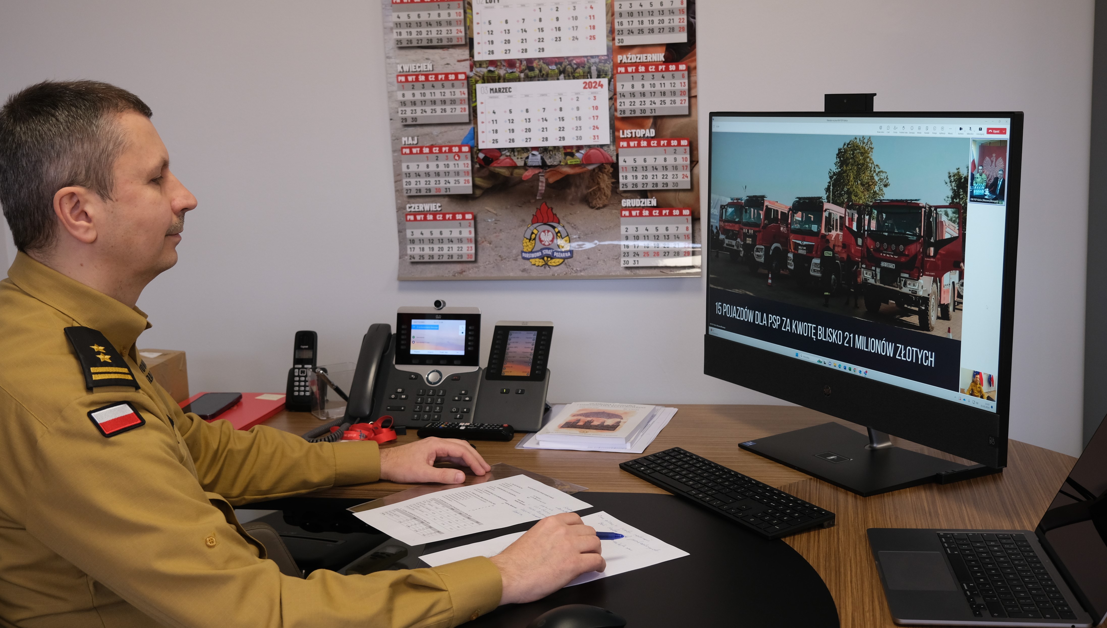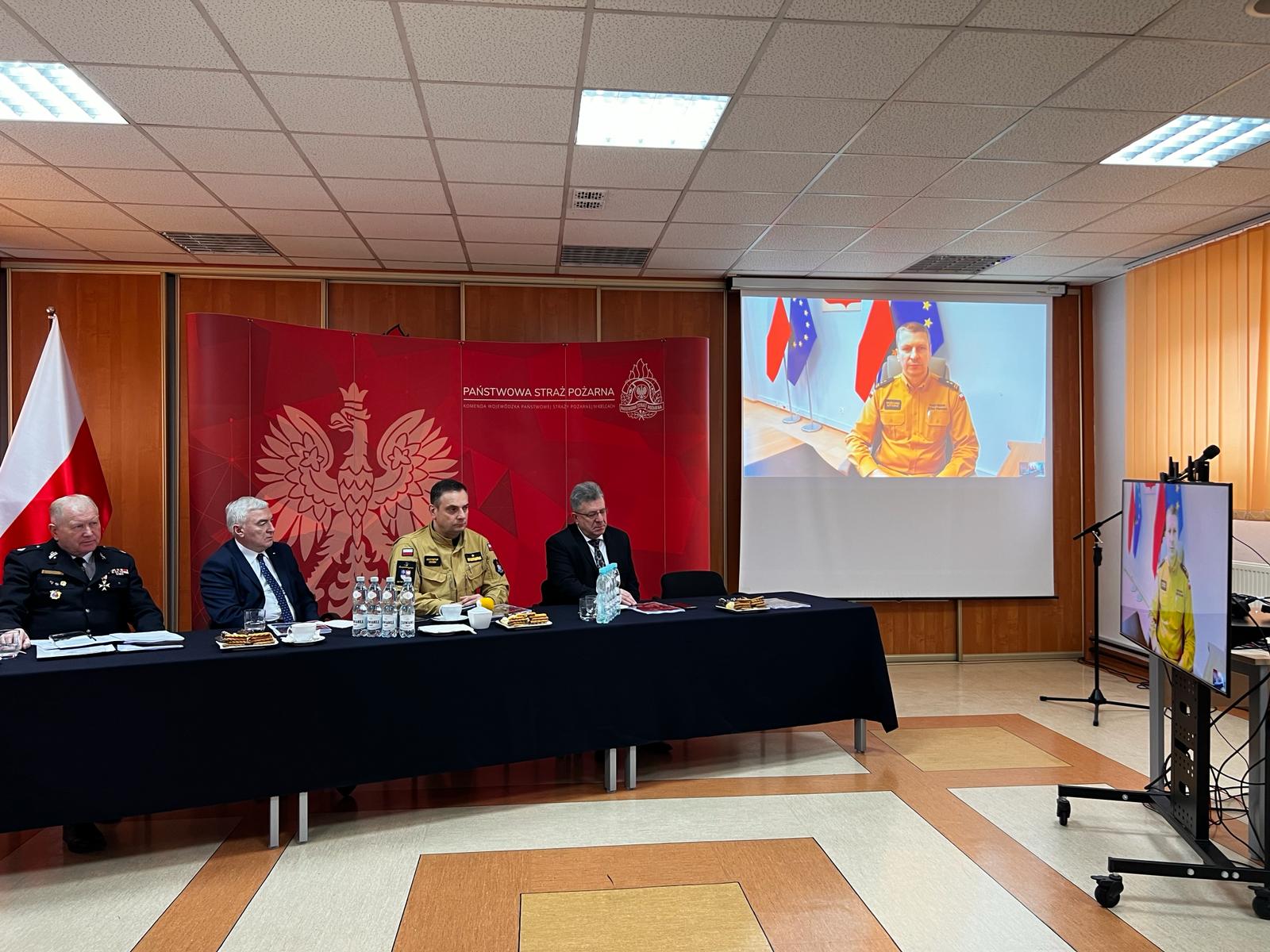 W trybie wideokonferencji, połączył się ze strażakami bryg. dr inż. Grzegorz Szyszko zastępca komendanta głównego PSP, który skierował słowa podziękowania do wszystkich świętokrzyskich strażaków za codzienne, profesjonalne zaangażowanie w realizację zadań służbowych oraz rozwój ochrony przeciwpożarowej.