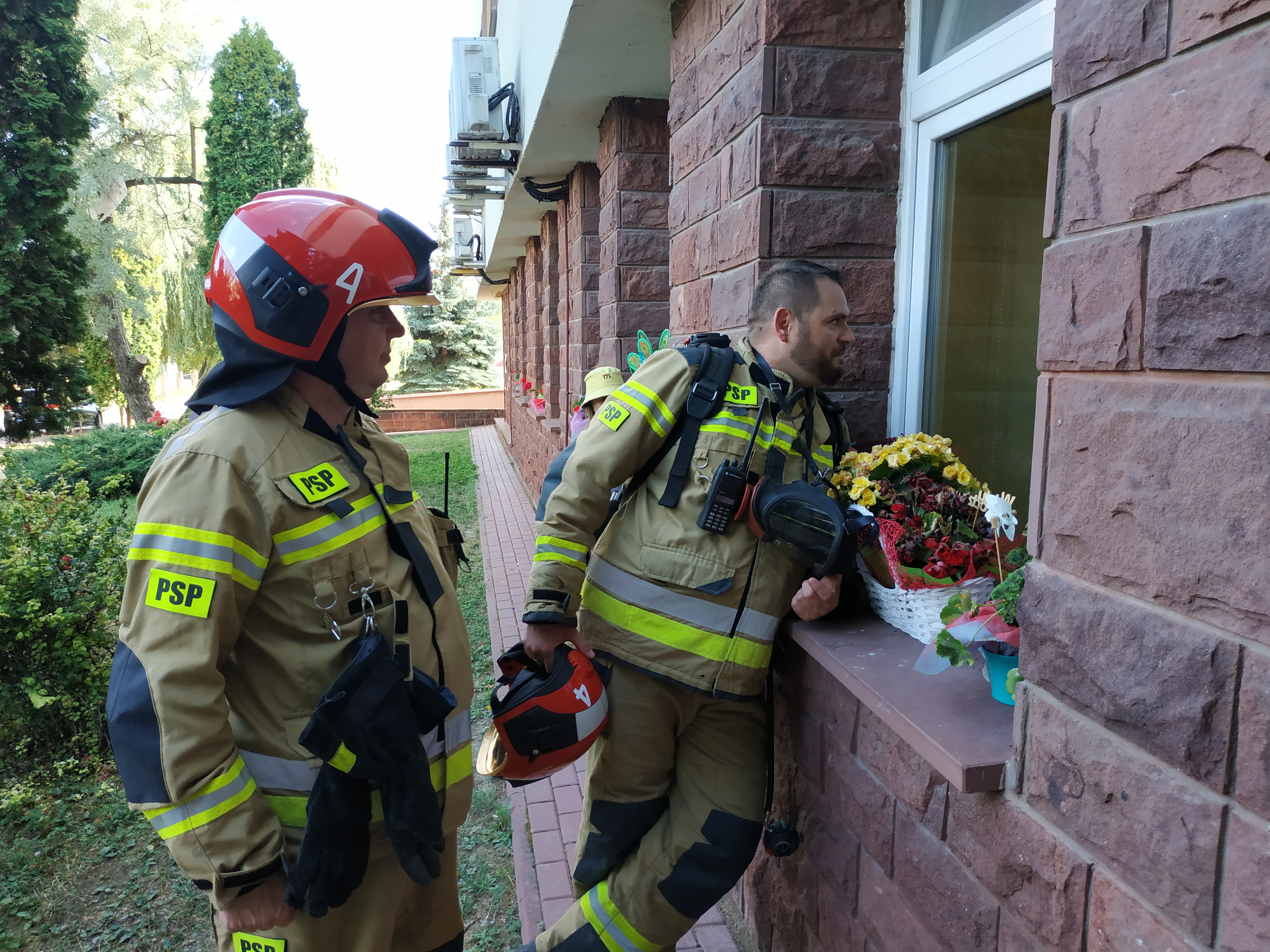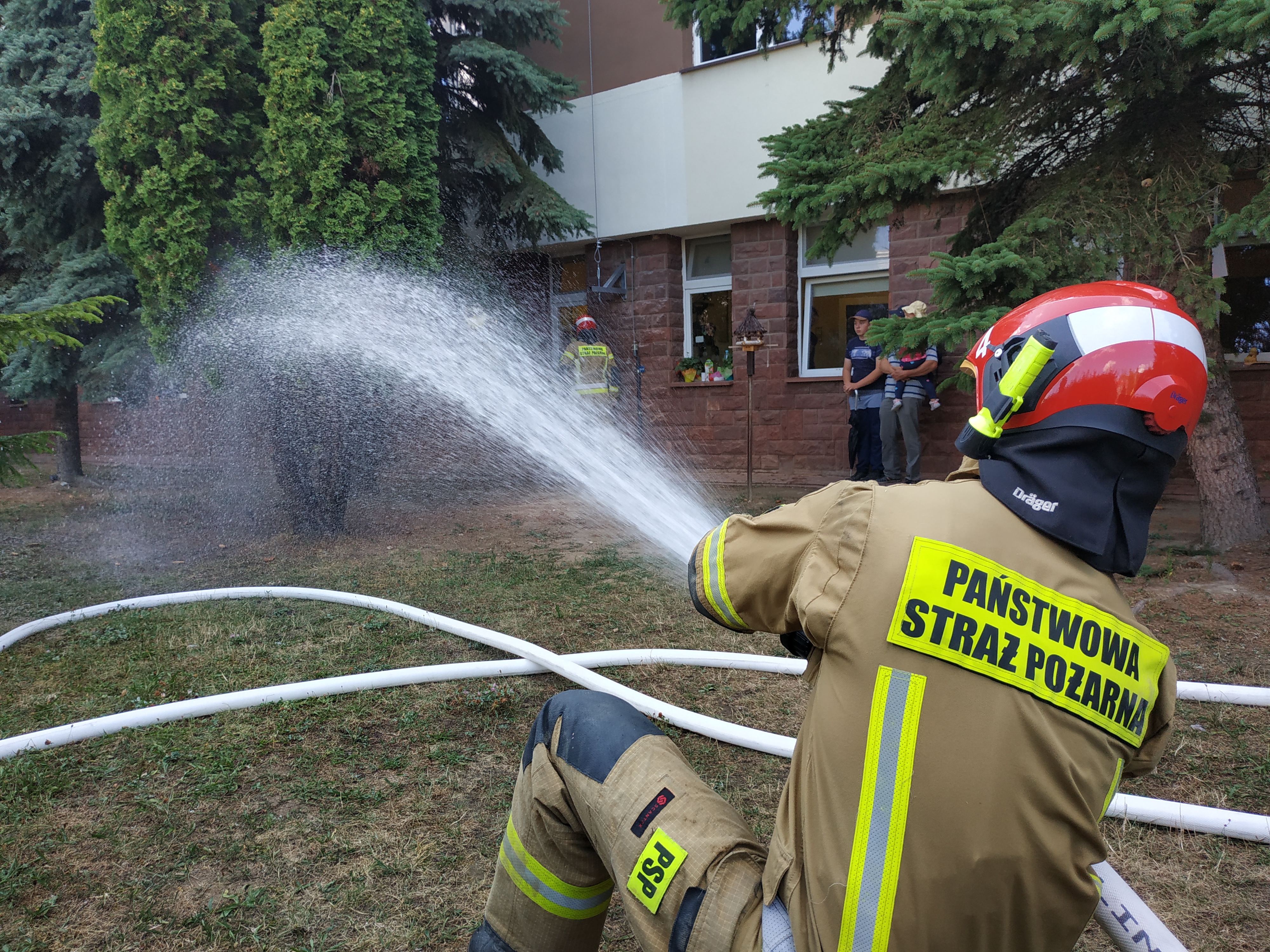 Strażacy przyjechali samochodem ratowniczo-gaśniczym oraz drabiną pod okna szpitala, w których z niecierpliwością czekały już pełne emocji dzieci. Rozstawili i wyjechali drabiną na wyższe piętra, zmontowali linię gaśniczą pokazując dzieciom jak się gasi pożary. Ubrali się w pełne wyposażenie strażaka włącznie z założeniem aparatu ochrony dróg oddechowych, otworzyli skrytki w pojazdach i pokazali sprzęty mechaniczne.