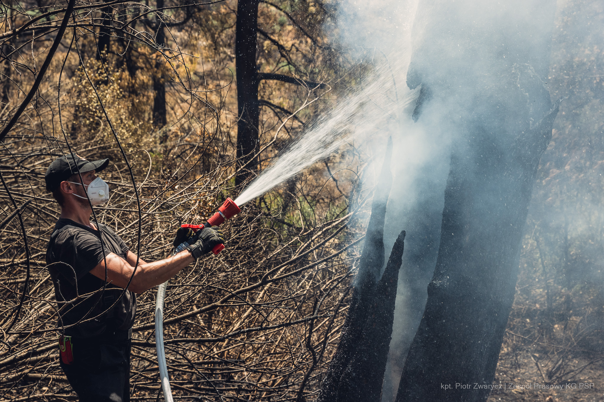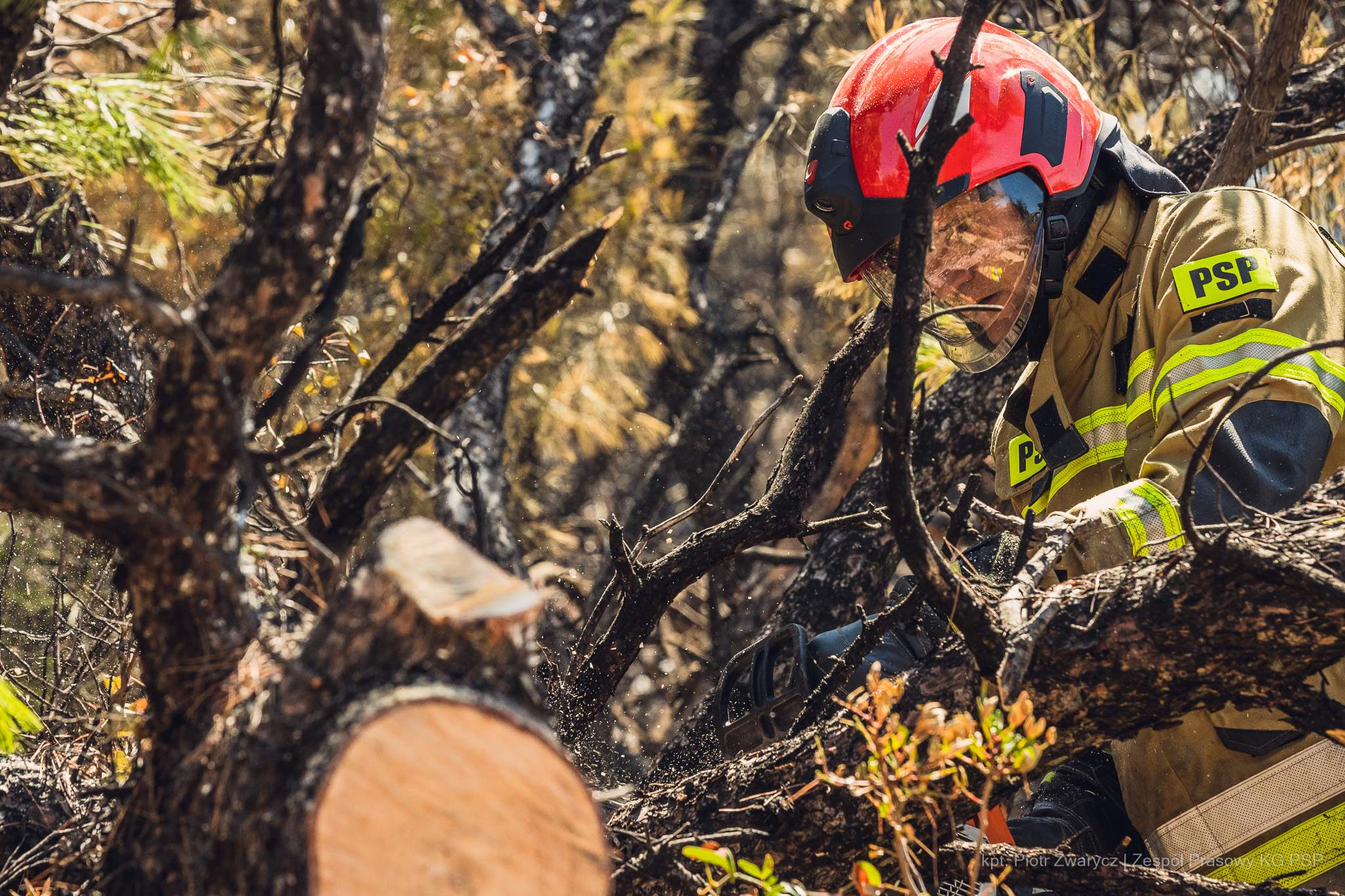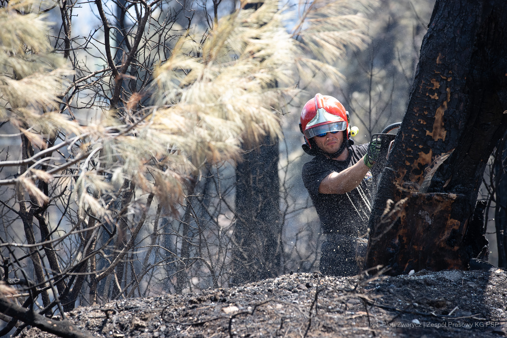 W minioną sobotę plutony gaśnicze modułu GFFFV Poland prowadziły działania równolegle na kilku strefach. Główne zadania polegały na: gaszeniu pojedynczych ognisk pożaru z wykorzystaniem podręcznego sprzętu gaśniczego, pomocy w zapewnieniu zaopatrzenia wodnego dla śmigłowców gaśniczych, nawilżaniu ściółki leśnej oraz poszerzeniu pasa przeciwpożarowego.