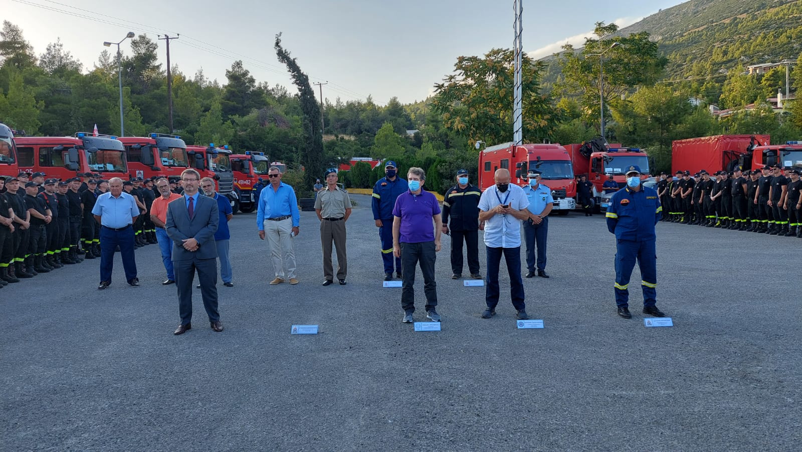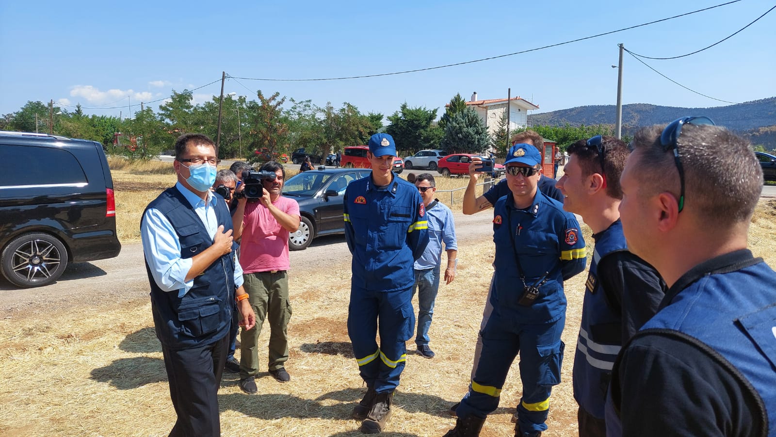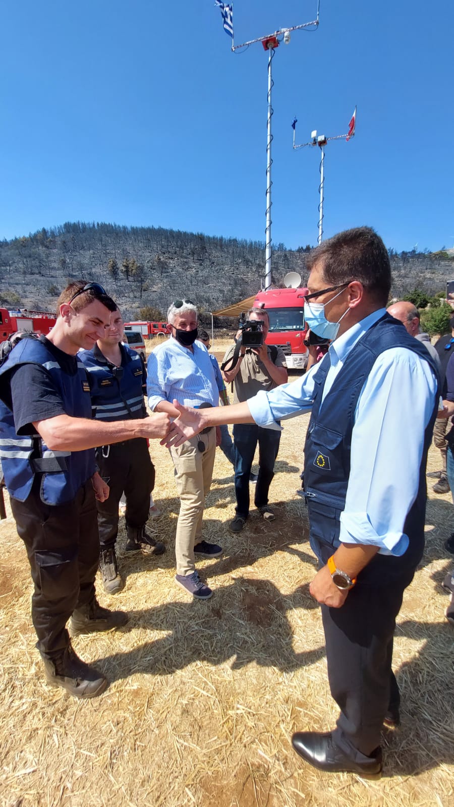 Dzisiaj bazę operacji grupy GFFFV Poland odwiedził komendant główny greckiej straży pożarnej. Lieutenant General Stefanos Kolokouris wyraził uznanie dla polskich strażaków, którzy w jego opinii, swoją determinacją i zaangażowaniem uratowali miejscowość Vilia przed pożarem nacierającym z dużą intensywnością. W trakcie wizyty komendant zapoznał się z organizacją sztabu i obozowiska. Wizyta zakończyła się symboliczną wymianą emblematów obu formacji.