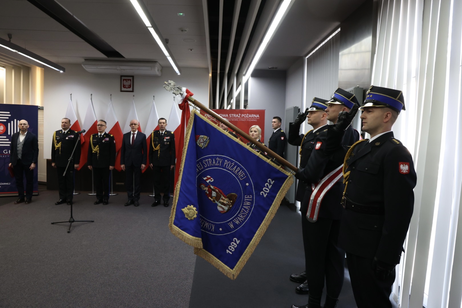 W uroczystej zbiórce uczestniczyli również: zastępcy komendanta głównego PSP, dyrektorzy biur KG PSP, funkcjonariusze i pracownicy Komendy Głównej PSP.