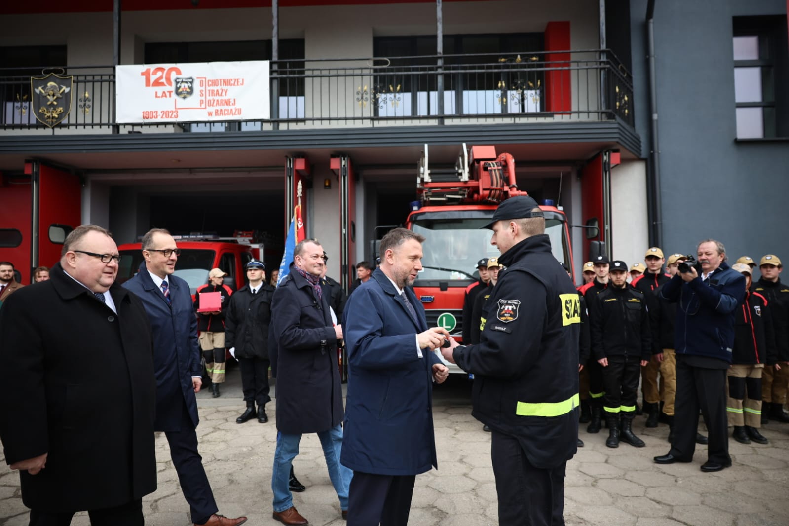 Podczas uroczystości na ręce kierowcy Ochotniczej Straży Pożarnej w Raciążu druha Jakuba Kornackiego, przekazane zostały kluczyki i dokumenty do nowego samochodu pożarniczego, który będzie wykorzystywany podczas działań oraz do transportu ratowników i sprzętu ratowniczego, a ponadto, wejdzie w skład Wojewódzkiego Odwodu Operacyjnego Kompanii Powodziowej „Płońsk”.