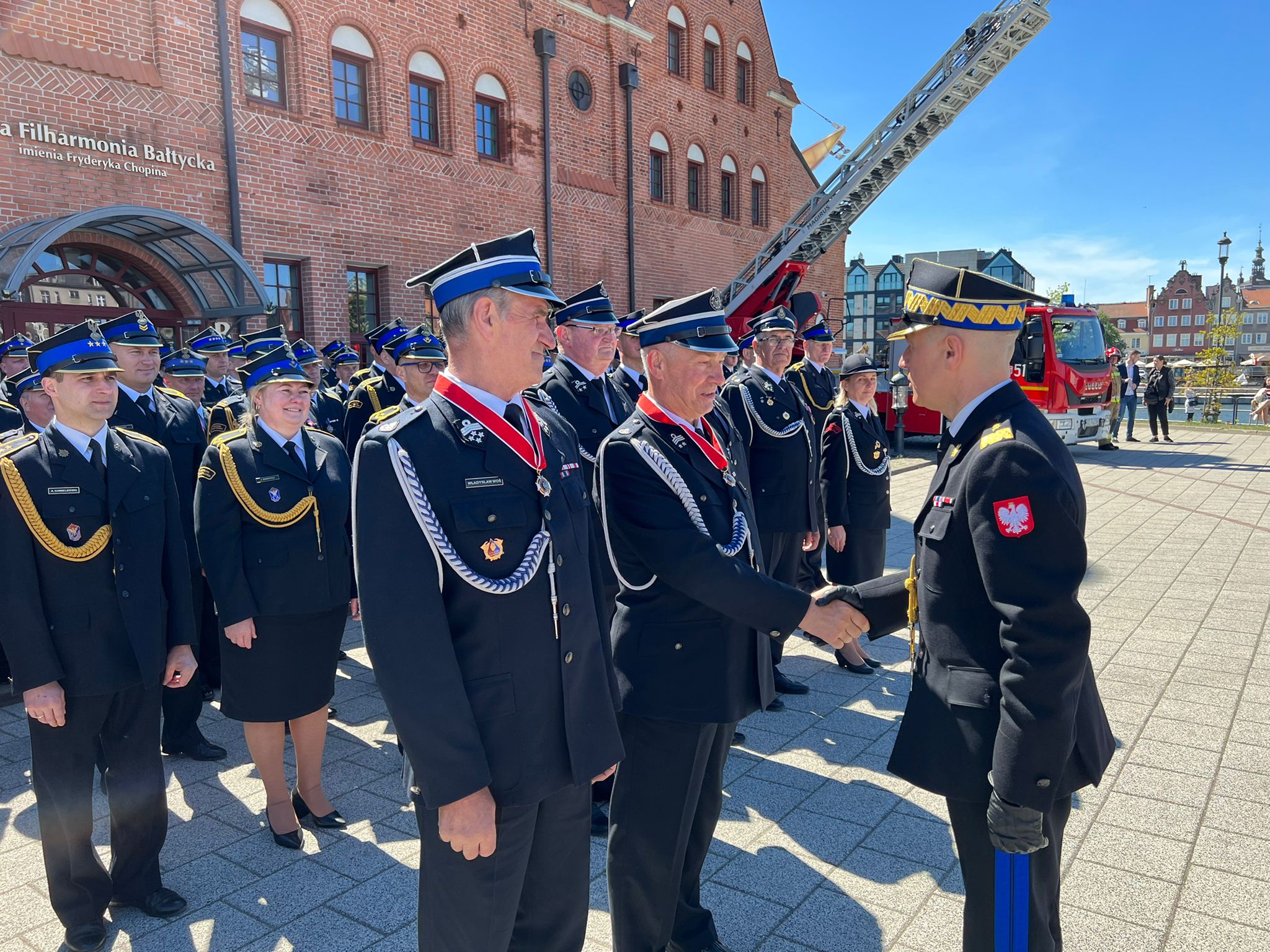 Wręczenia aktu przekazania pojazdu pożarniczego oraz symbolicznego przekazania kluczyków, komendantowi miejskiemu Państwowej Straży Pożarnej bryg. Marcinowi Nowakowi, dokonali: komendant główny Państwowej Straży Pożarnej gen. brygadier Andrzej Bartkowiak oraz wojewoda pomorski Pan Dariusz Drelich w asyście pomorskiego komendanta wojewódzkiego nadbryg. Piotra Sochy.
