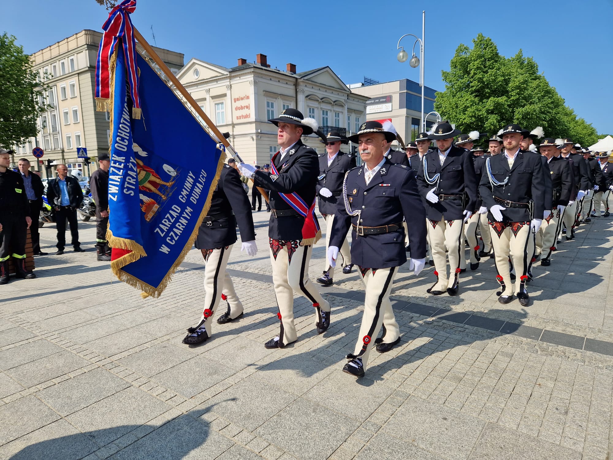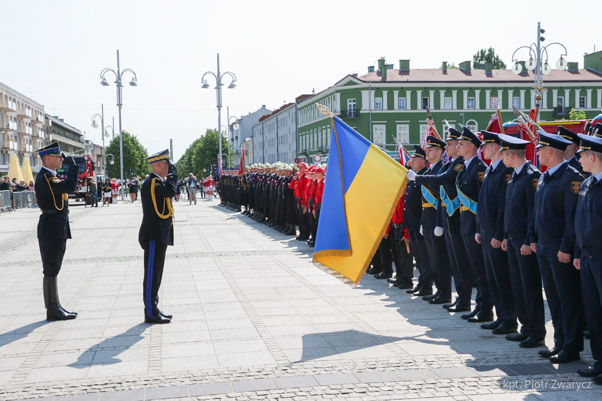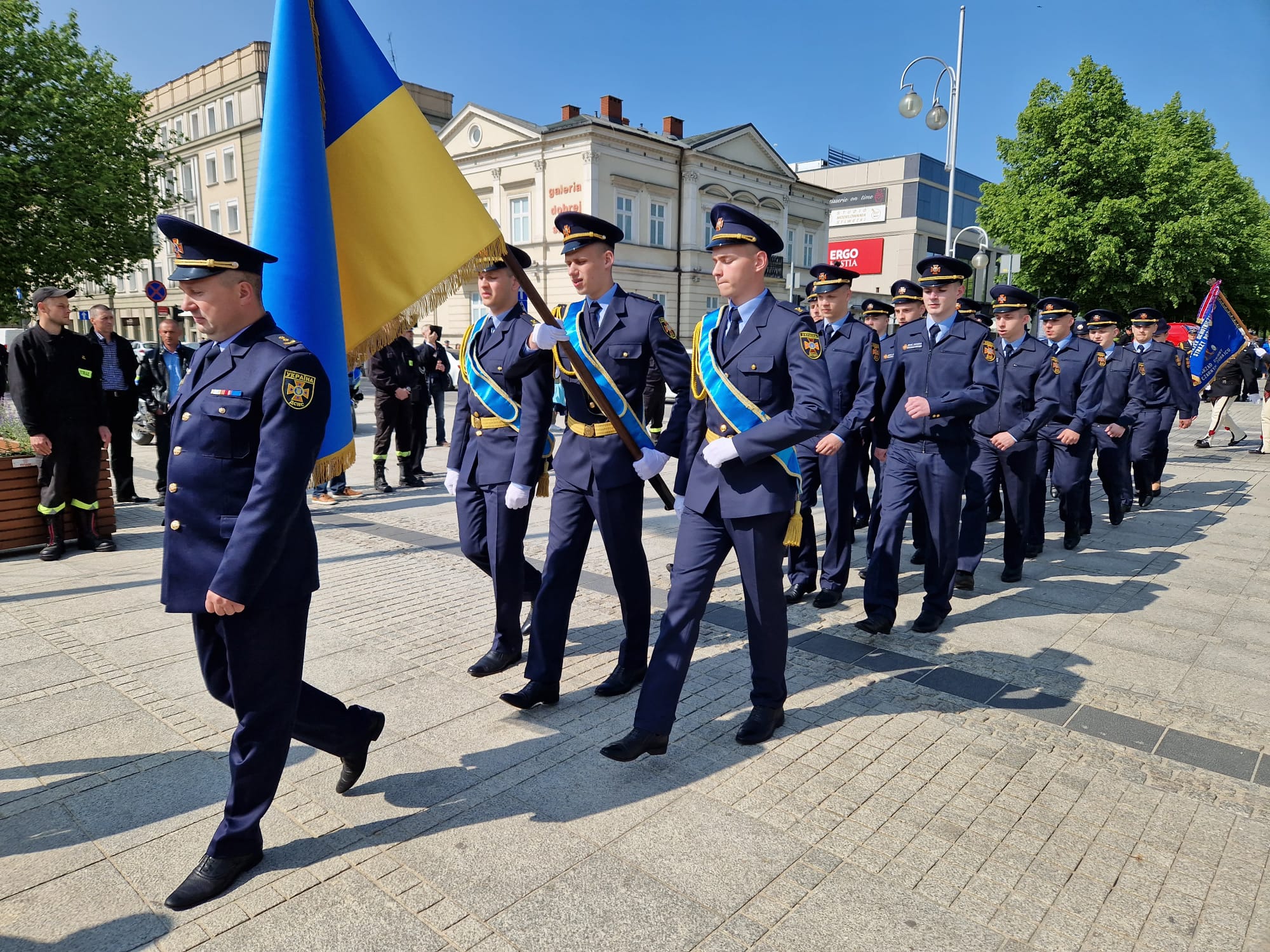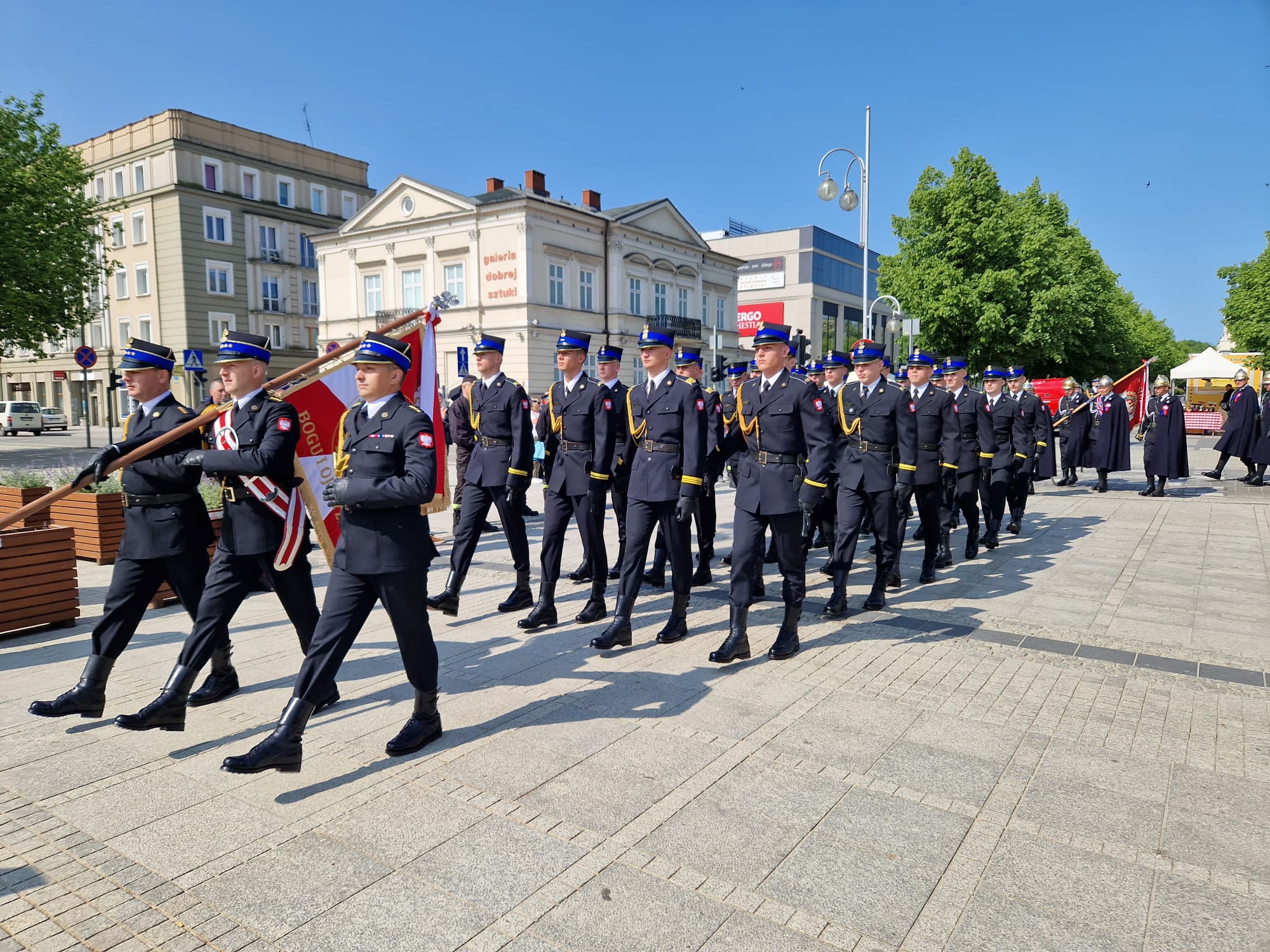 Na Placu Biegańskiego w rytm orkiestry OSP Mykanów pojawiły się Kompania Reprezentacyjna Państwowej Straży Pożarnej, Kompania Reprezentacyjna Związku Ochotniczych Straży Pożarnych RP, kompania Młodzieżowej Drużyny Pożarniczej oraz kompania strażaków z Ukrainy.