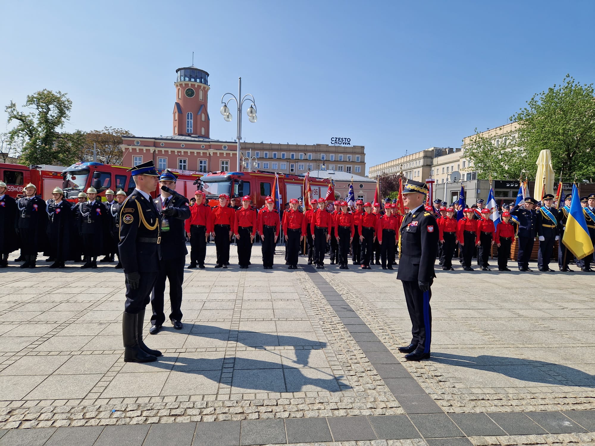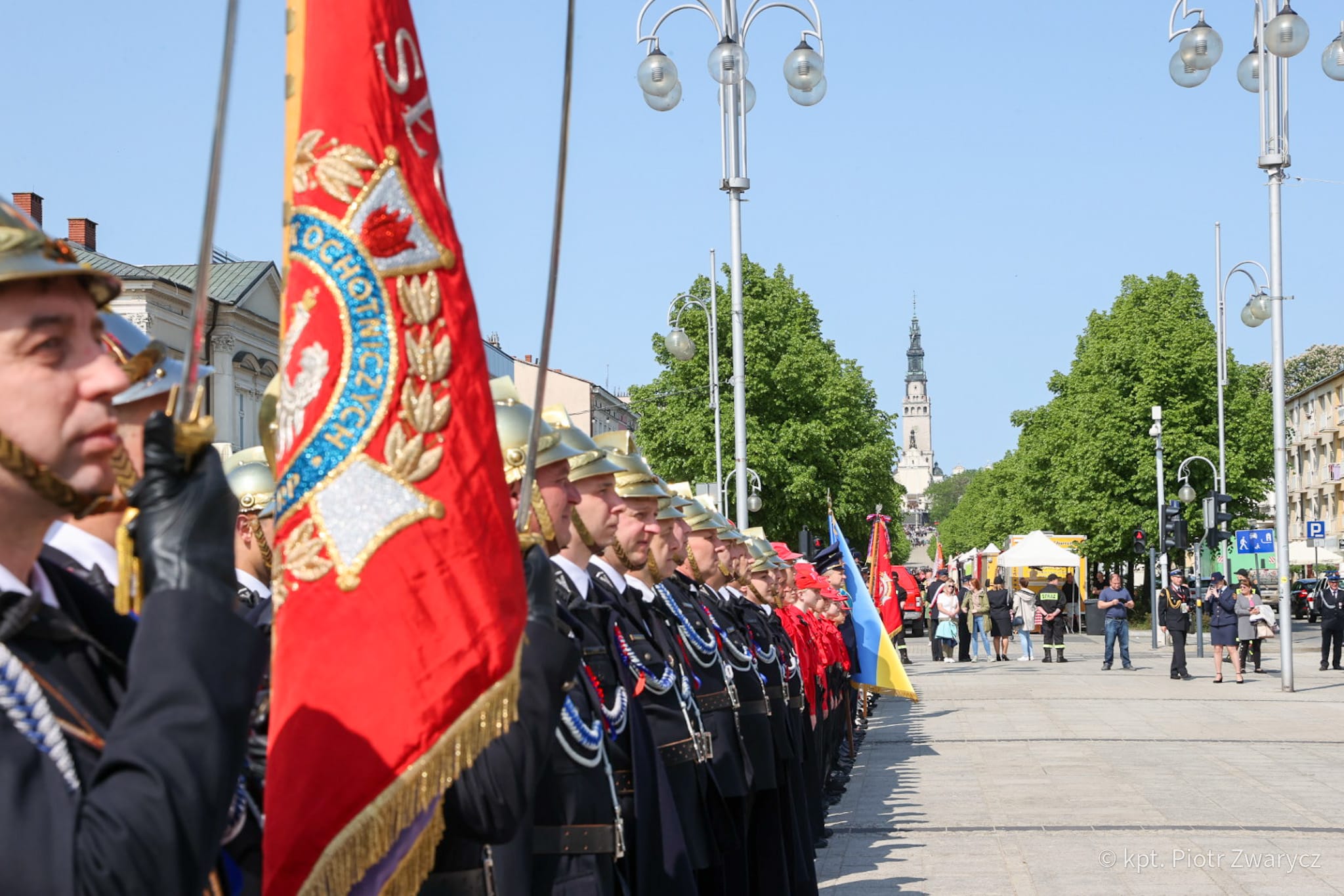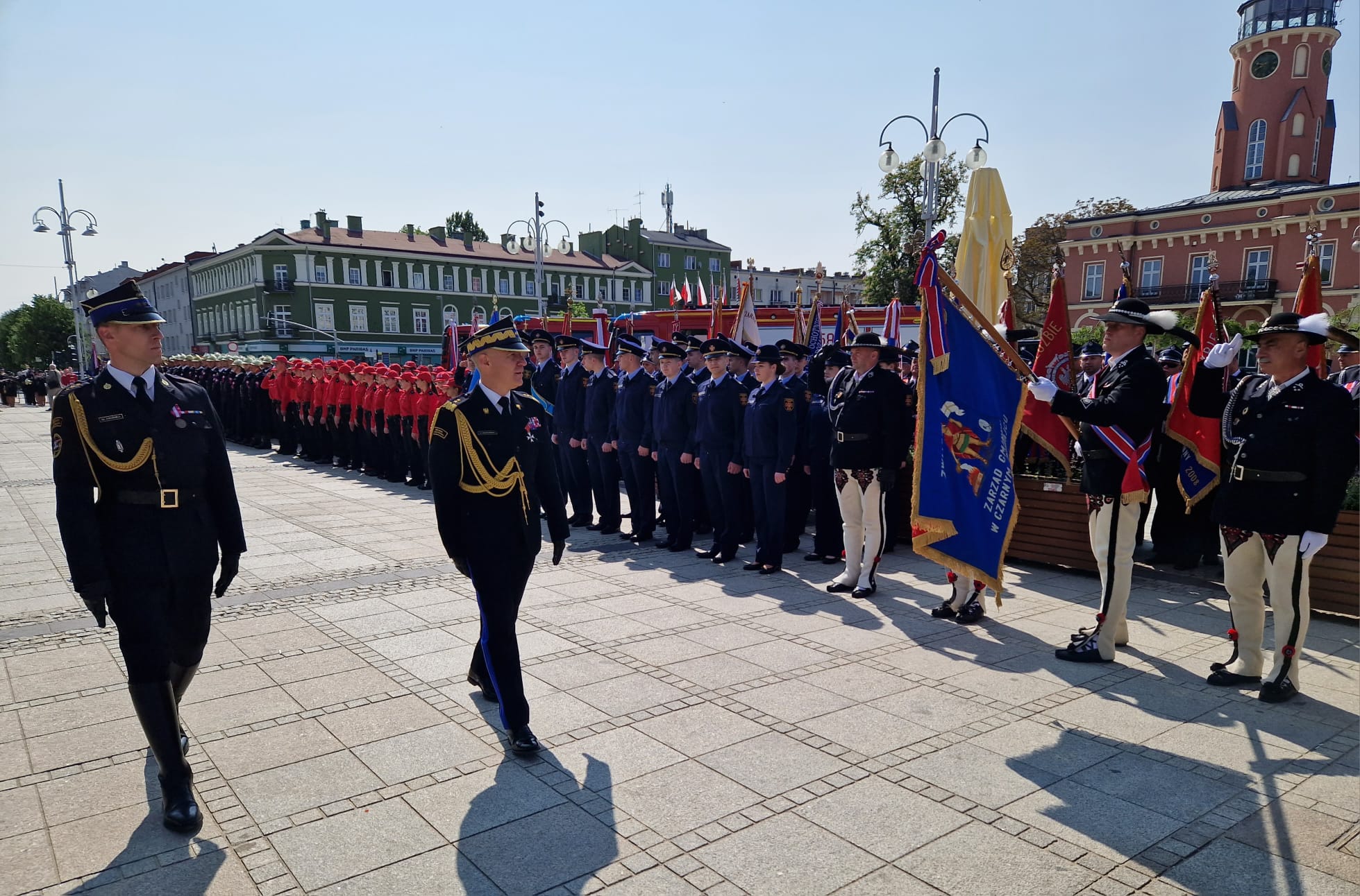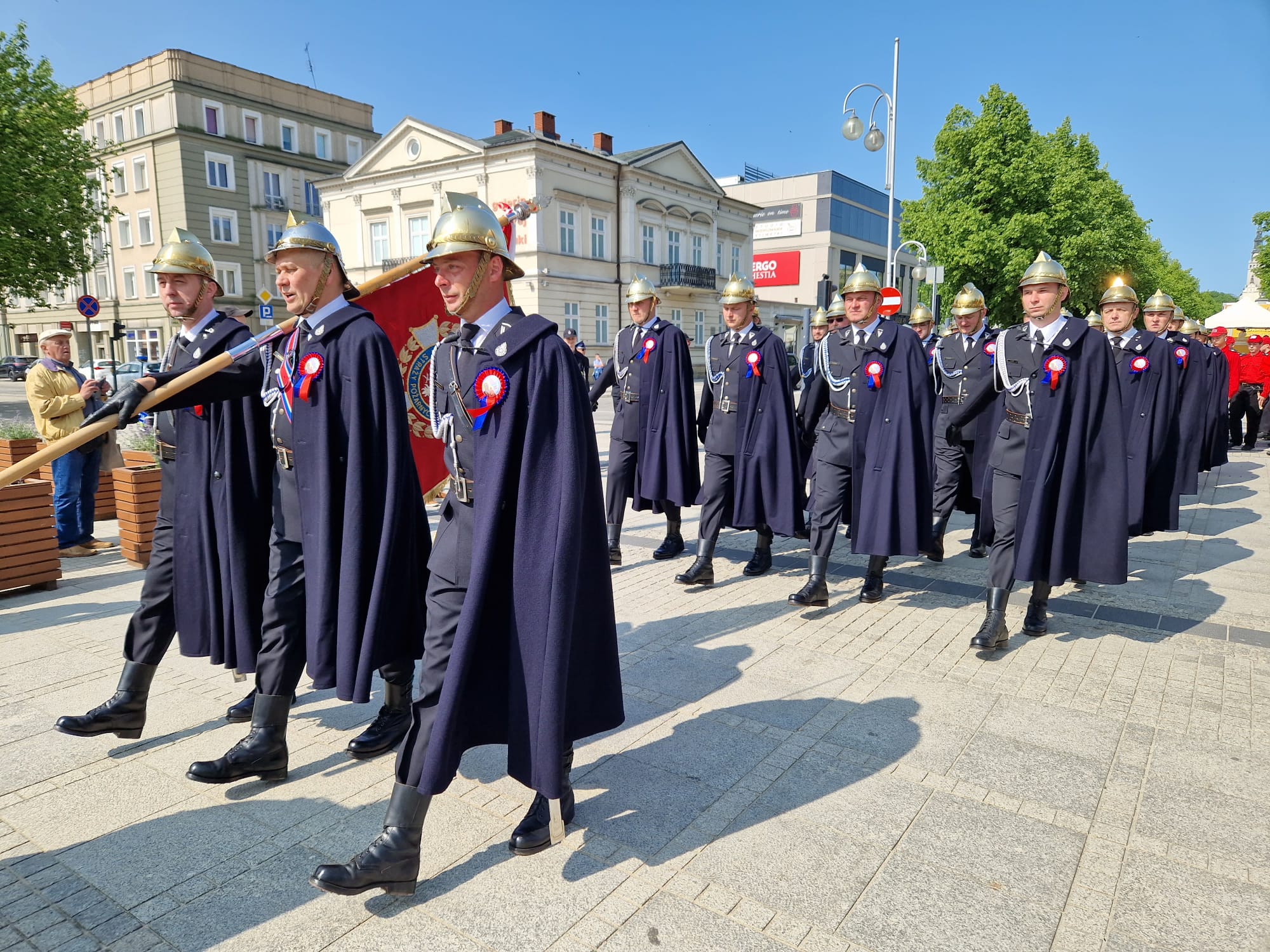 Na Placu Biegańskiego w rytm orkiestry OSP Mykanów pojawiły się Kompania Reprezentacyjna Państwowej Straży Pożarnej, Kompania Reprezentacyjna Związku Ochotniczych Straży Pożarnych RP, kompania Młodzieżowej Drużyny Pożarniczej oraz kompania strażaków z Ukrainy.