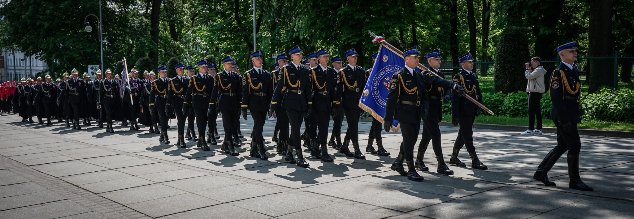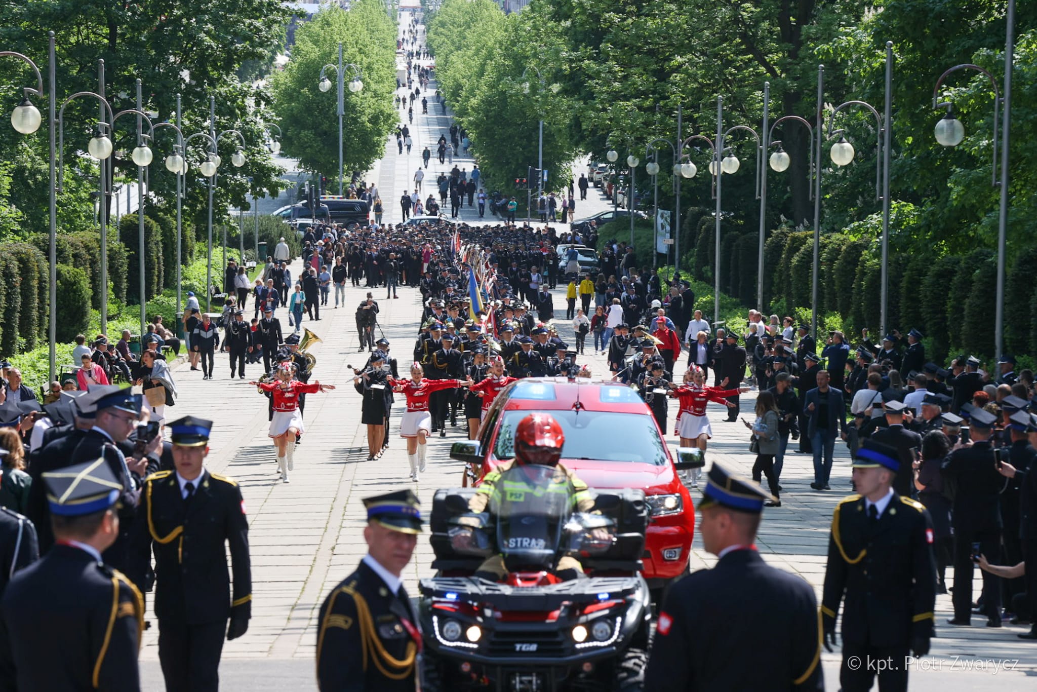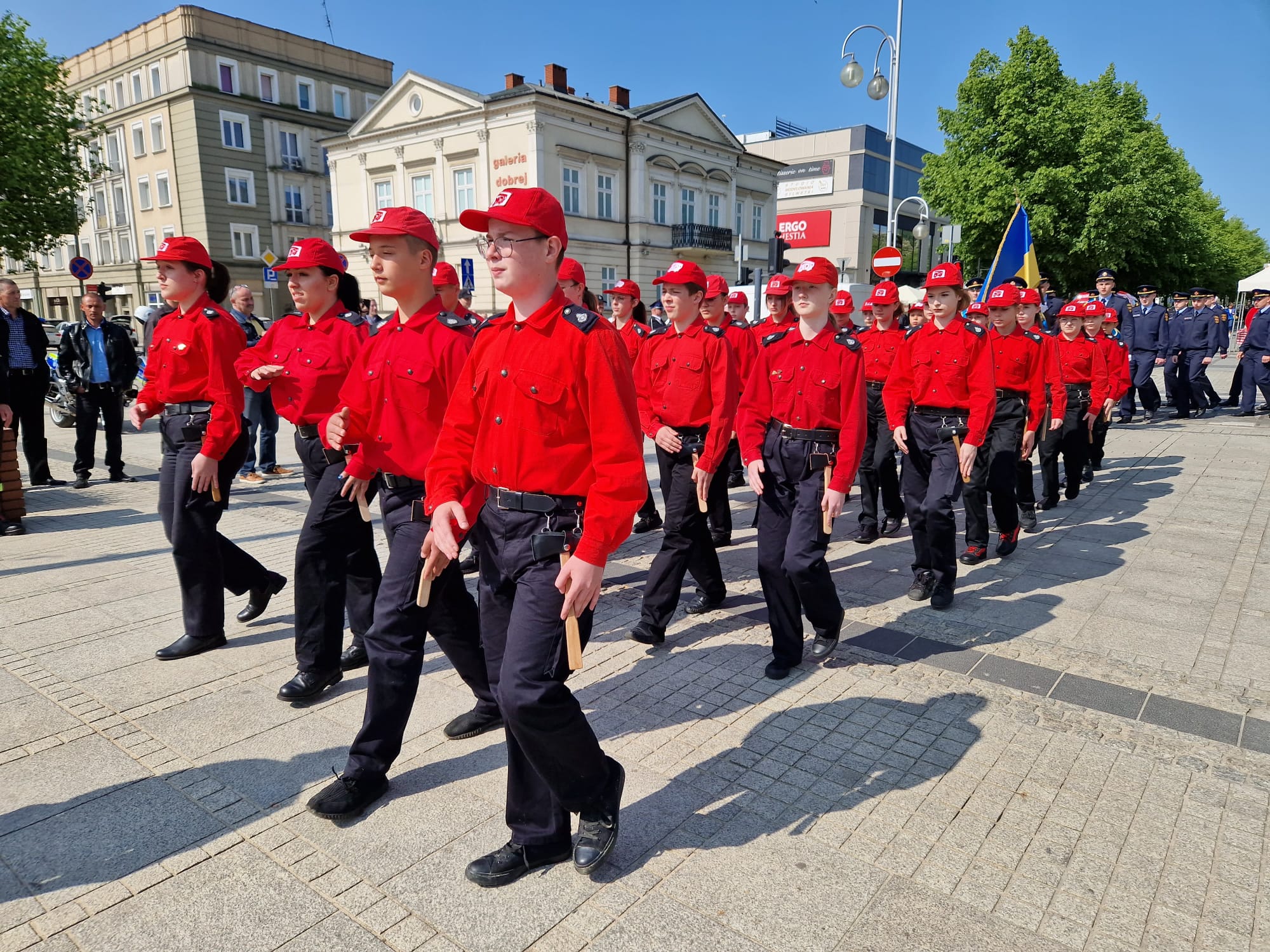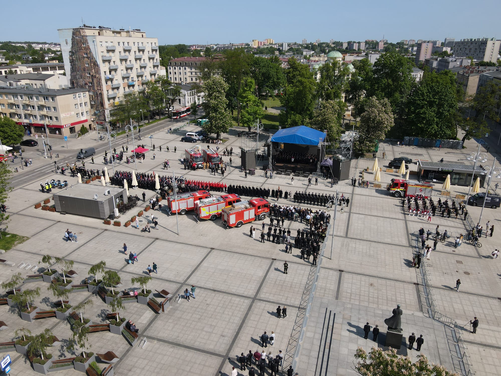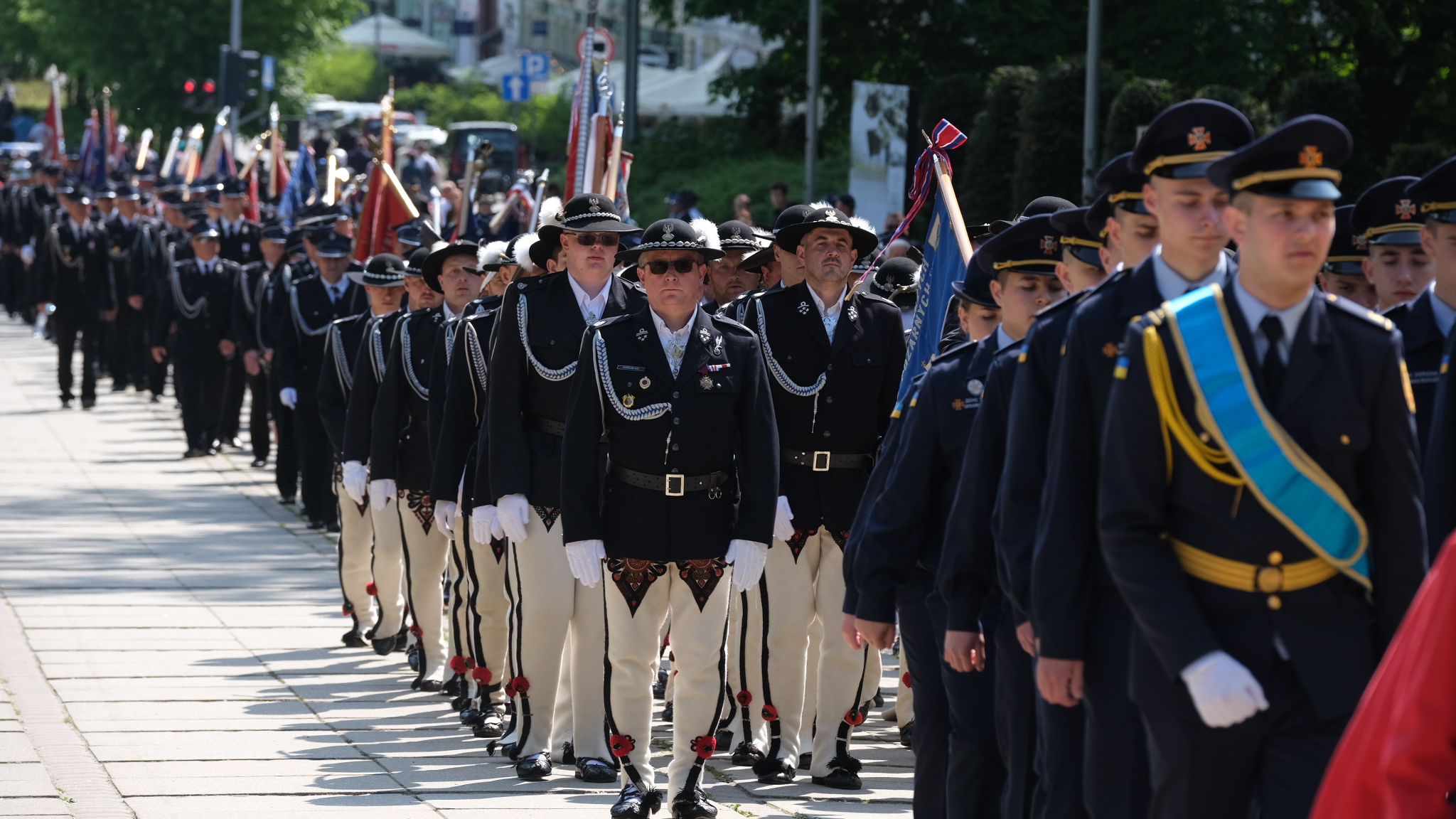 Na Placu Biegańskiego w rytm orkiestry OSP Mykanów pojawiły się Kompania Reprezentacyjna Państwowej Straży Pożarnej, Kompania Reprezentacyjna Związku Ochotniczych Straży Pożarnych RP, kompania Młodzieżowej Drużyny Pożarniczej oraz kompania strażaków z Ukrainy.