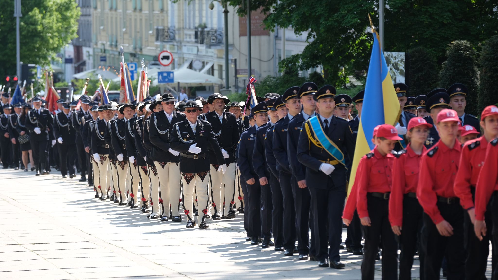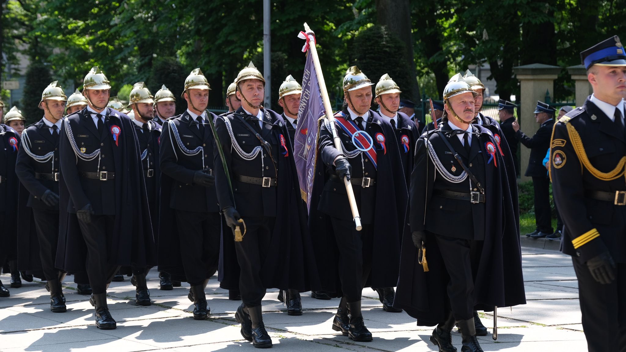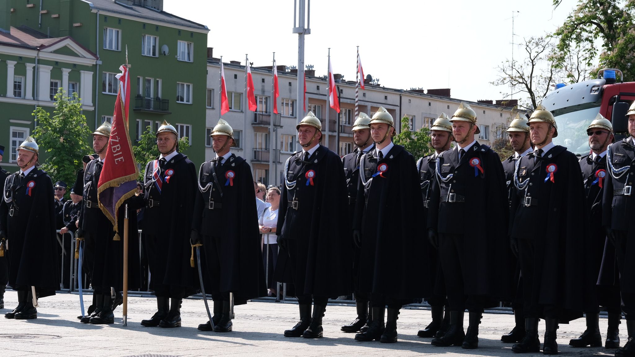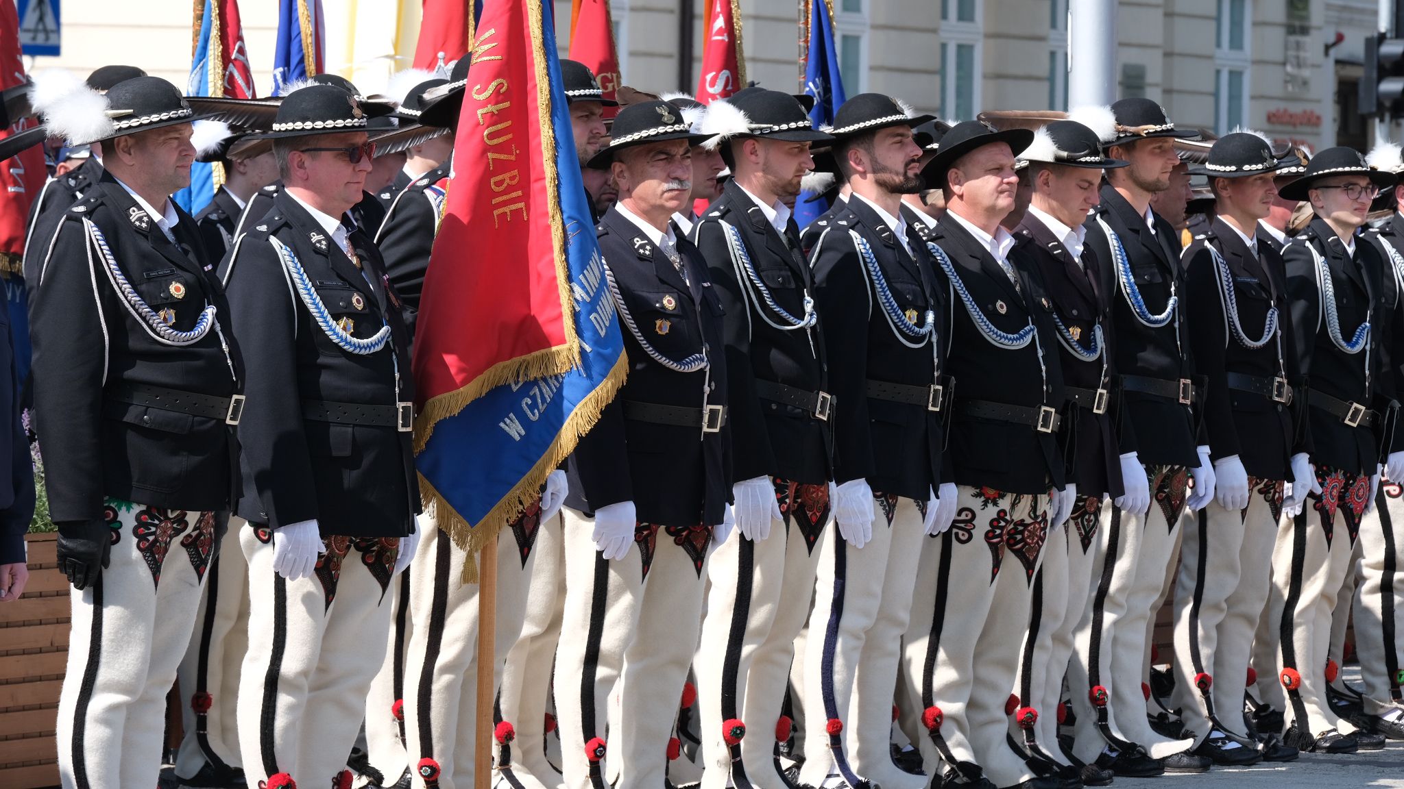 Na Placu Biegańskiego w rytm orkiestry OSP Mykanów pojawiły się Kompania Reprezentacyjna Państwowej Straży Pożarnej, Kompania Reprezentacyjna Związku Ochotniczych Straży Pożarnych RP, kompania Młodzieżowej Drużyny Pożarniczej oraz kompania strażaków z Ukrainy.
