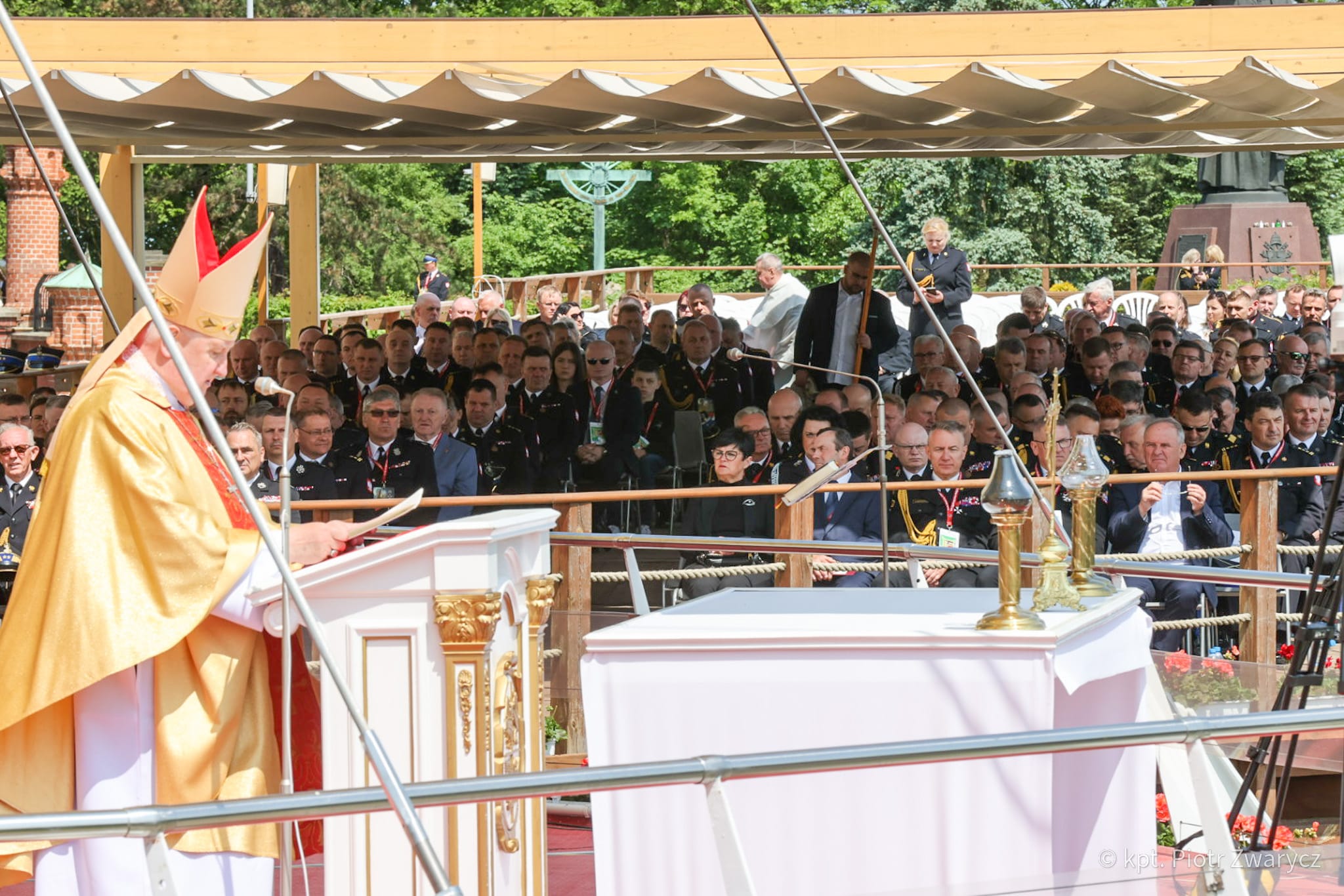 O godzinie 11.00 dzwony oraz hejnał z Wieży Jasnogórskiej oznajmiły rozpoczęcie Mszy Świętej w intencji wszystkich strażaków, którzy przybyli do Matki Bożej Częstochowskiej wraz ze swoimi rodzinami. Zaproszonych gości przywitał przeor Klasztoru OO. Paulinów na Jasnej Górze o. Samuel Pacholski. Mszy świętej przewodniczył i homilię wygłosił bp Romuald Kamiński. W przebieg Eucharystii zaangażowani byli strażacy PSP , OSP a także nie mogło zabraknąć przedstawicieli Młodzieżowych Drużyn Pożarniczych.