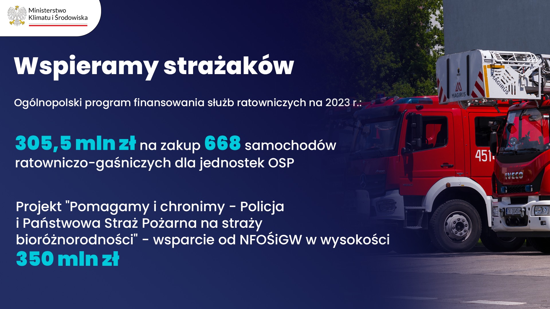 „Od 2016 roku systematycznie dofinansowujemy zakup niezbędnego sprzętu i wyposażenia jednostek OSP. Jest to przede wszystkim zakup lekkich, średnich i ciężkich samochodów ratowniczo-gaśniczych. Dotychczas dofinansowaliśmy zakup blisko 3 tys. wozów strażackich dla jednostek OSP w całej Polsce. W 2023 roku, w ramach Ogólnopolskiego Programu Finansowania Służb Ratowniczych, dofinansujemy zakup samochodów ratowniczo-gaśniczych dla 668 jednostek OSP za kwotę 305,5 mln zł." – podkreśliła Pani minister Anna Moskwa.