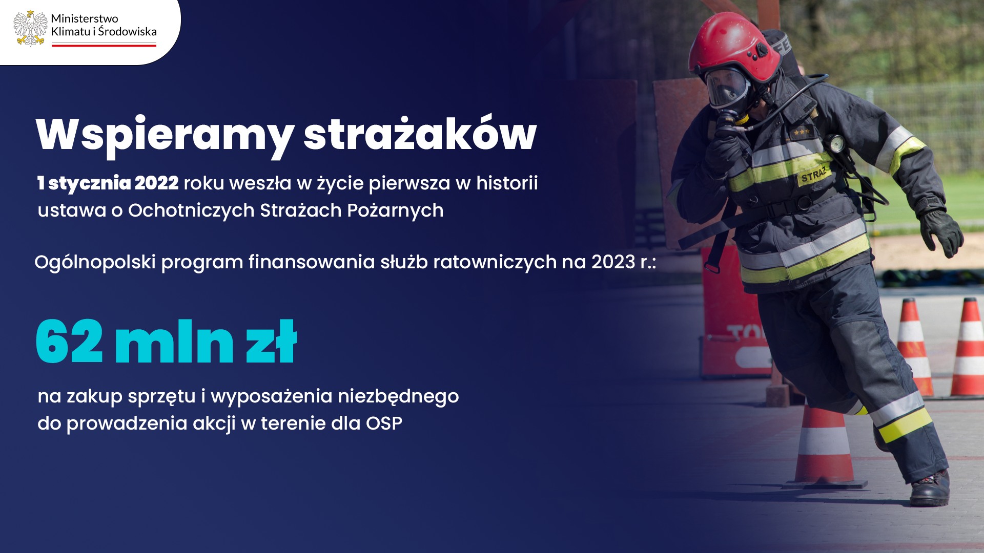 Przeznaczyliśmy na to ponad 62 mln zł, co pozwoli dofinansować ponad 3300 jednostek OSP w całym kraju. Nabory wniosków zostały uruchomione w każdym województwie i już teraz można składać wnioski – powiedziała Pani minister, która zwróciła także uwagę, że dzięki dotacjom z WFOŚiGW, które pokrywają 100% kosztów zakupu, OSP mogą uzupełnić niedobory w swoich magazynach.