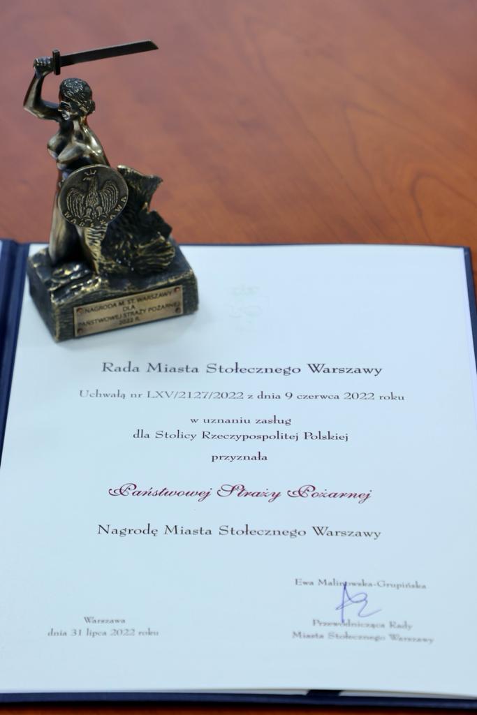 Wyróżnienie to przyznawane jest przez Radę m. st. Warszawy, osobom lub zespołom osób szczególnie zasłużonym dla Warszawy. W 2022 r. uhonorowanych zostało 36 osób oraz 15 organizacji, wśród których znalazła się również Państwowa Straż Pożarna.
