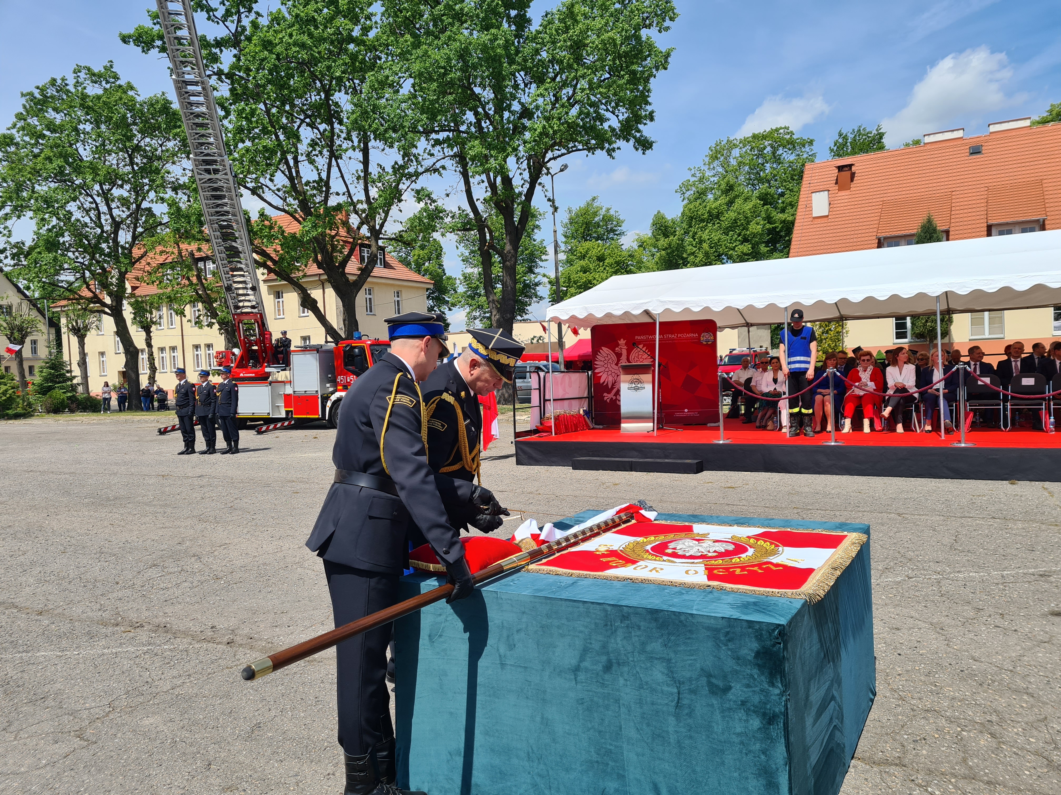 Kulminacyjnym momentem uroczystości było nadanie sztandaru Komendzie Powiatowej PSP w Pleszewie. Przewodniczący Społecznego Komitetu Honorowego Fundacji Sztandaru starosta pleszewski Maciej Wasielewski, przekazał sztandar nadbrygadierowi Arkadiuszowi Przybyle zastępcy komendanta głównego Państwowej Straży Pożarnej, który w imieniu Ministra Spraw Wewnętrznych i Administracji wręczył Komendantowi Powiatowemu PSP w Pleszewie bryg. Rolandowi Egiertowi. Komendant pleszewskich strażaków przekazał sztandar jednostki na ręce składu pocztu sztandarowego, który zaprezentował nowy sztandar przed frontem pododdziałów straży pożarnych