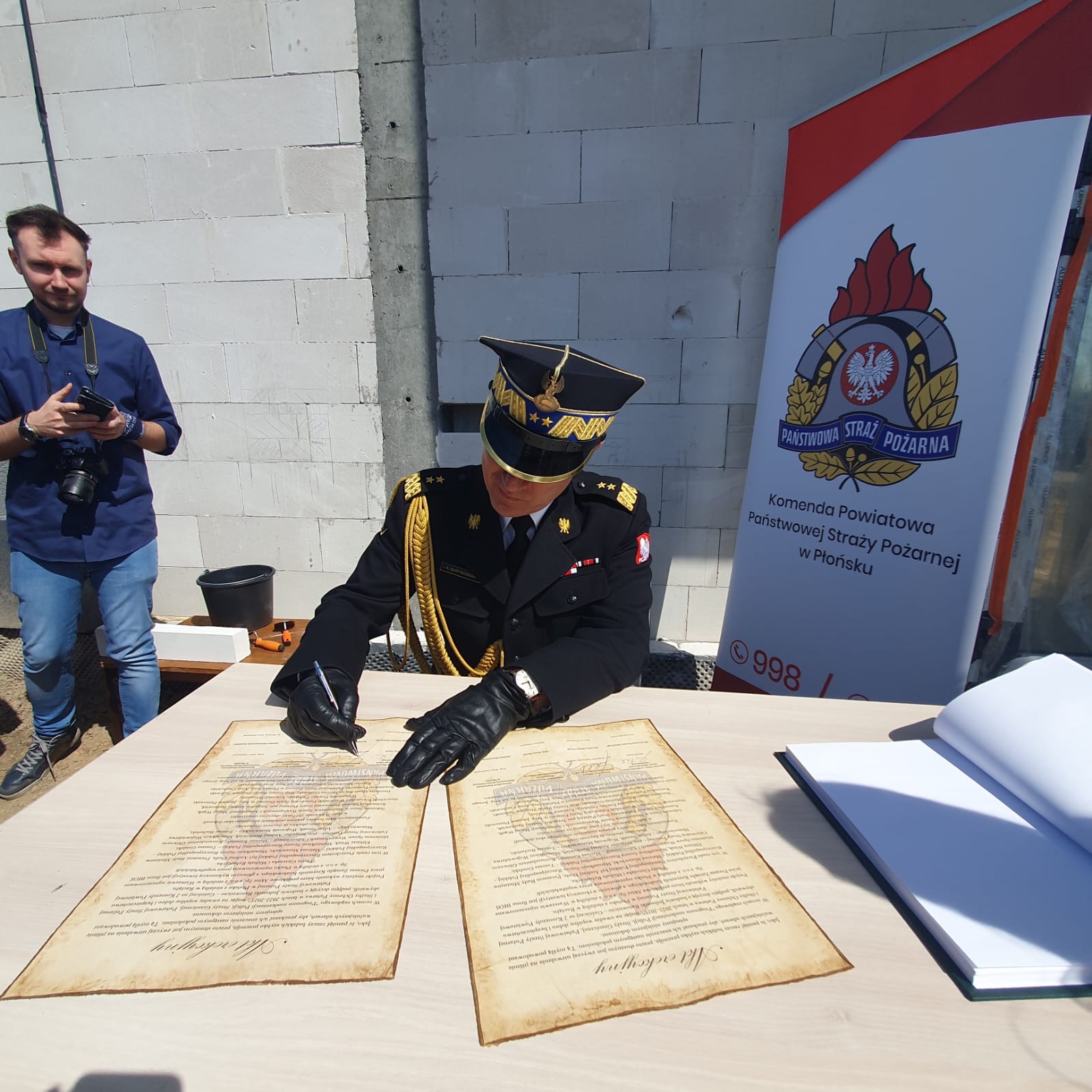 Po otwarciu uroczystości i przywitaniu zaproszonych gości przez bryg. Artura Czachowskiego komendanta powiatowego PSP w Płońsku nastąpiło wmurowanie aktu erekcyjnego w nowo powstającym budynku Jednostki Ratowniczo-Gaśniczej w Raciążu.