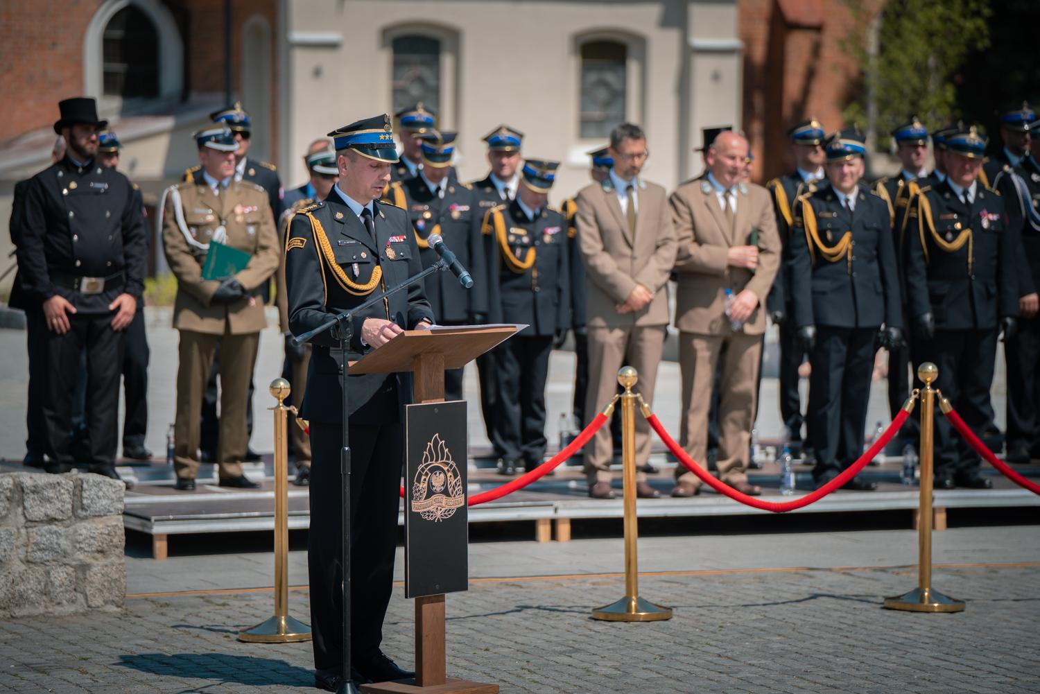 Zastępca komendanta głównego st. bryg. dr inż. Grzegorz Szyszko zwrócił się do uczestników uroczystości w słowach: